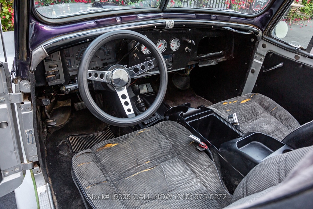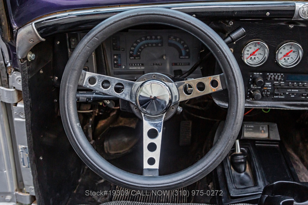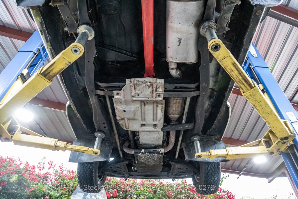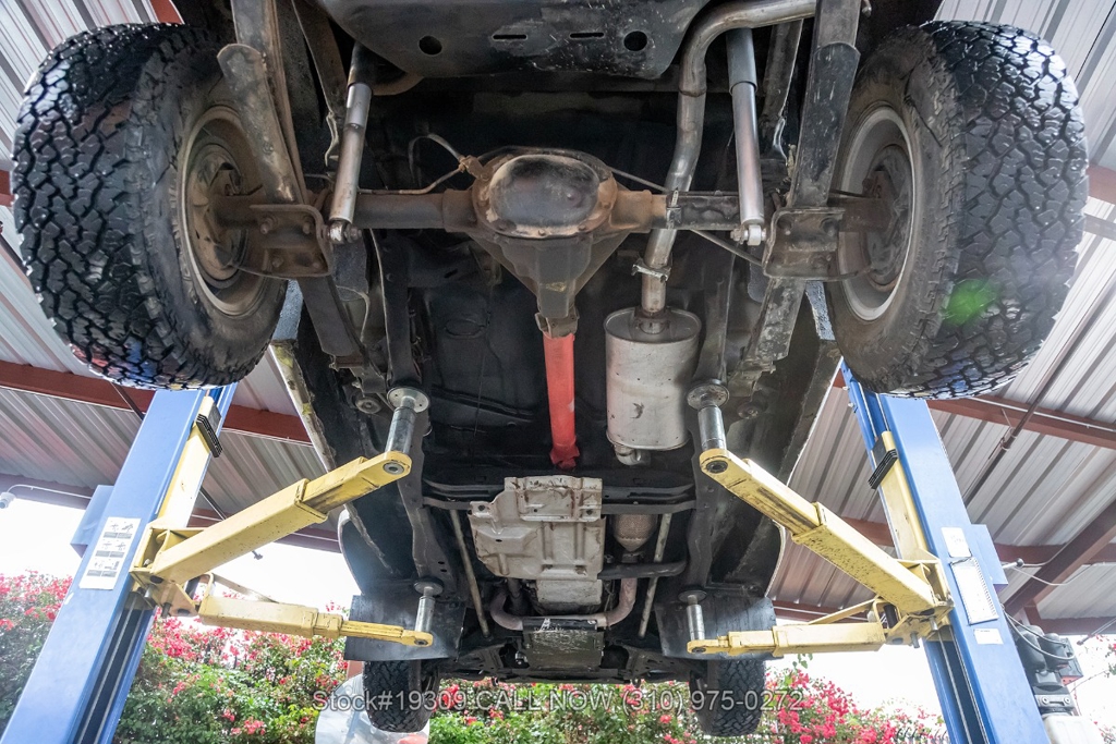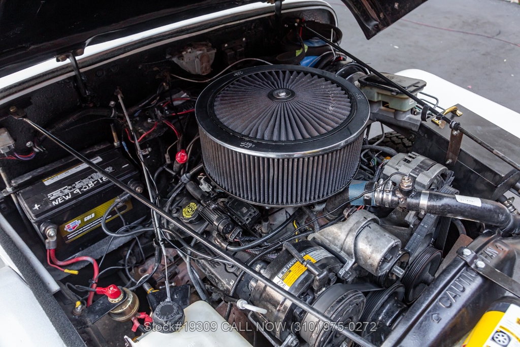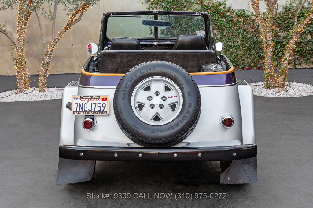 The chassis has been upgraded using S10 truck components, enhancing ride quality, durability, and overall handling. Front disc brakes improve stopping power, while the single exhaust outlet delivers a clean and subtle sound. The Jeepster rides on 15-inch steel wheels wrapped in white-letter General Grabber tires, complementing its classic look.