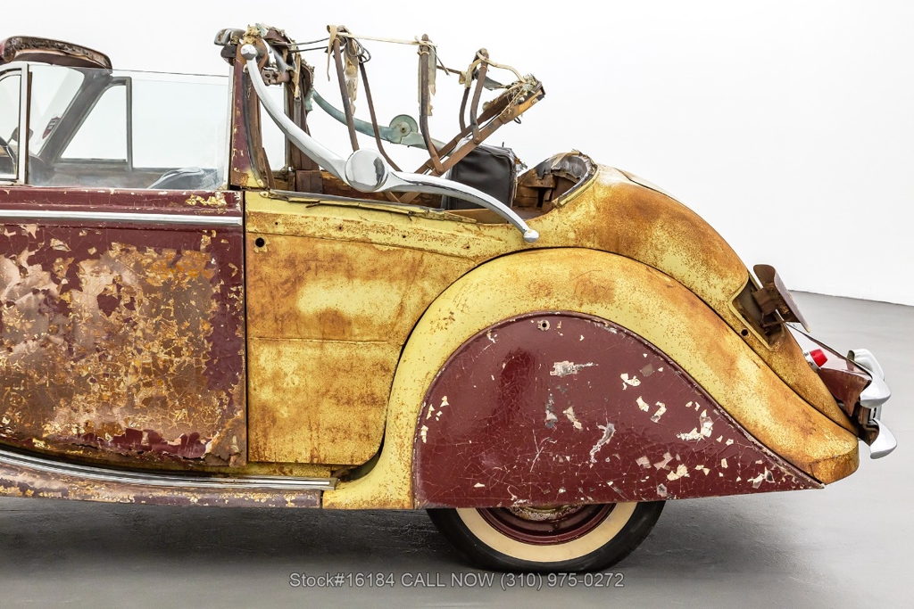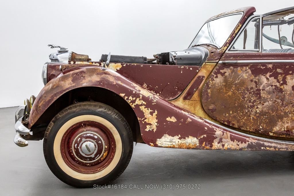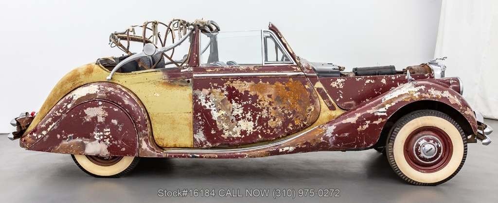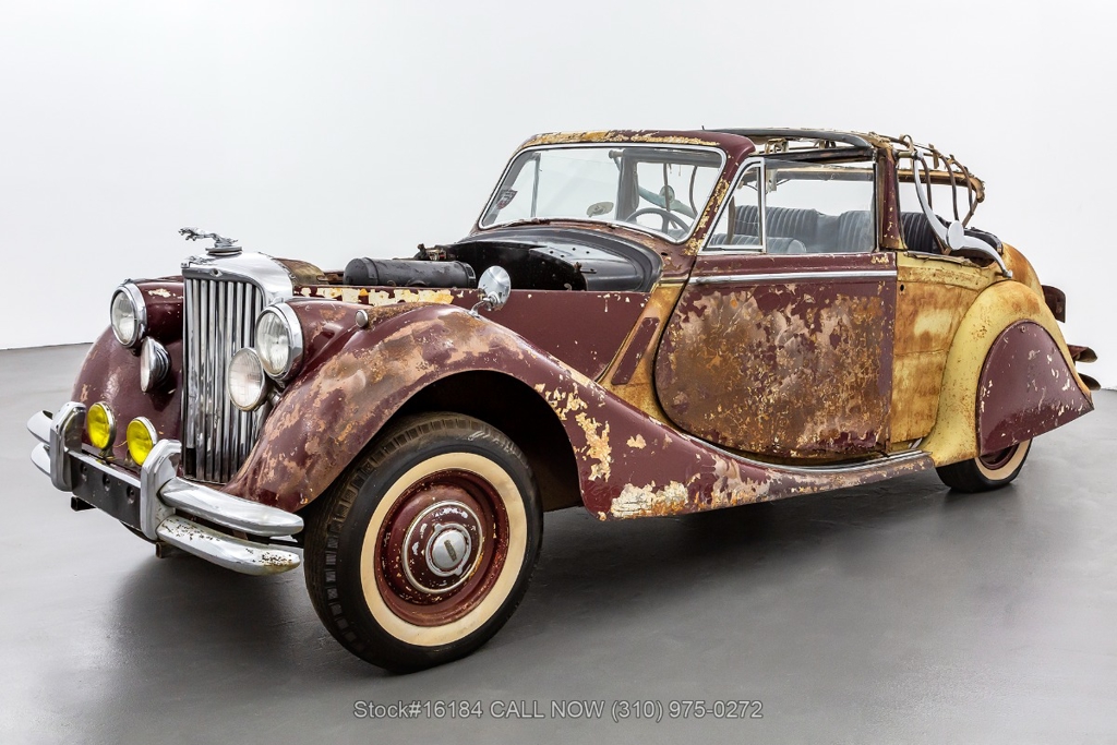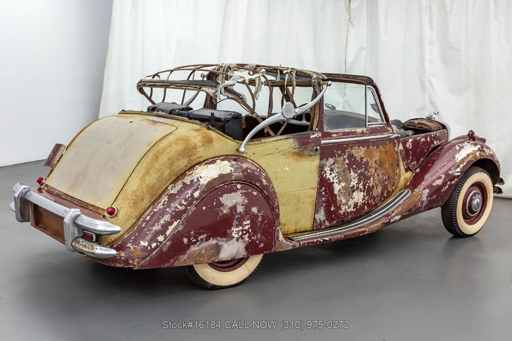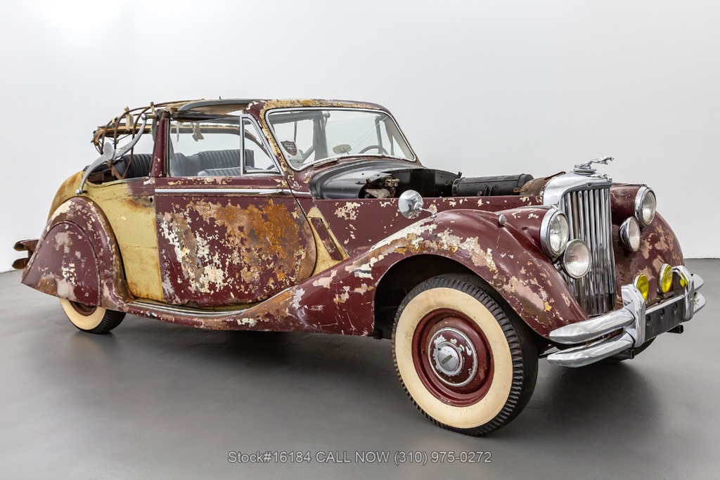 This rare 1950 Jaguar Mark V Drophead Coupe is a left hand drive example that is offered with a black interior. Equipped with a 3 1/2-liter straight-six engine, chrome radiator grille, Smiths instruments, chrome bumpers, fender-mounted side mirrors, four-spoke steering wheel, forward-folding seats, rear bench seat, interior wood trim, rear fender skirts, a jack, whitewall tires, and extra parts on the side. A great opportunity to be a part of a select few to acquire a post-war Jaguar Mark V Drophead that will make an exciting restoration project for any classic car enthusiast. For $16,750
