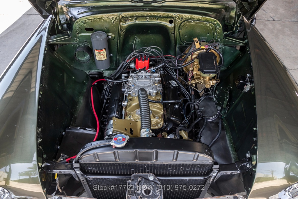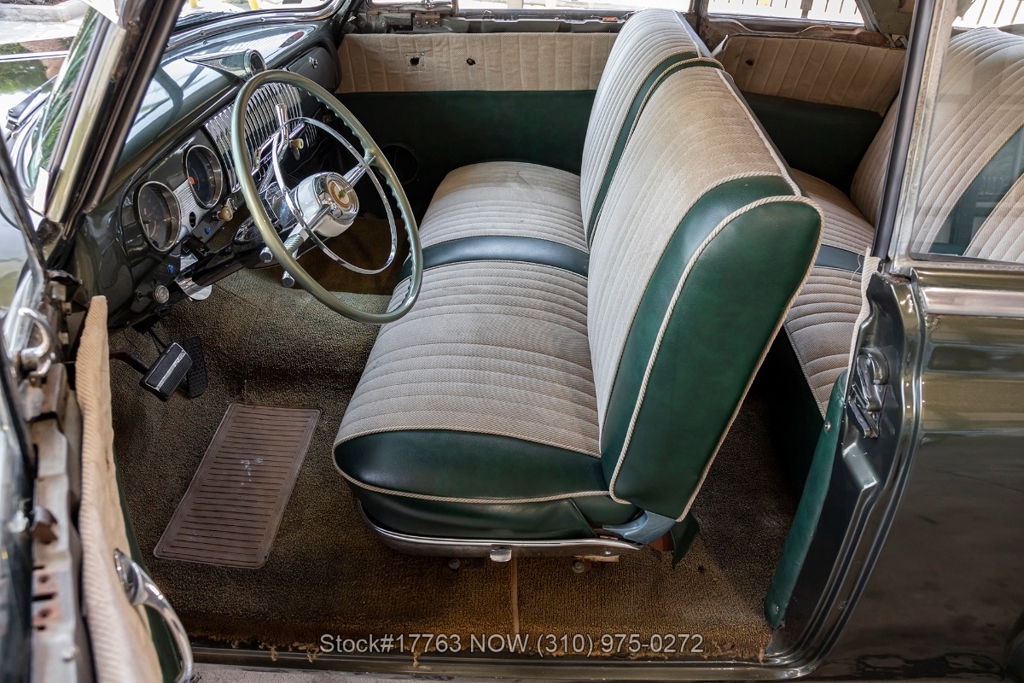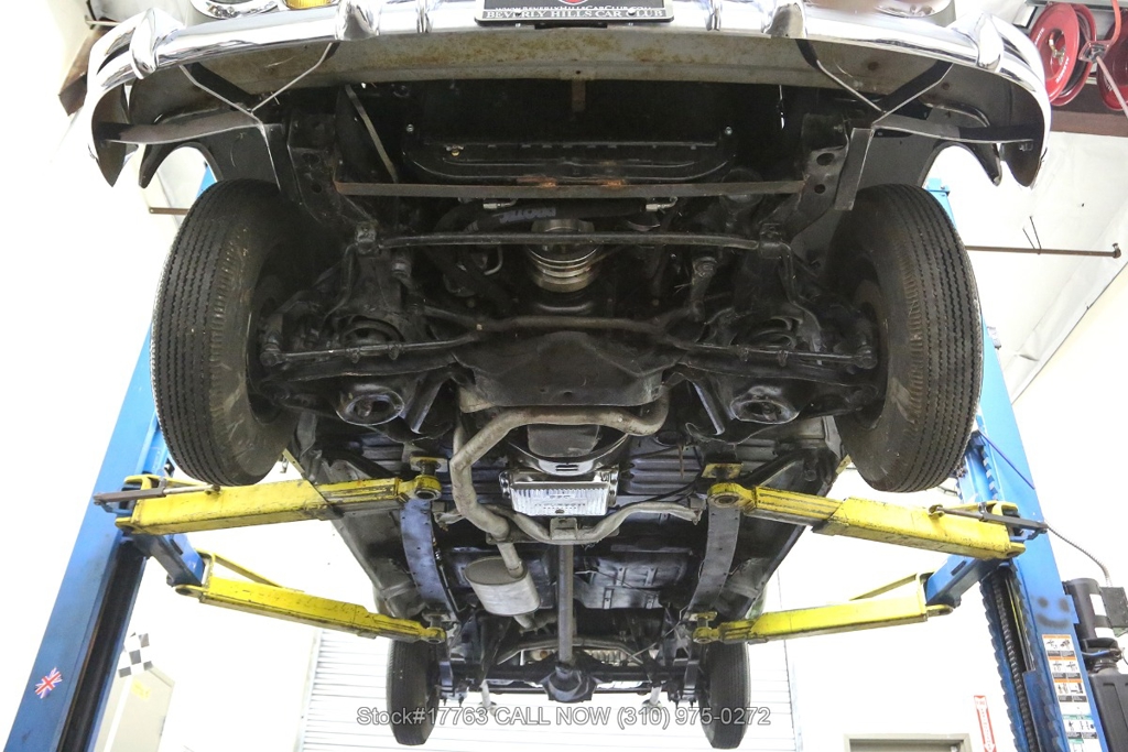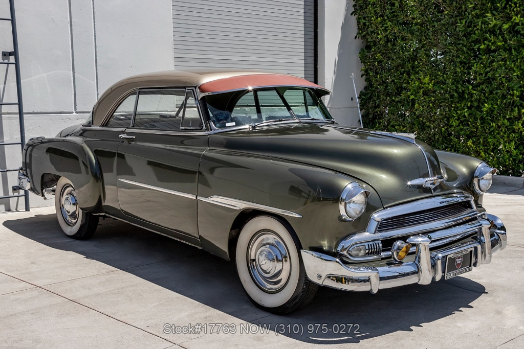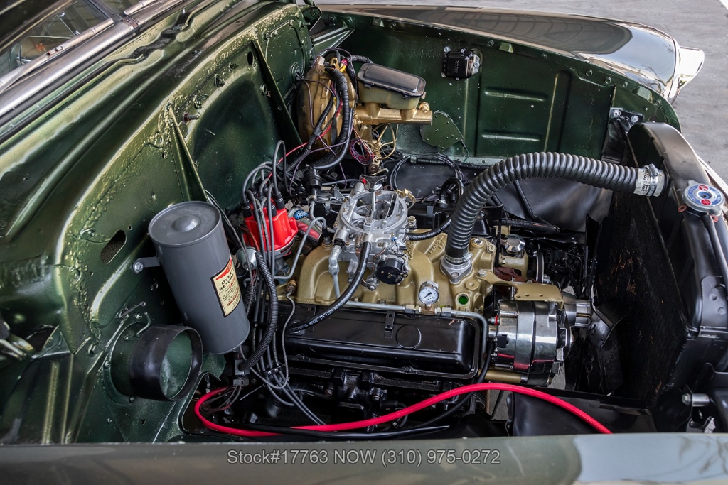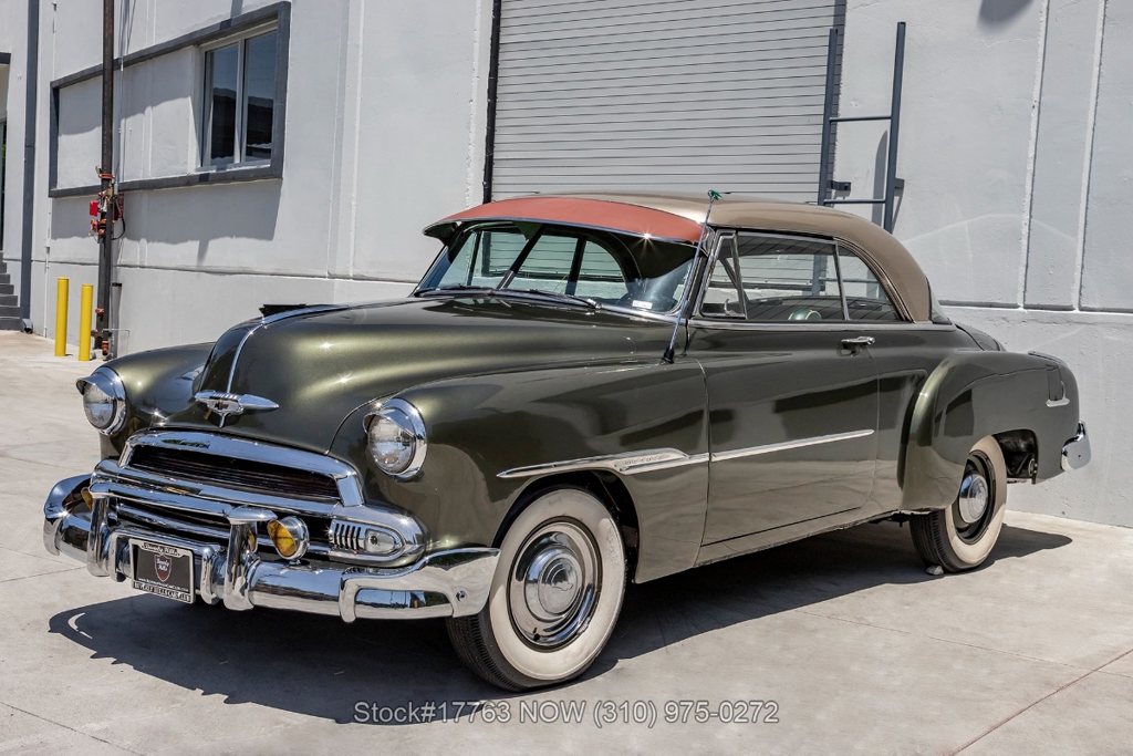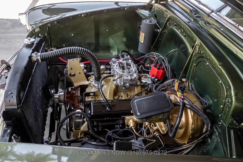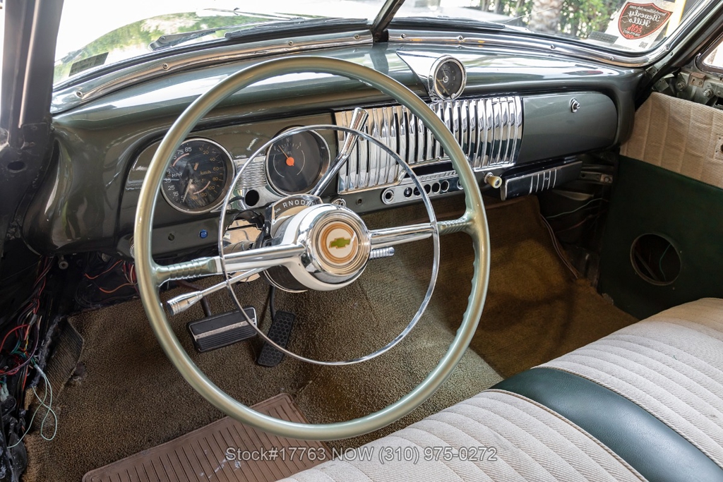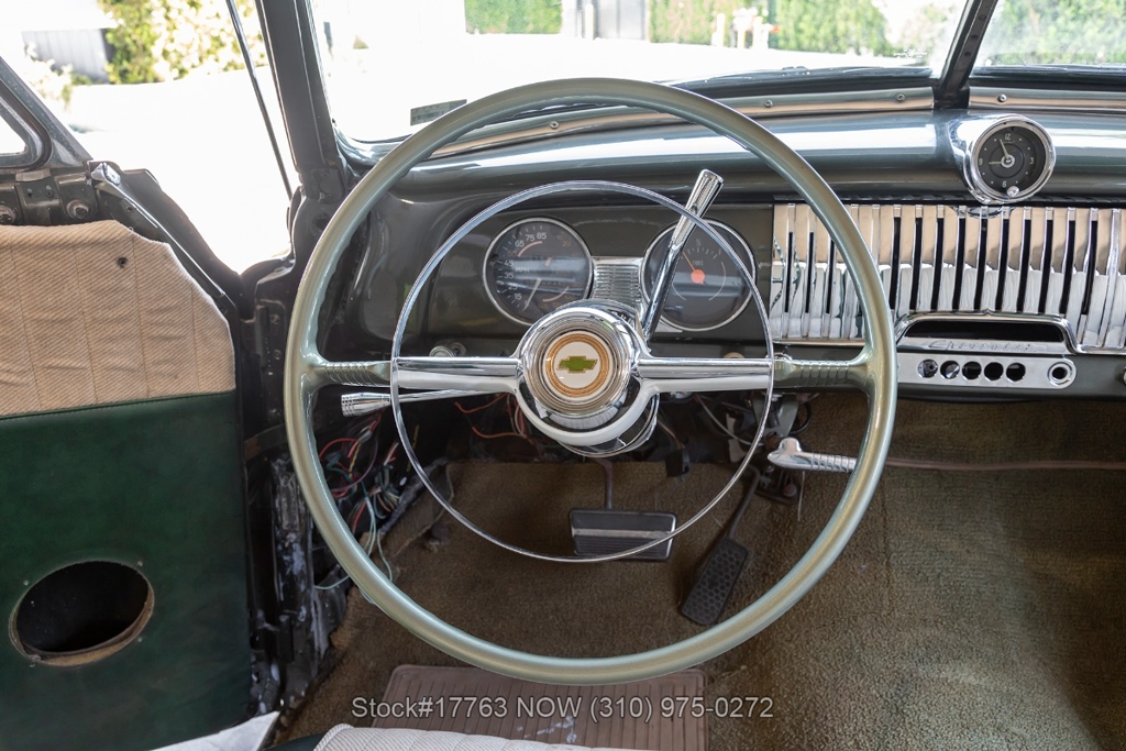 This California car is equipped with an automatic transmission with steering column control, V8 engine, Carter AFB carburetor, power steering, quad exhaust tips, "Deluxe" fender emblems, chrome bumpers with overriders, windshield visor, a hood ornament, split windshield, Chevrolet-branded hub caps, BF Goodrich Silvertown whitewall tires, jack, and a full-size spare tire fitted in the trunk. Convenience features include bench seats, analog clock, fender-mounted antenna, and a 2-spoke steering wheel adorned with a horn ring.