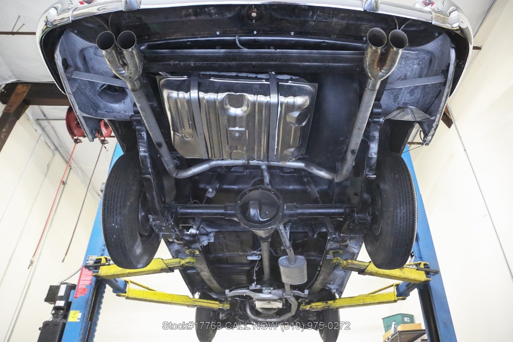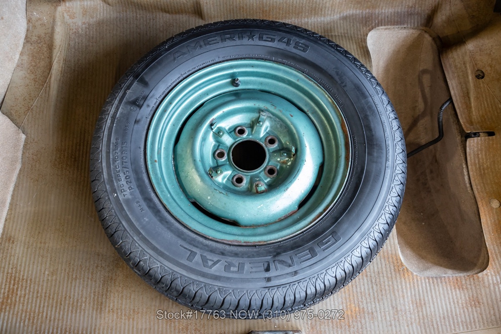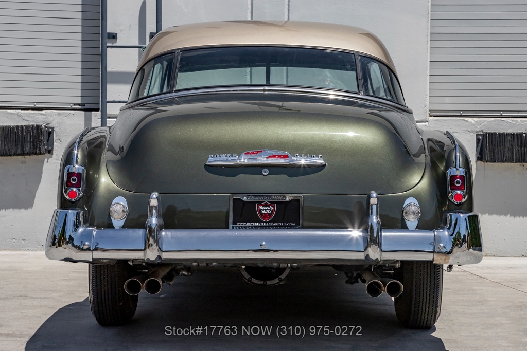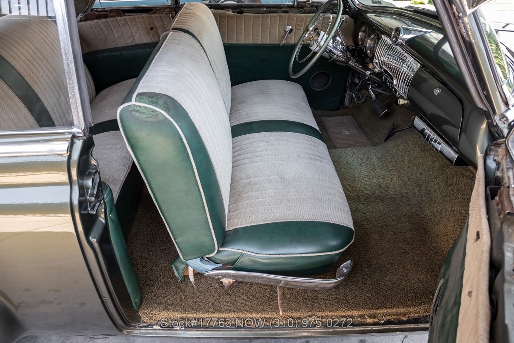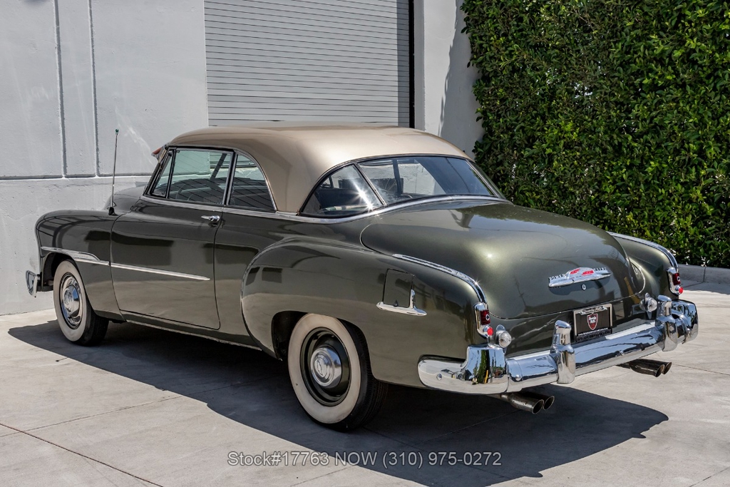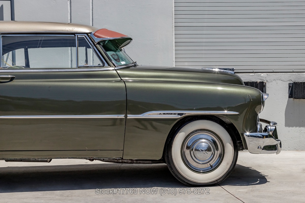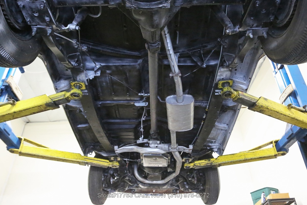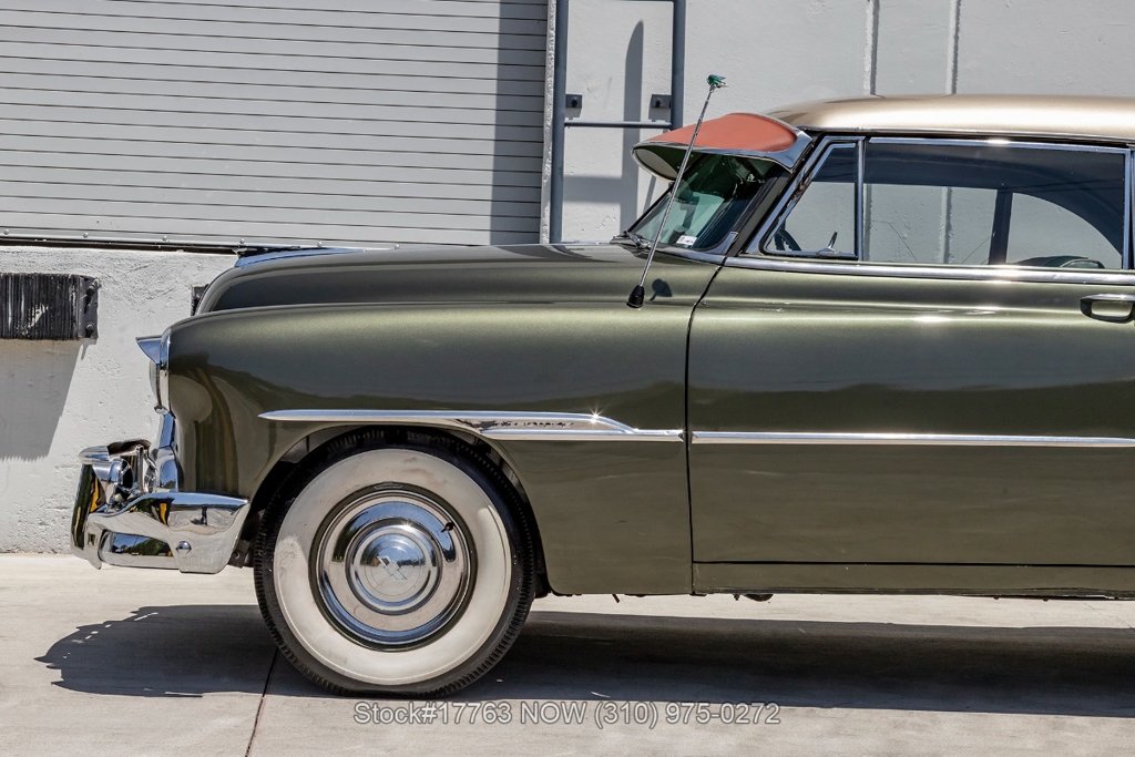 This California car is equipped with an automatic transmission with steering column control, V8 engine, Carter AFB carburetor, power steering, quad exhaust tips, "Deluxe" fender emblems, chrome bumpers with overriders, windshield visor, a hood ornament, split windshield, Chevrolet-branded hub caps, BF Goodrich Silvertown whitewall tires, jack, and a full-size spare tire fitted in the trunk. Convenience features include bench seats, analog clock, fender-mounted antenna, and a 2-spoke steering wheel adorned with a horn ring.