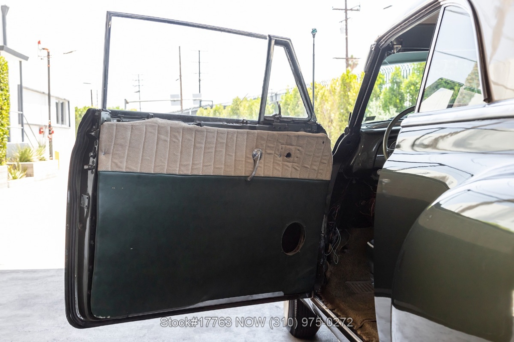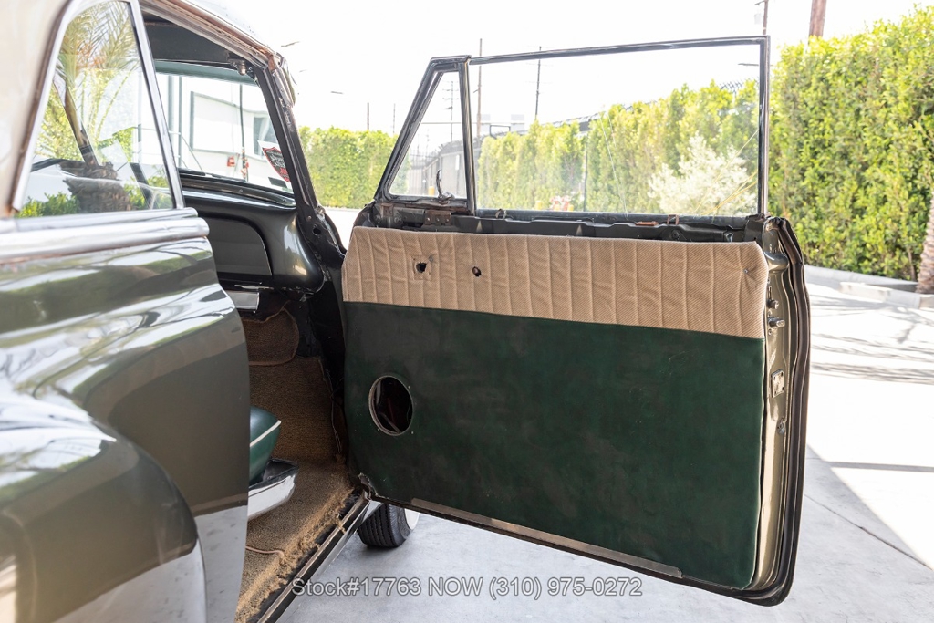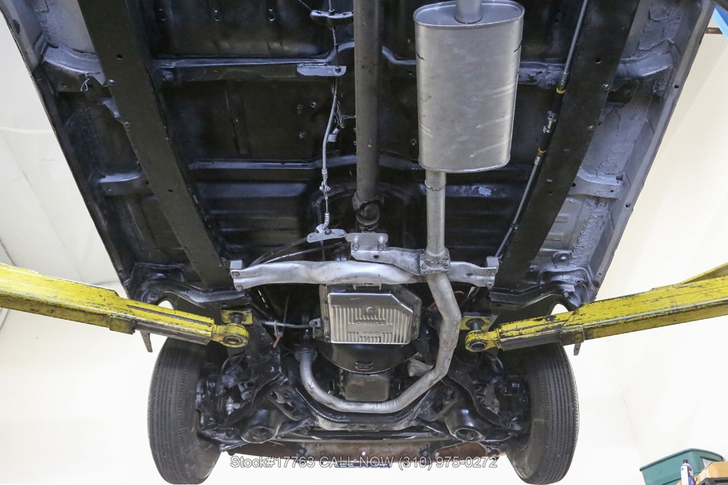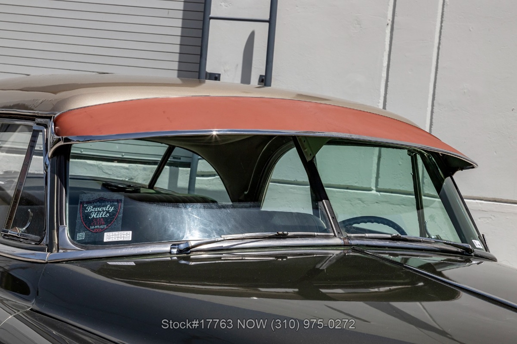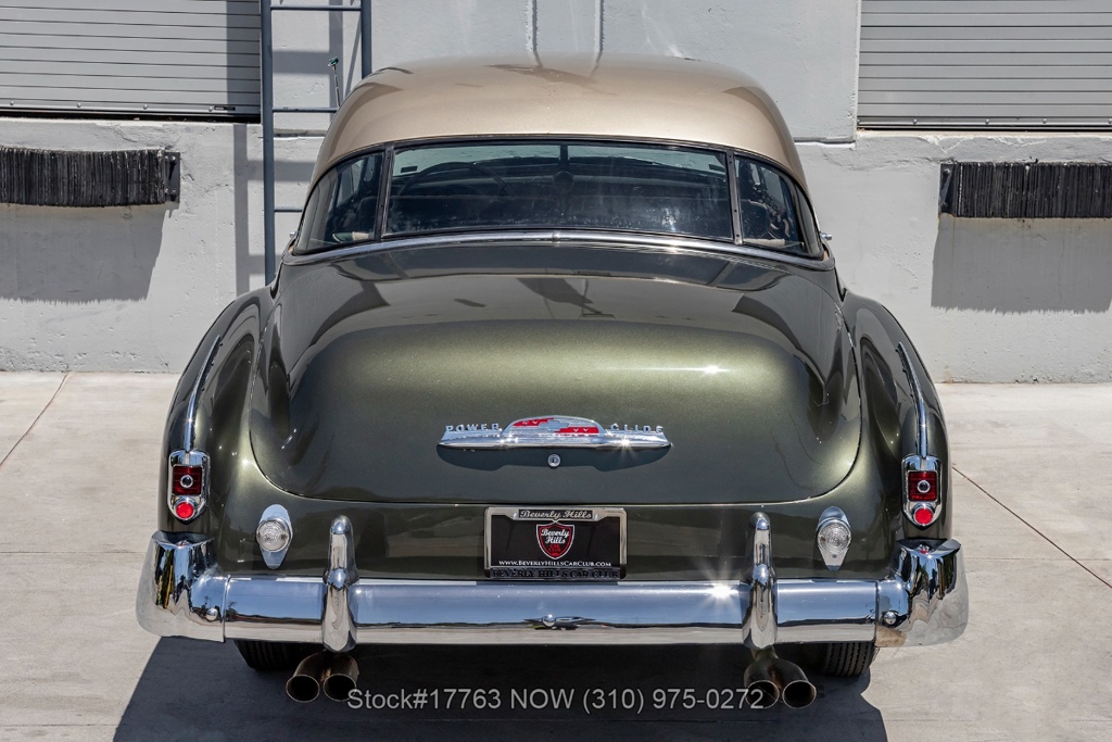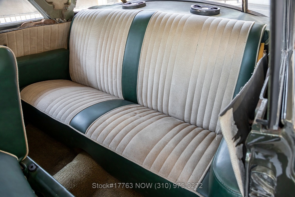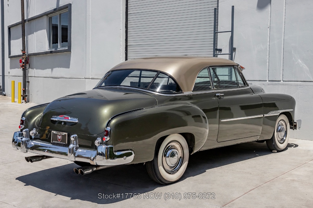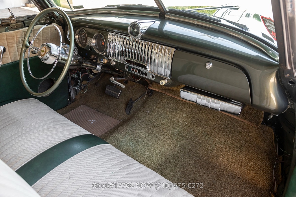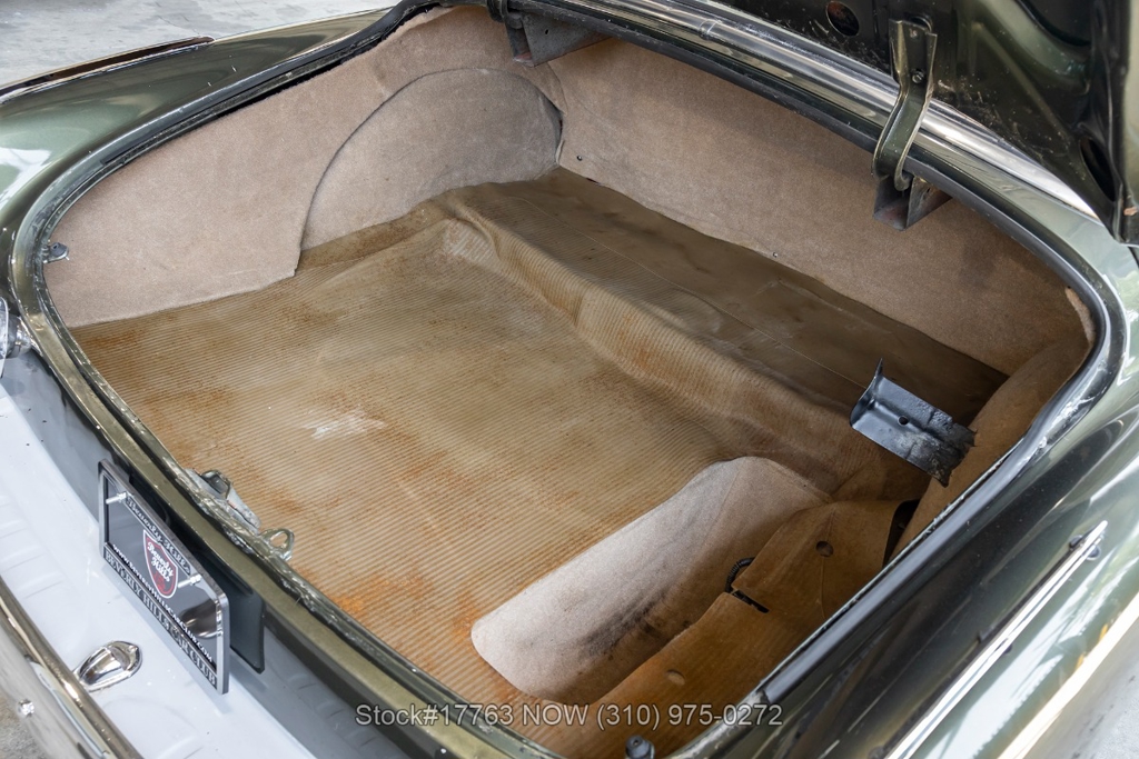 This California car is equipped with an automatic transmission with steering column control, V8 engine, Carter AFB carburetor, power steering, quad exhaust tips, "Deluxe" fender emblems, chrome bumpers with overriders, windshield visor, a hood ornament, split windshield, Chevrolet-branded hub caps, BF Goodrich Silvertown whitewall tires, jack, and a full-size spare tire fitted in the trunk. Convenience features include bench seats, analog clock, fender-mounted antenna, and a 2-spoke steering wheel adorned with a horn ring.