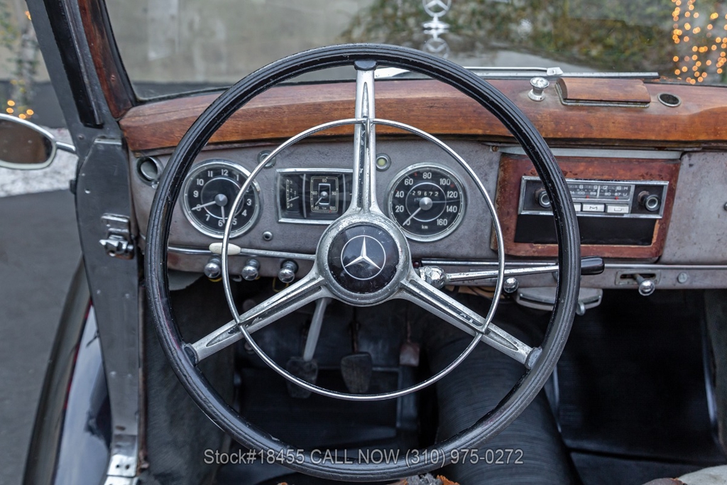 This original California car is equipped with a 4-speed manual transmission, inline-six engine, single-barrel carburetor, single exhaust outlet, VDO instrumentation, Hella headlights, rear-hinged doors, three-spoke steering wheel with a chrome horn ring, Mercedes-Benz ornament, chrome trim, chrome bumpers with overriders, 16-inch steel wheels, Firestone white-wall tires, jack, and a spare tire. Convenience features include low-rise bucket seats, Blaupunkt radio, analog clock, and a driver-side rearview mirror.