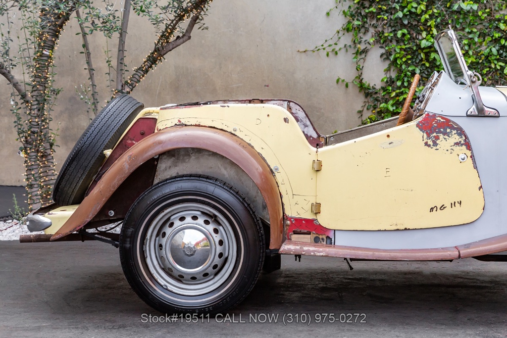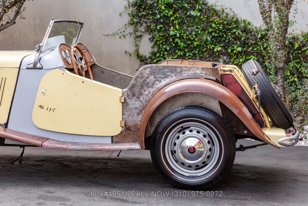 The exterior shows classic T-series details such as bonnet louvers, chrome accents, and 15-inch steel Disc style wheels fitted with Michelin whiteline tires. Chrome hubcaps display the MG octagon emblem, and a matching rear-mounted spare wheel completes the period-correct appearance.