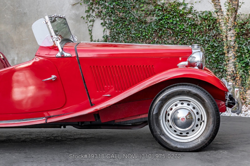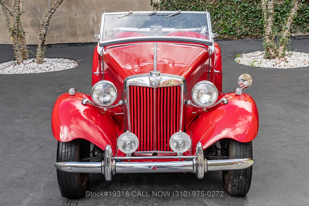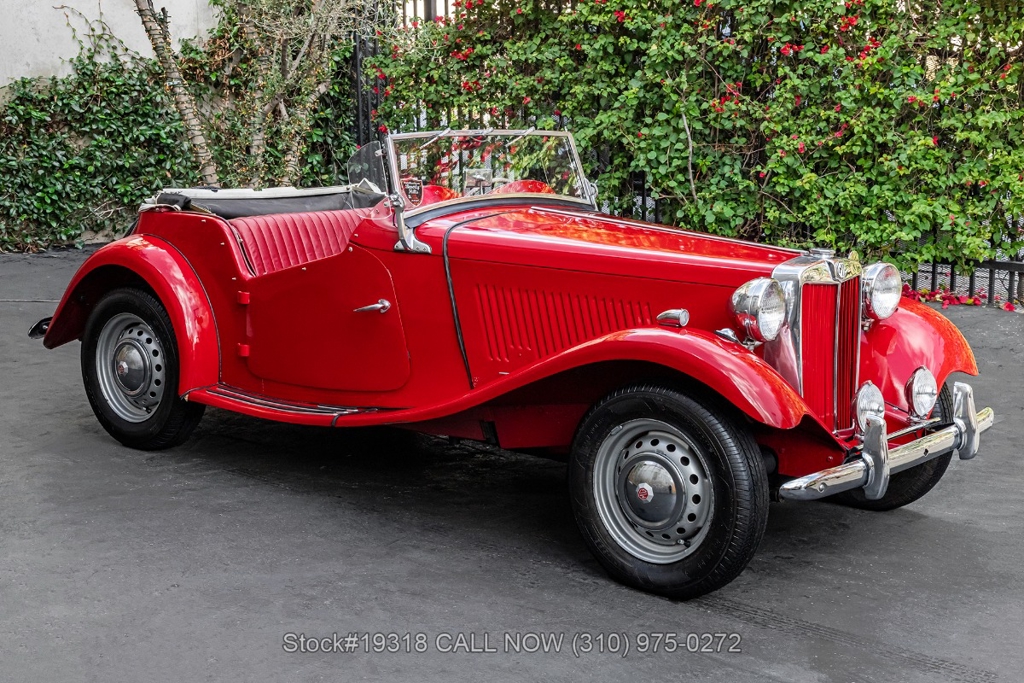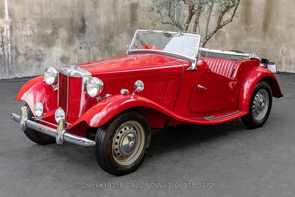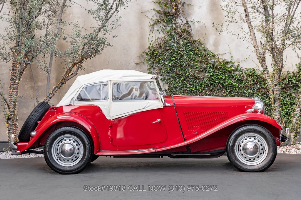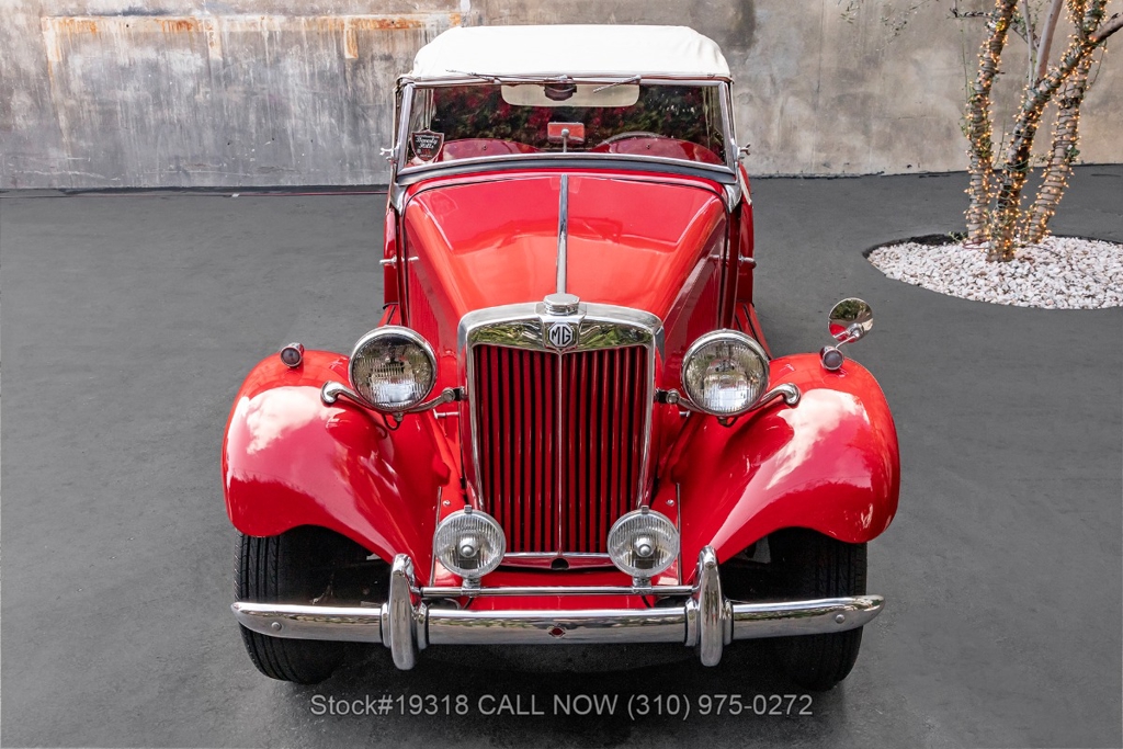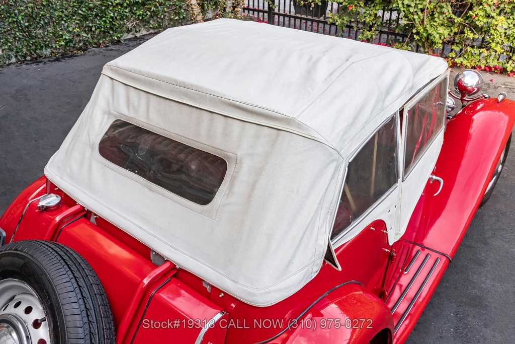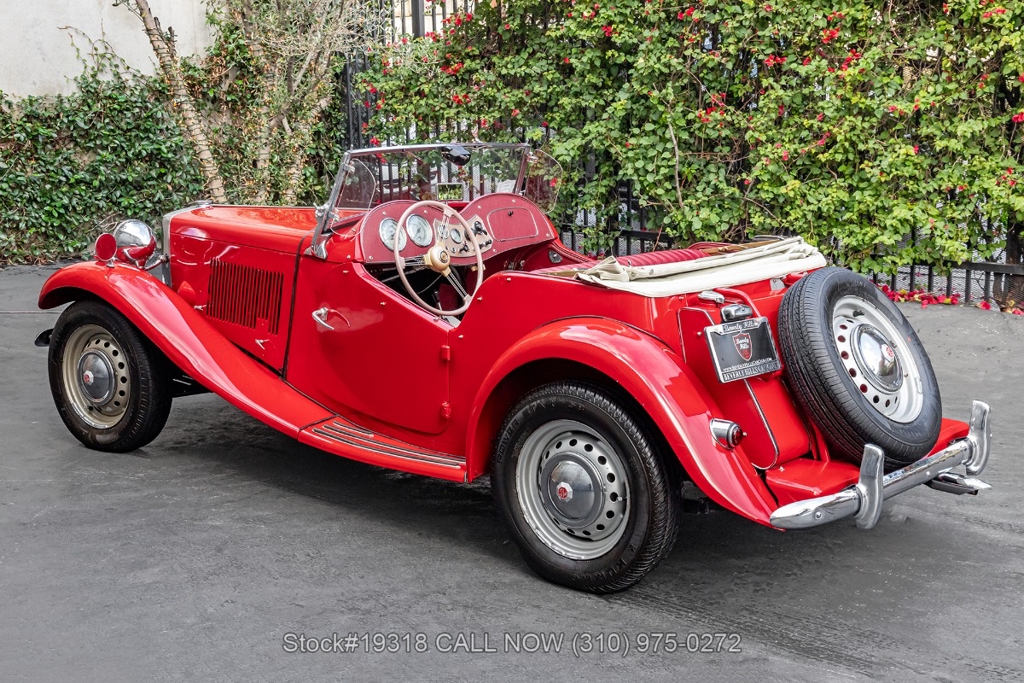 Powered by an inline-four engine paired with a 4-speed manual transmission, this MG TD features SU dual carburetors, drum brakes all the way around, Jaeger/Lucas instrumentation, a white convertible soft top, side curtains, chrome accents, bonnet louvers, a 3-spoke steering wheel, and 15-inch steel wheels with MG-branded hubcaps. A full-size spare tire is neatly mounted at the rear.