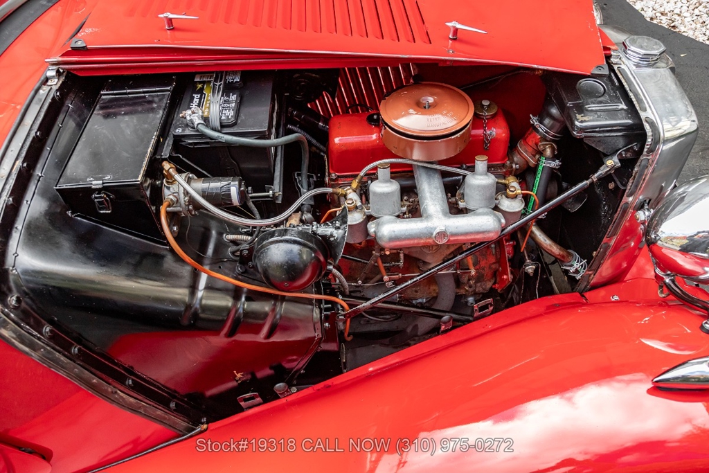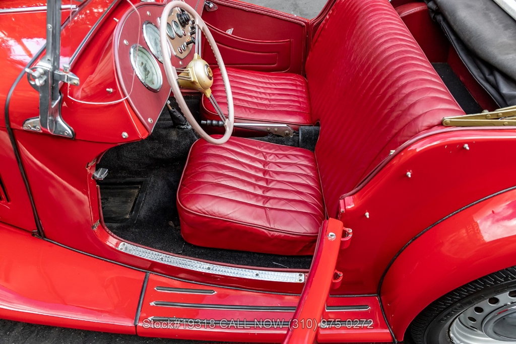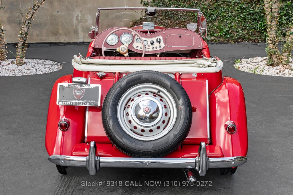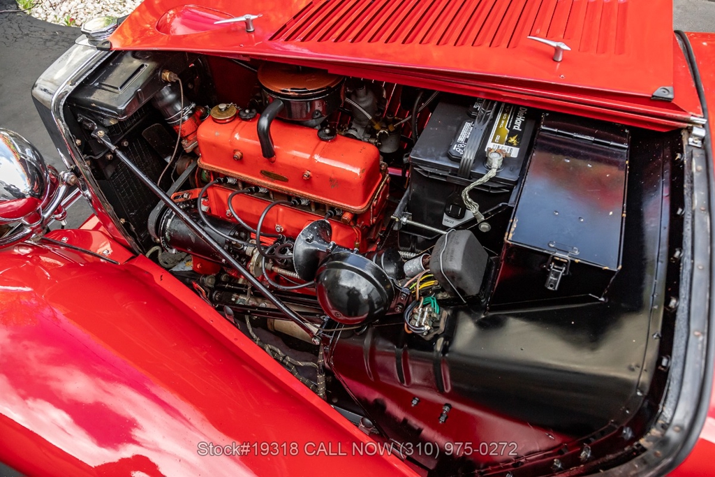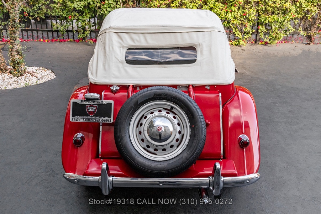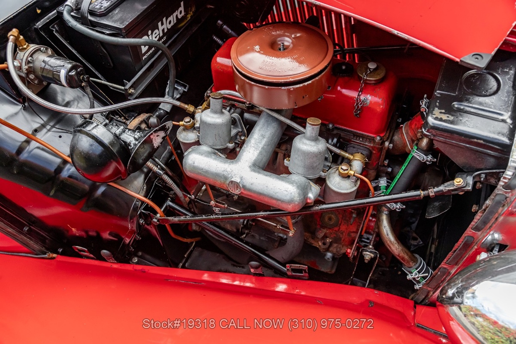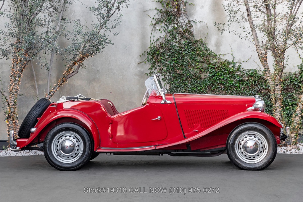 Powered by an inline-four engine paired with a 4-speed manual transmission, this MG TD features SU dual carburetors, drum brakes all the way around, Jaeger/Lucas instrumentation, a white convertible soft top, side curtains, chrome accents, bonnet louvers, a 3-spoke steering wheel, and 15-inch steel wheels with MG-branded hubcaps. A full-size spare tire is neatly mounted at the rear.