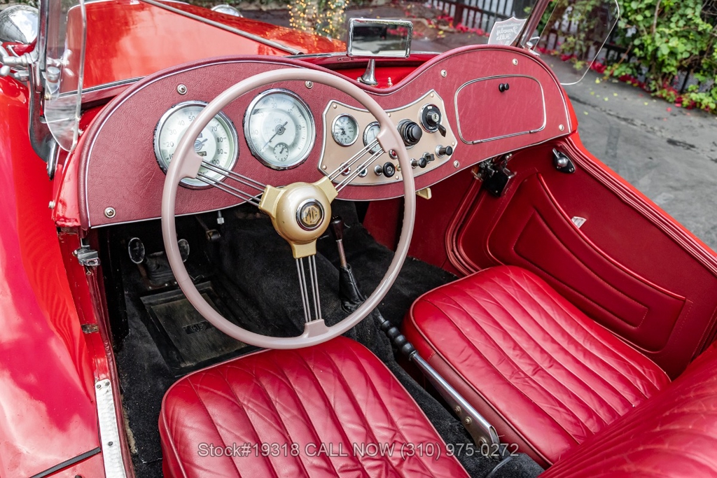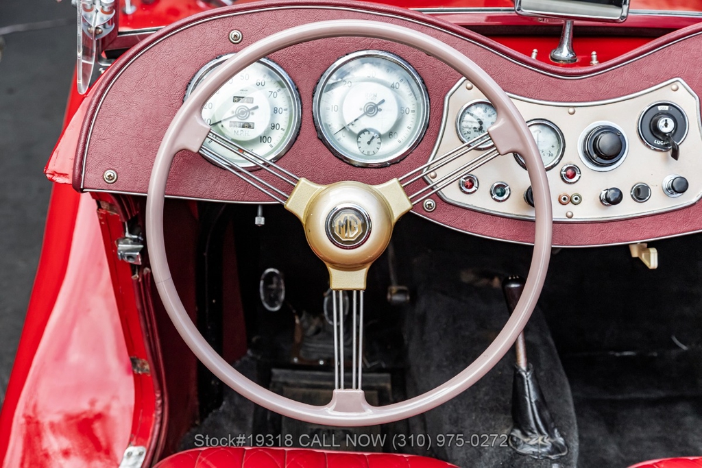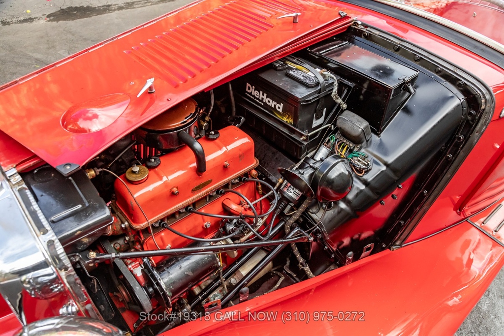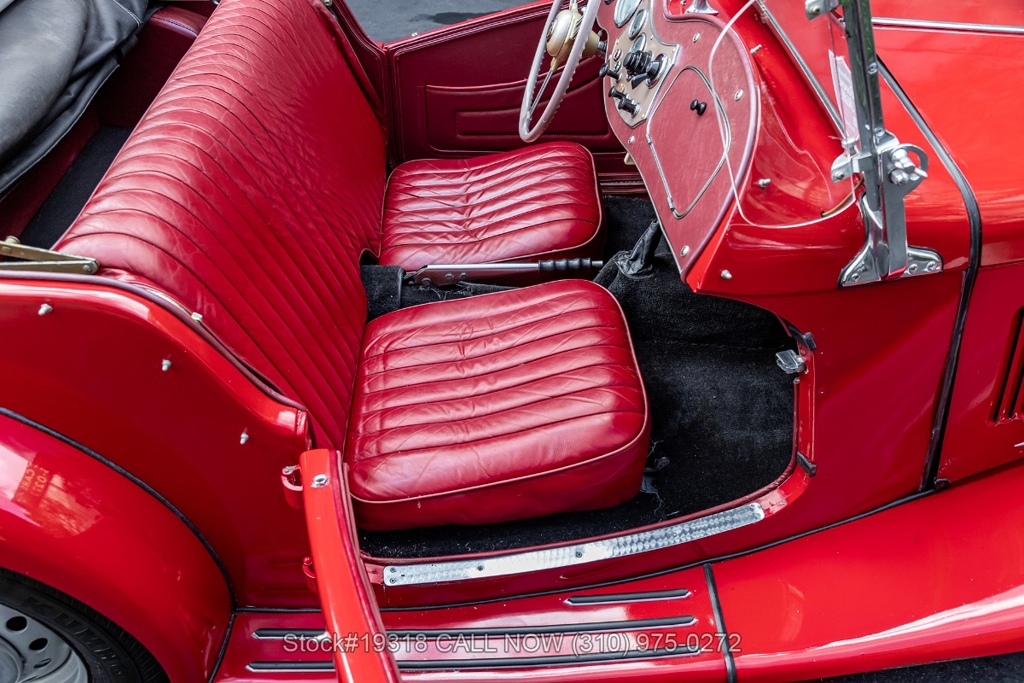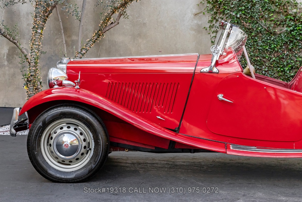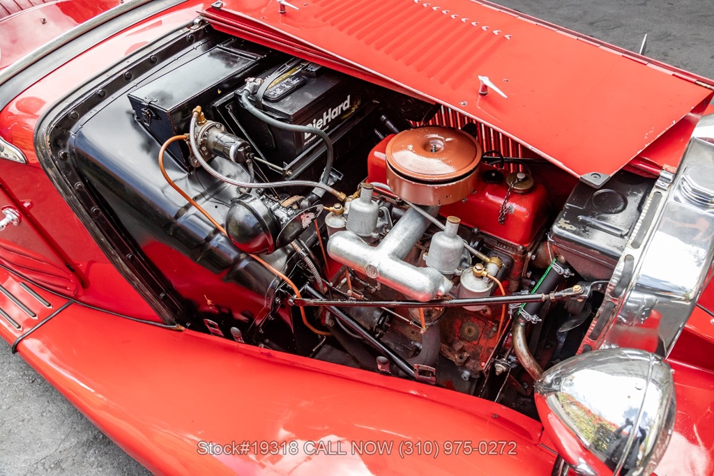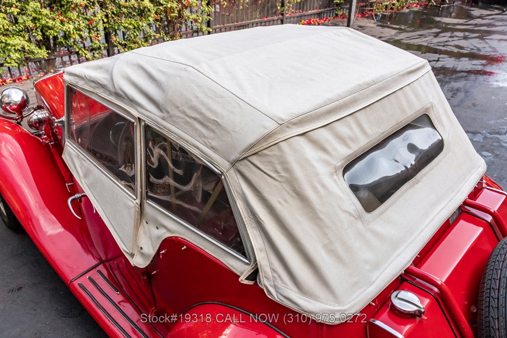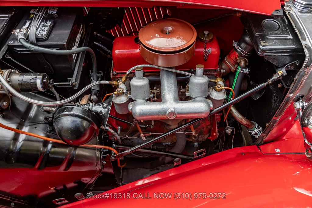 Powered by an inline-four engine paired with a 4-speed manual transmission, this MG TD features SU dual carburetors, drum brakes all the way around, Jaeger/Lucas instrumentation, a white convertible soft top, side curtains, chrome accents, bonnet louvers, a 3-spoke steering wheel, and 15-inch steel wheels with MG-branded hubcaps. A full-size spare tire is neatly mounted at the rear.