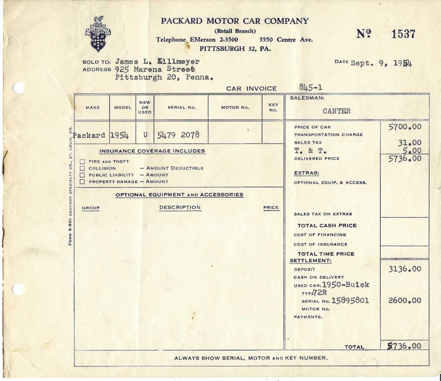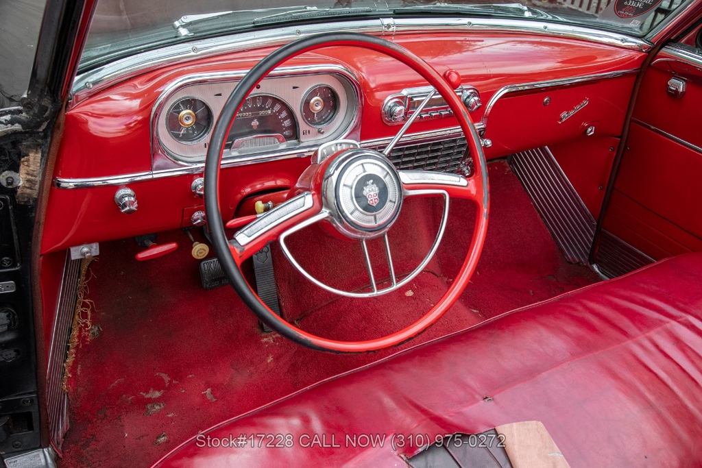 Introducing this scarce 1954 Packard Convertible that is finished in black combined with a red interior. Equipped with a column-shifted automatic transmission, straight-eight-cylinder engine, Carter 4-barrel carburetor, single exhaust outlet, convertible soft top, two-spoke steering wheel with a horn ring, fender-mounted antenna, chrome trim/bumpers, bench seats, sun visors, driver-side rearview mirror, chrome cormorant hood ornament, rear fender skirts, wire wheels, white-line tires, Packard-branded wheel center caps, jack, and a full-size spare tire. This American classic is also equipped with power windows, a rare and desirable feature that was available as an extra-cost option for this model. In addition to its features, this particular automobile comes with a range of special extras that add to its allure. Included with the car is an owner's manual and a copy of the original car invoice dated September 9, 1954, providing a unique glimpse into its history and provenance. While this vehicle may require some mechanical attention, its potential is undeniable. For automotive enthusiasts and collectors alike, this Packard Convertible presents a unique opportunity to own a piece of history and bring it back to its former glory. Do not miss your chance to own this classic beauty and make a statement wherever you go. For $24,750