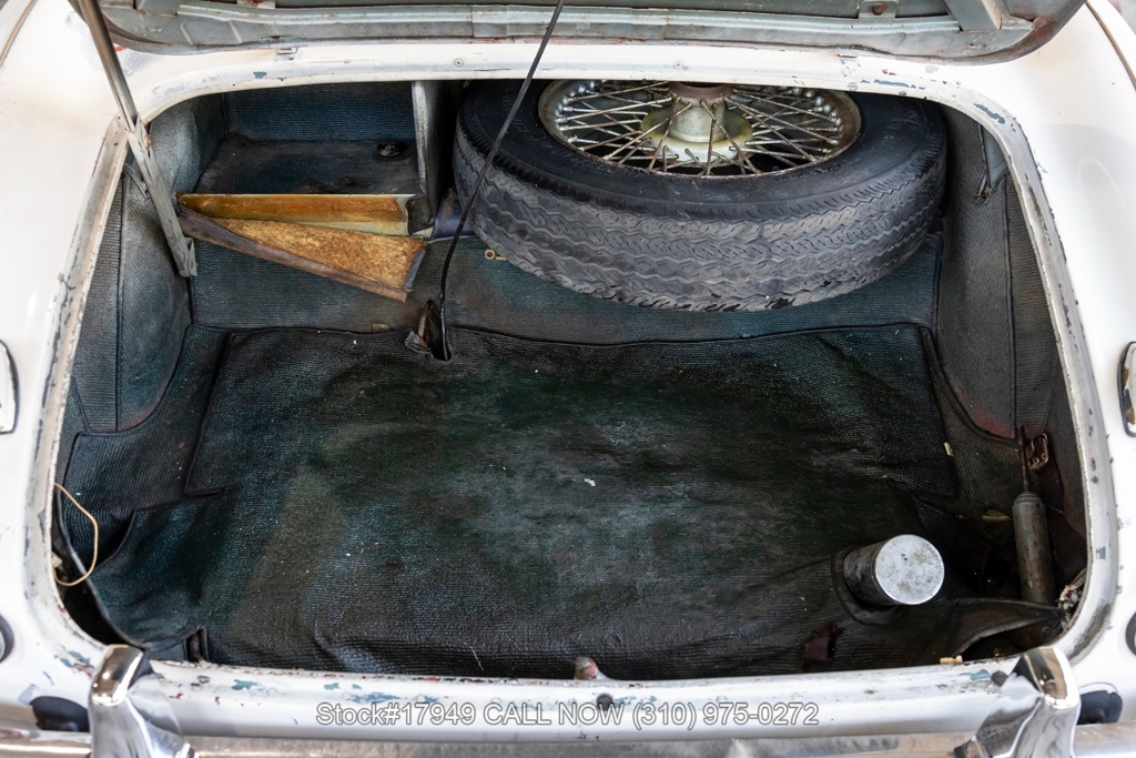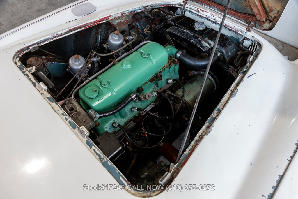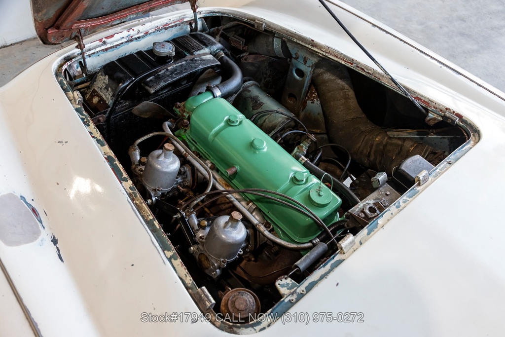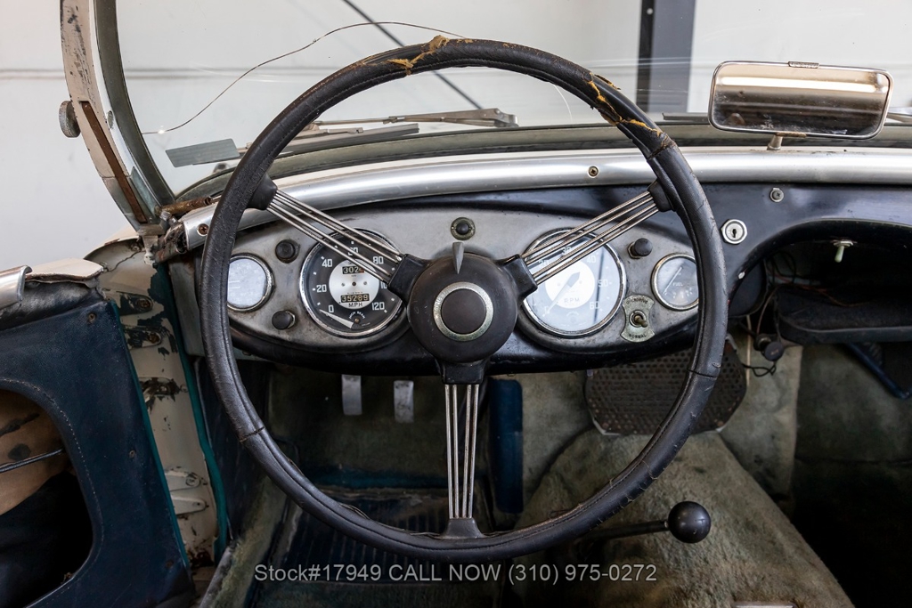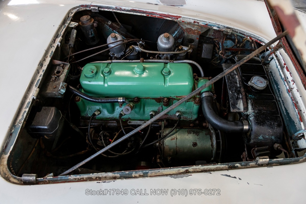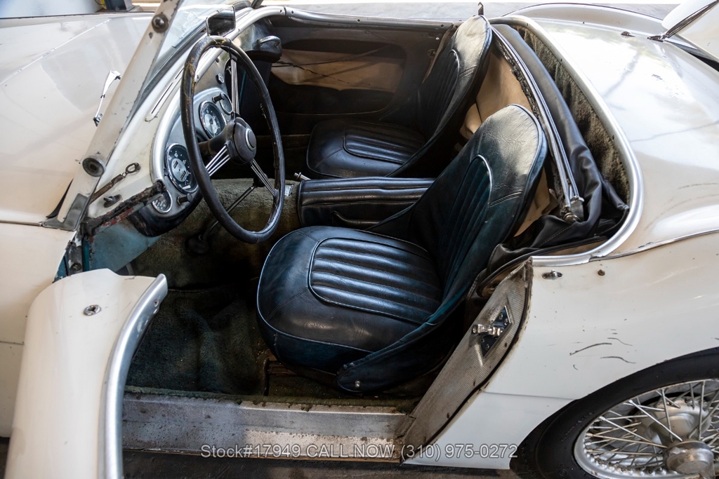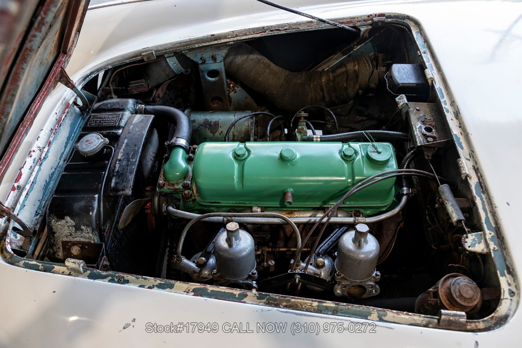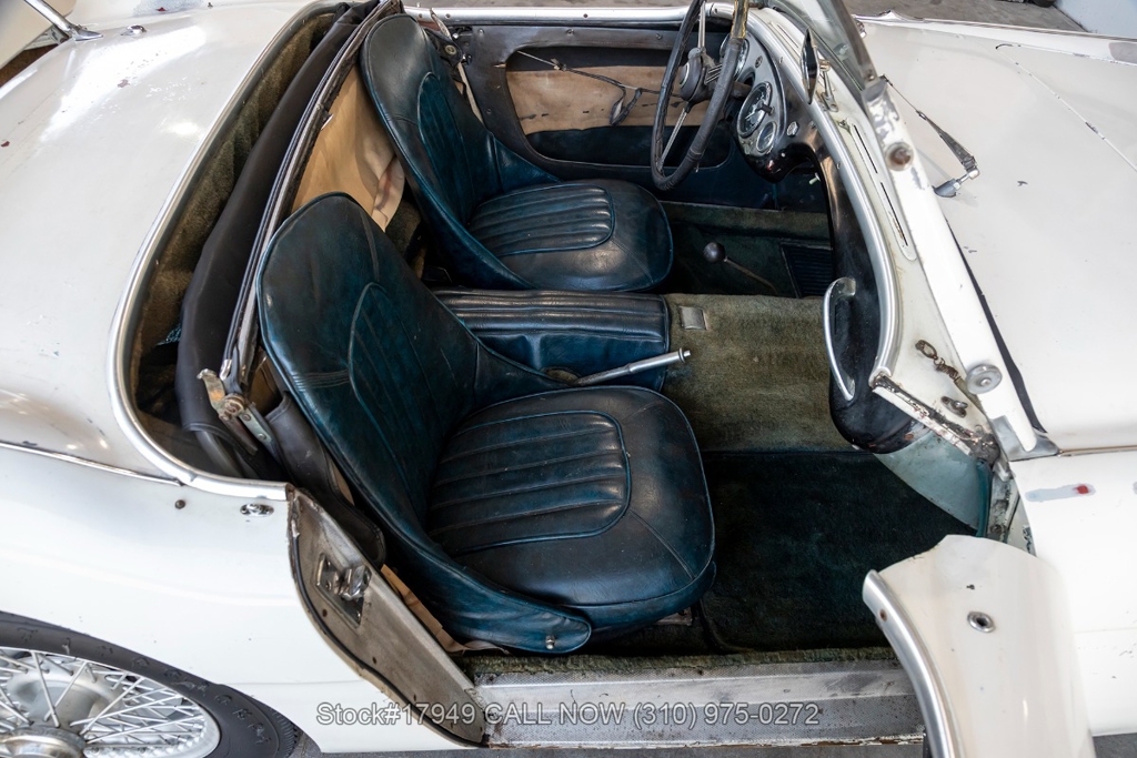Under the bonnet, this Austin-Healey is powered by a inline-four engine, SU dual carburetors, and a 4-speed manual transmission. Additional equipment includes floor-mounted shifter, single exhaust outlet, Smiths instrumentation, convertible soft top, side curtains, chrome trim, Firestone tires, and 15-inch wire wheels with knock-off spinners. Convenience features include dash- mounted rearview mirror, side pockets, buckets seats, jack, and a spare tire.
