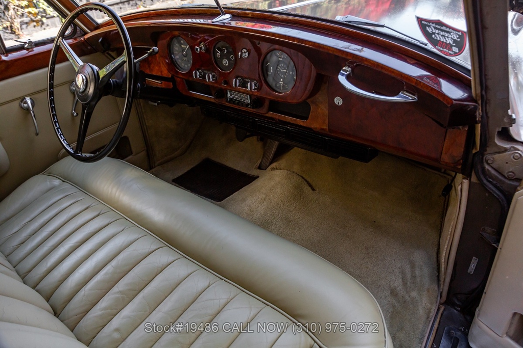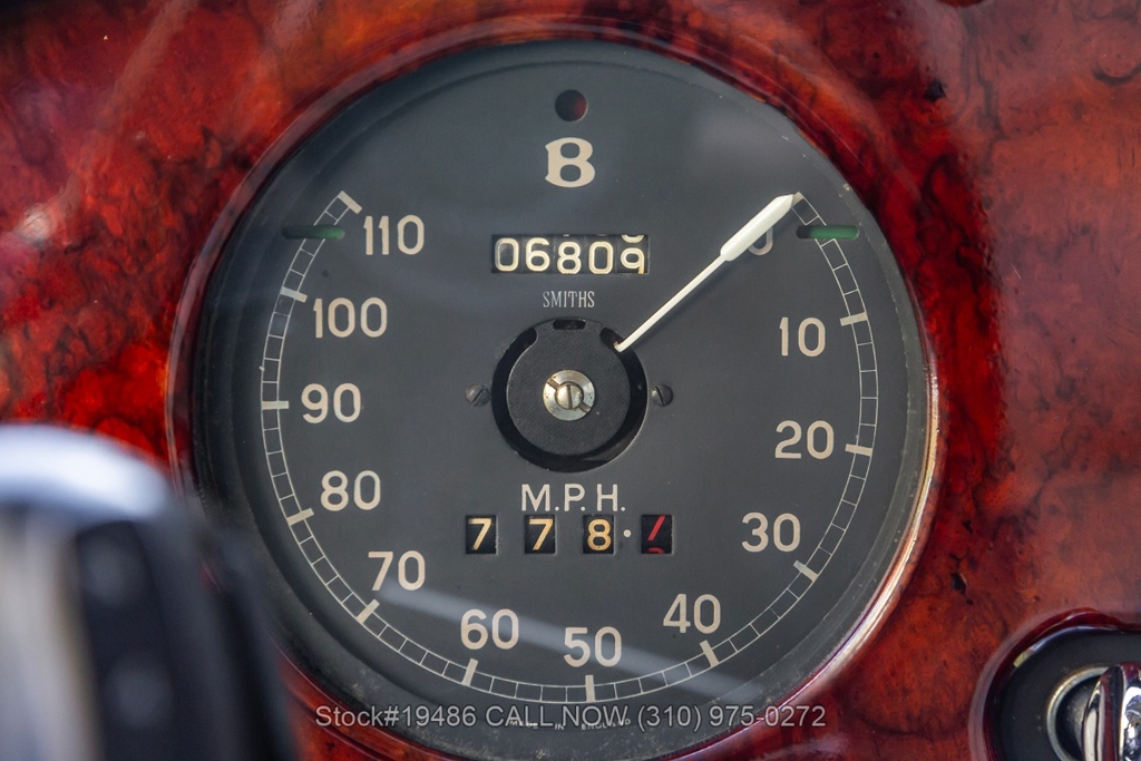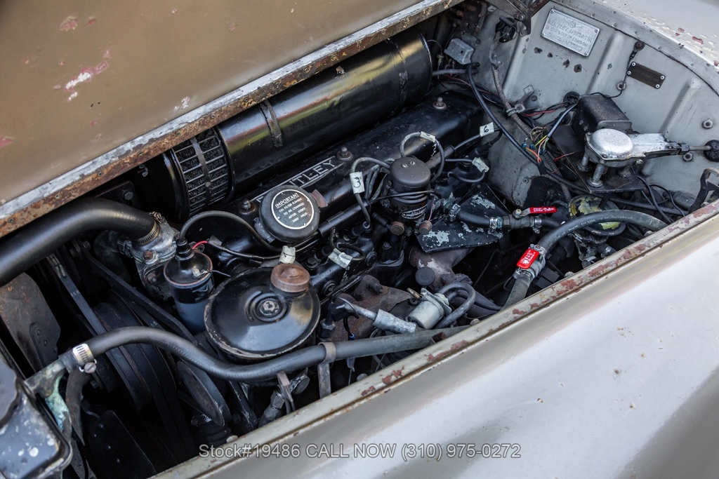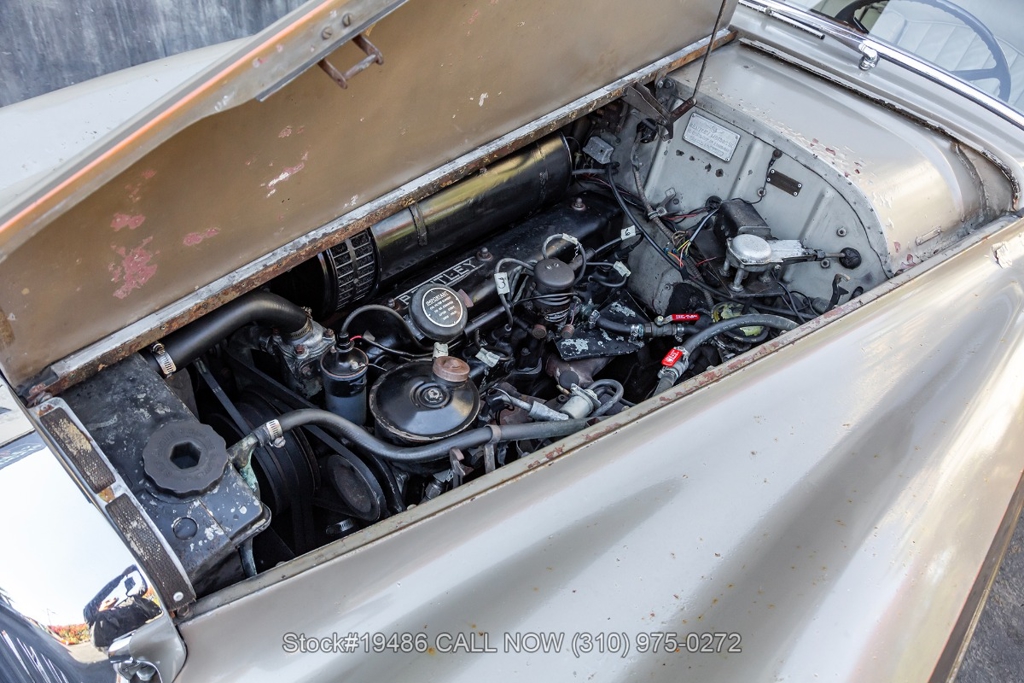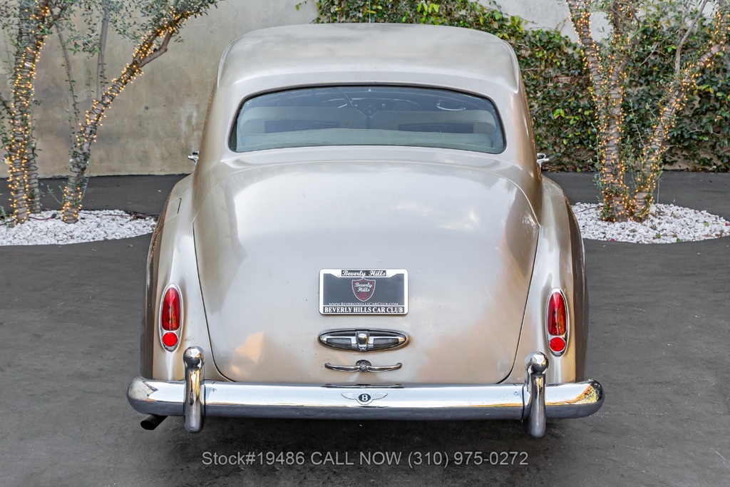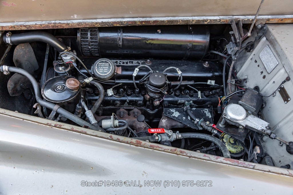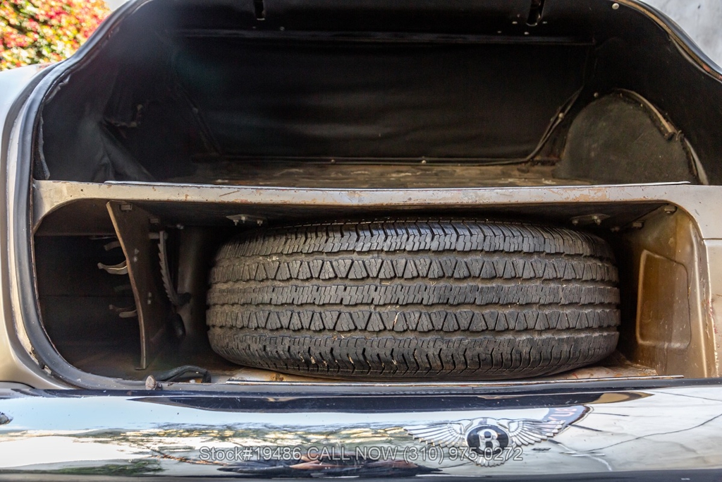 Equipped with an automatic transmission with steering-column control and powered by a straight-six engine featuring dual SU carburetors. Exterior details include a single exhaust outlet, chrome trim, chrome bumpers with overriders, Lucas front fog lights, a chrome radiator grille, the iconic Flying B hood ornament, 15-inch steel wheels, white-line tires, and Bentley hubcaps. Additional equipment includes a jack and a full-size spare tire perfectly fitted in the trunk.