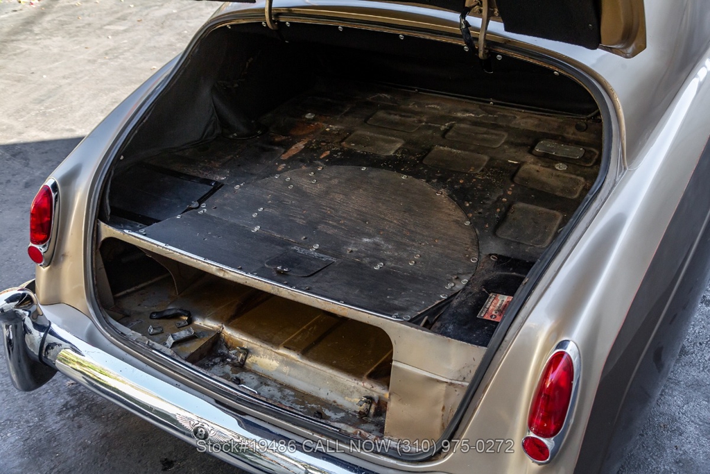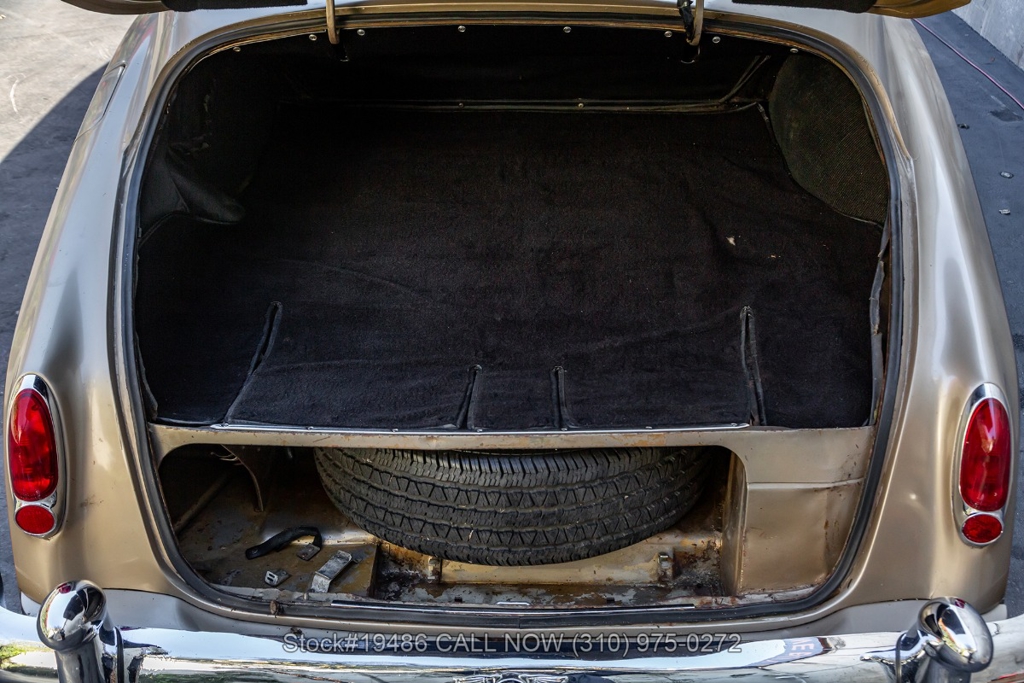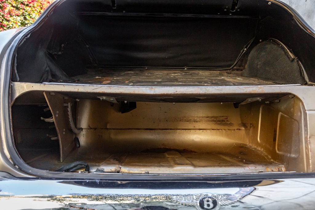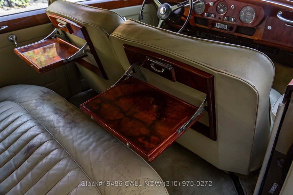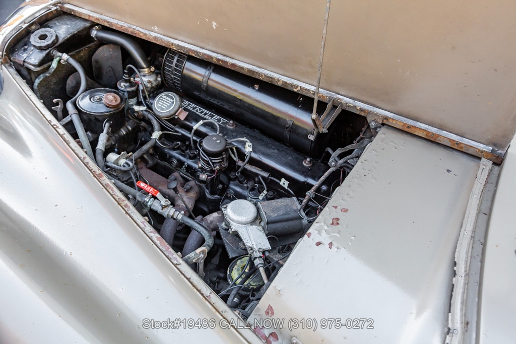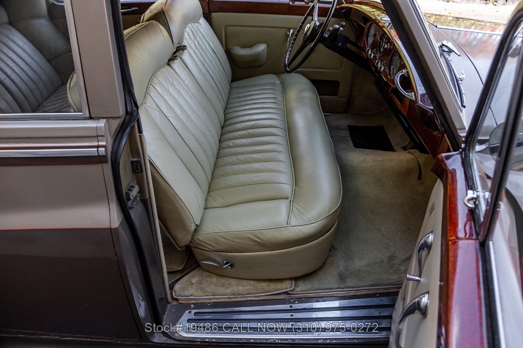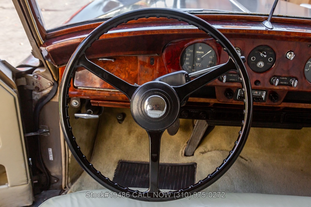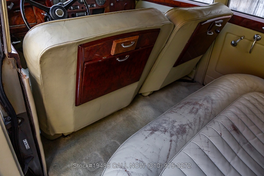 Equipped with an automatic transmission with steering-column control and powered by a straight-six engine featuring dual SU carburetors. Exterior details include a single exhaust outlet, chrome trim, chrome bumpers with overriders, Lucas front fog lights, a chrome radiator grille, the iconic Flying B hood ornament, 15-inch steel wheels, white-line tires, and Bentley hubcaps. Additional equipment includes a jack and a full-size spare tire perfectly fitted in the trunk.