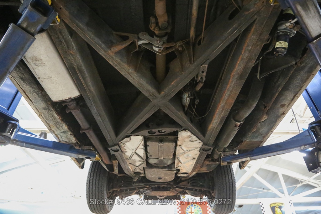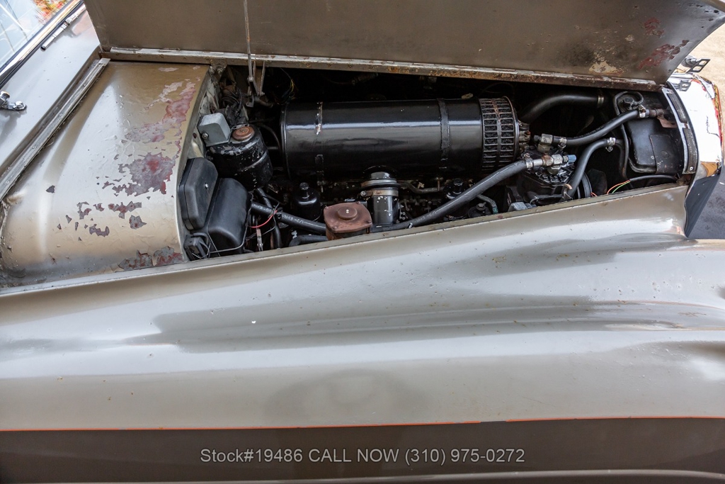 Inside, the cabin offers comfortable bench seating, air conditioning, a three-spoke steering wheel, Smiths/Lucas instrumentation, and classic wood accents throughout. Convenience features include vent windows, a dash-mounted rearview mirror, a vintage Motorola radio, a glove box, and rear folding picnic tables, an iconic luxury touch of the era.