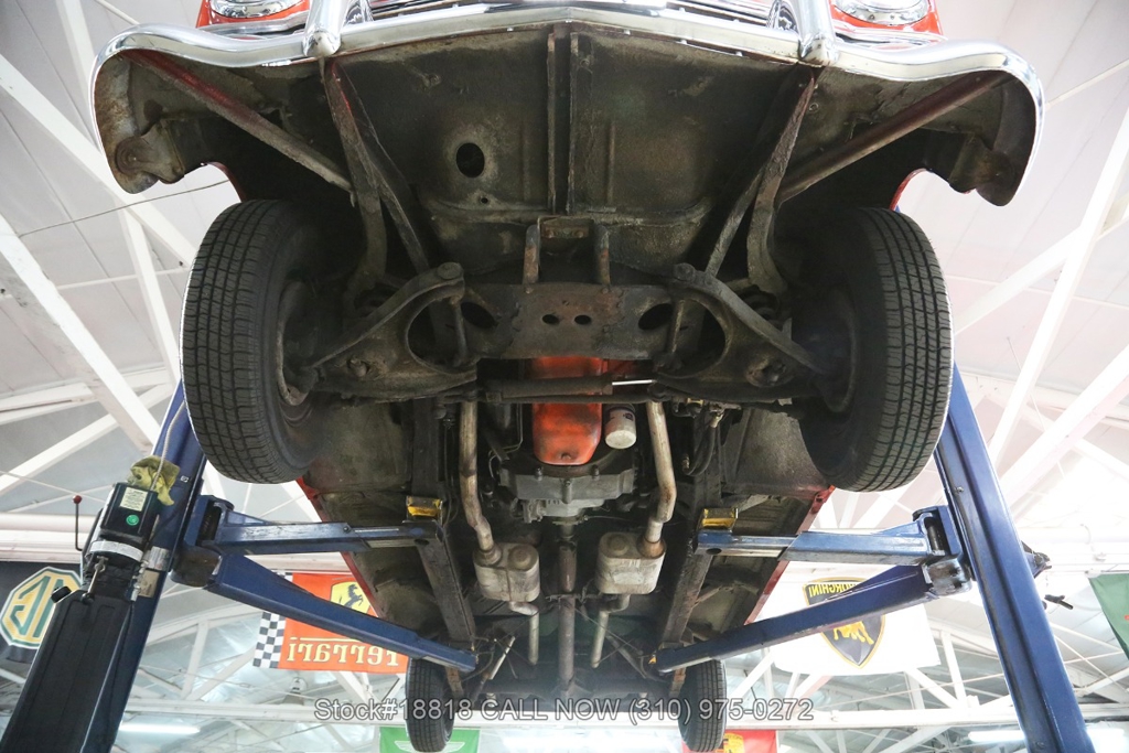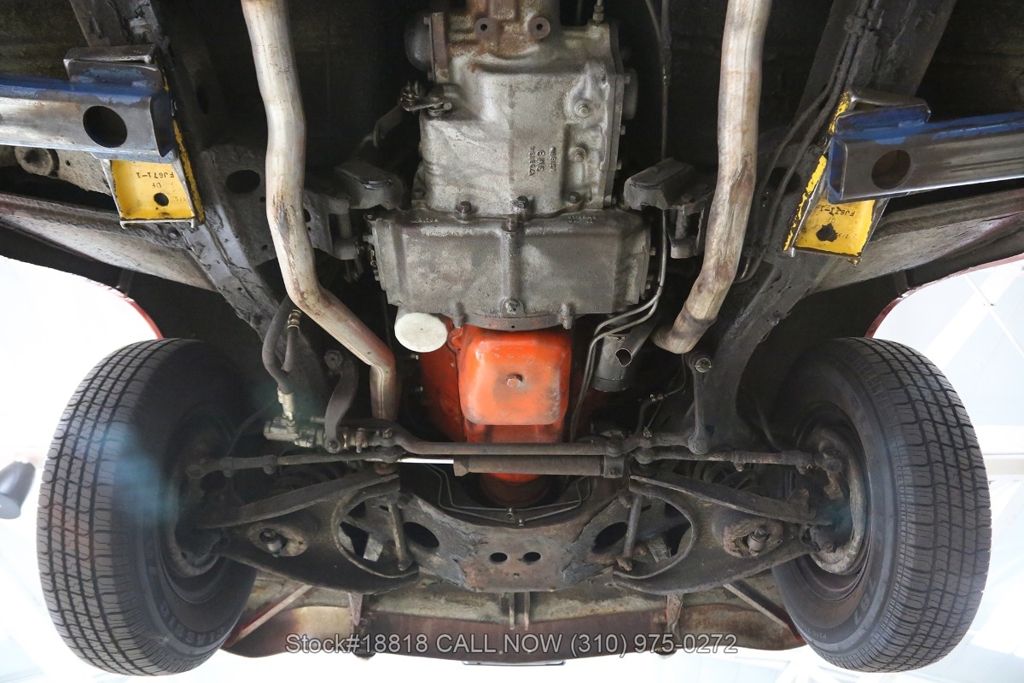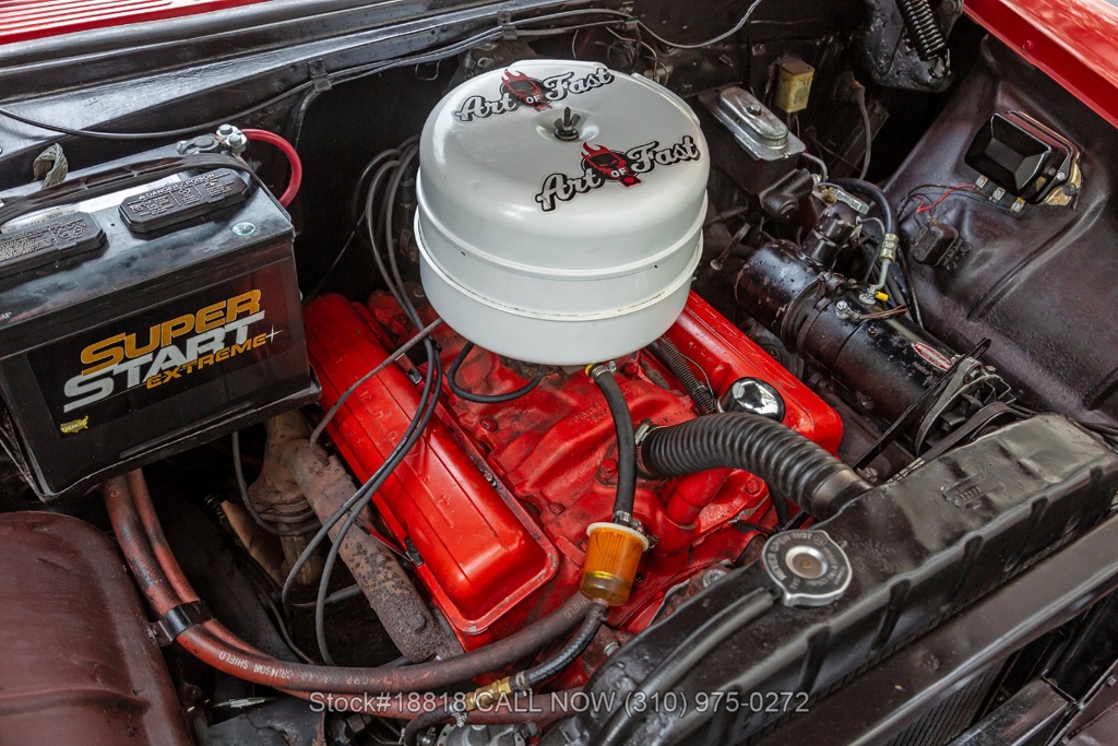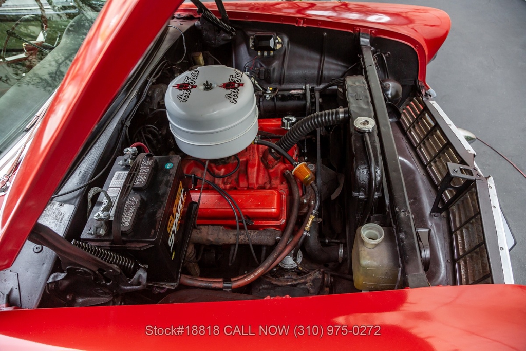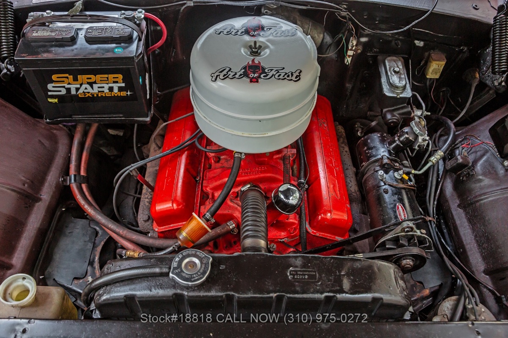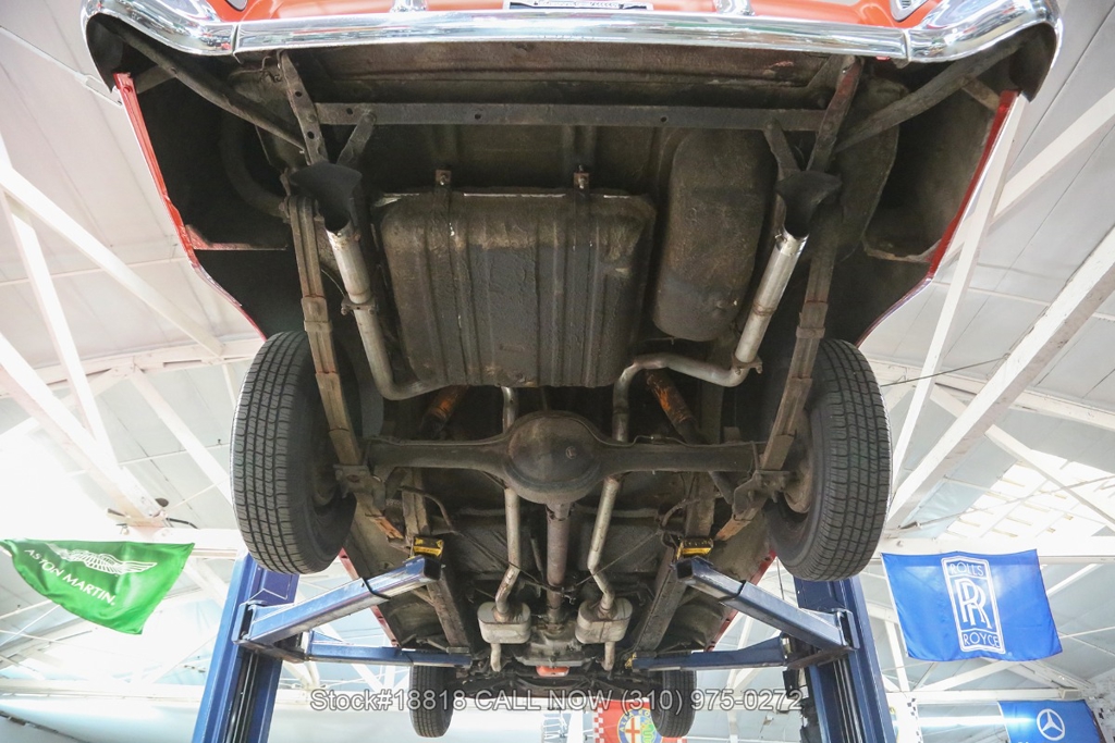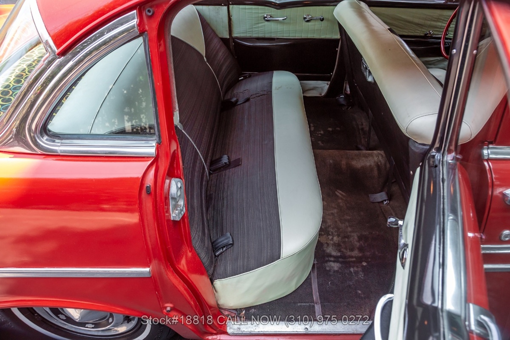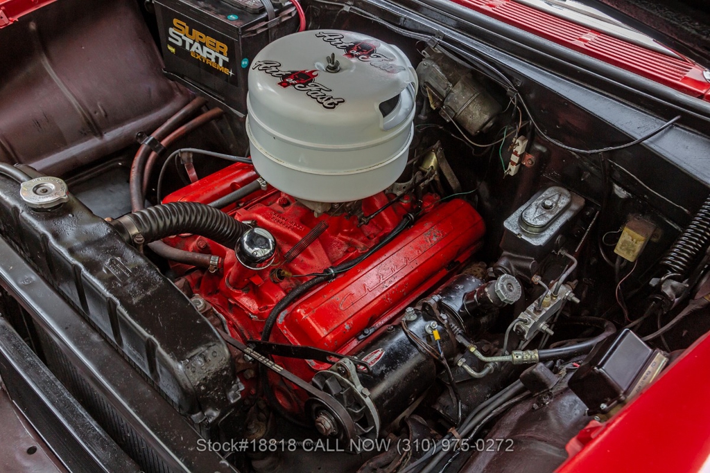 Equipped with an automatic transmission, V8 engine, single-barrel carburetor, dual exhaust tips, chrome bumpers with overriders, a hood ornament, 3-spoke steering wheel with horn, 15-inch steel wheels with Chevrolet hub caps, and a full-size spare tire fitted in the trunk. Convenience features include comfortable bench seats, dual-side rearview mirrors, analog clock, vent windows, and fender-mounted antenna.