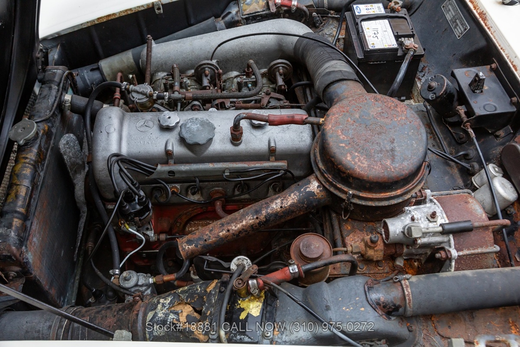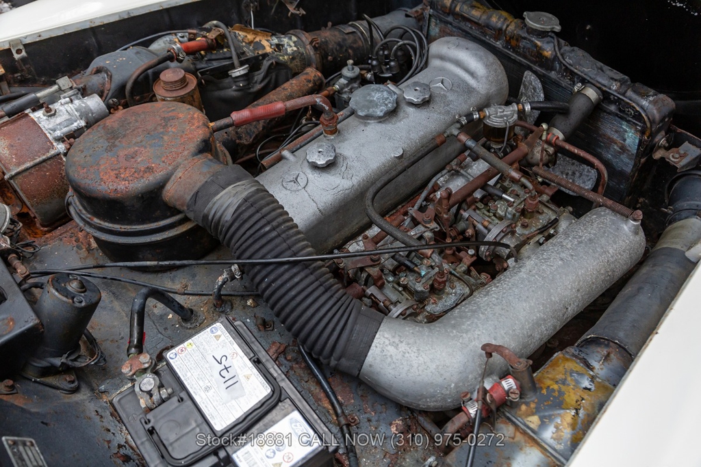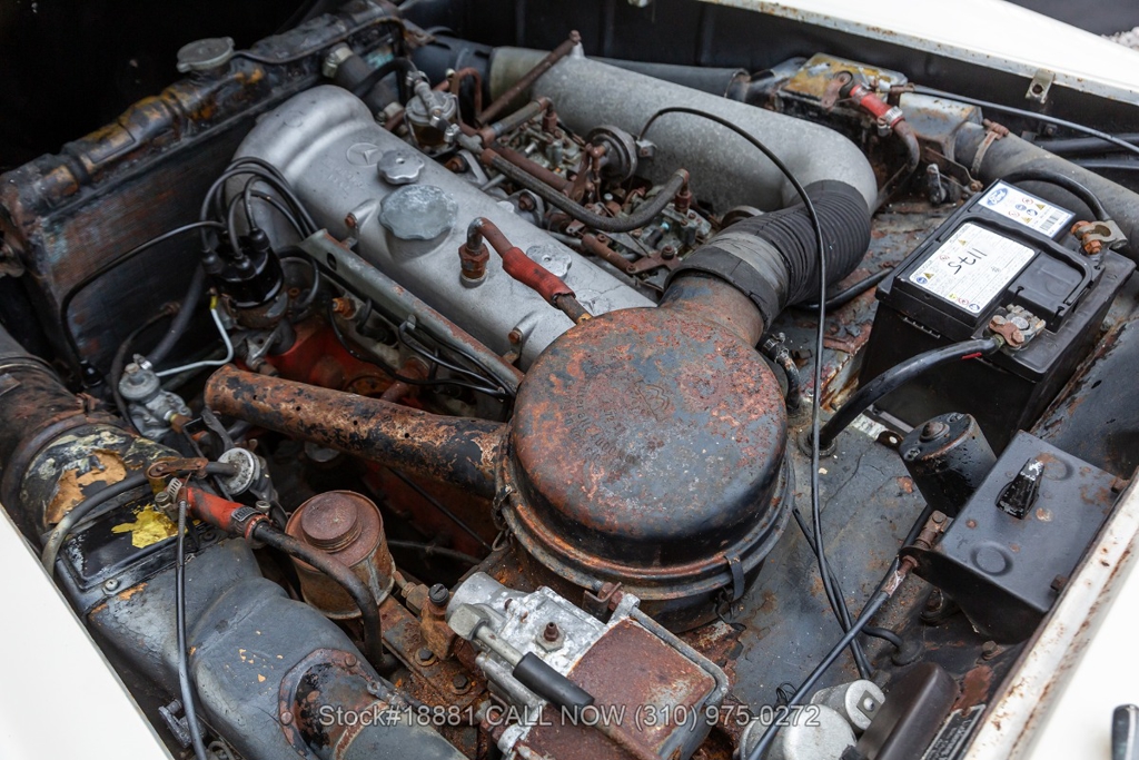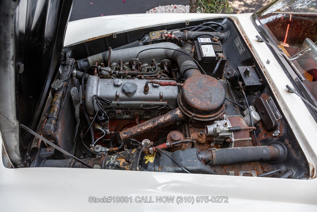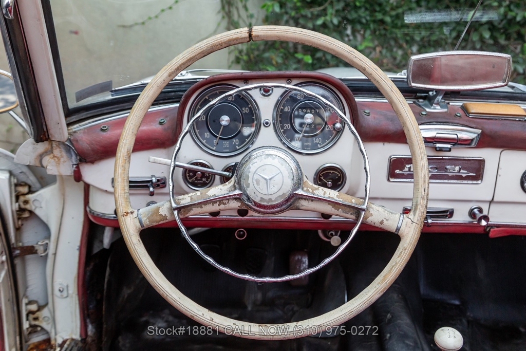 Equipped with a 4-speed manual transmission, inline-four engine, Solex dual carburetors, drum brakes all the way around, floor-mounted shifter, single exhaust outlet, white convertible soft-top, VDO instrumentation, chrome bumpers with overriders, Michelin white-line tires, 13-inch steel wheels, Mercedes-Benz branded hub caps, jack and a full-size spare tire fitted in the trunk. Featured amenities include bucket seating, ivory 2-spoke steering wheel, driver-side mirror, and a dash-mounted rearview mirror.