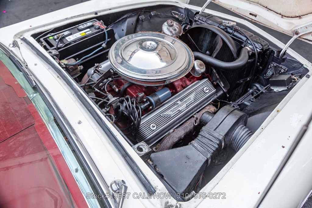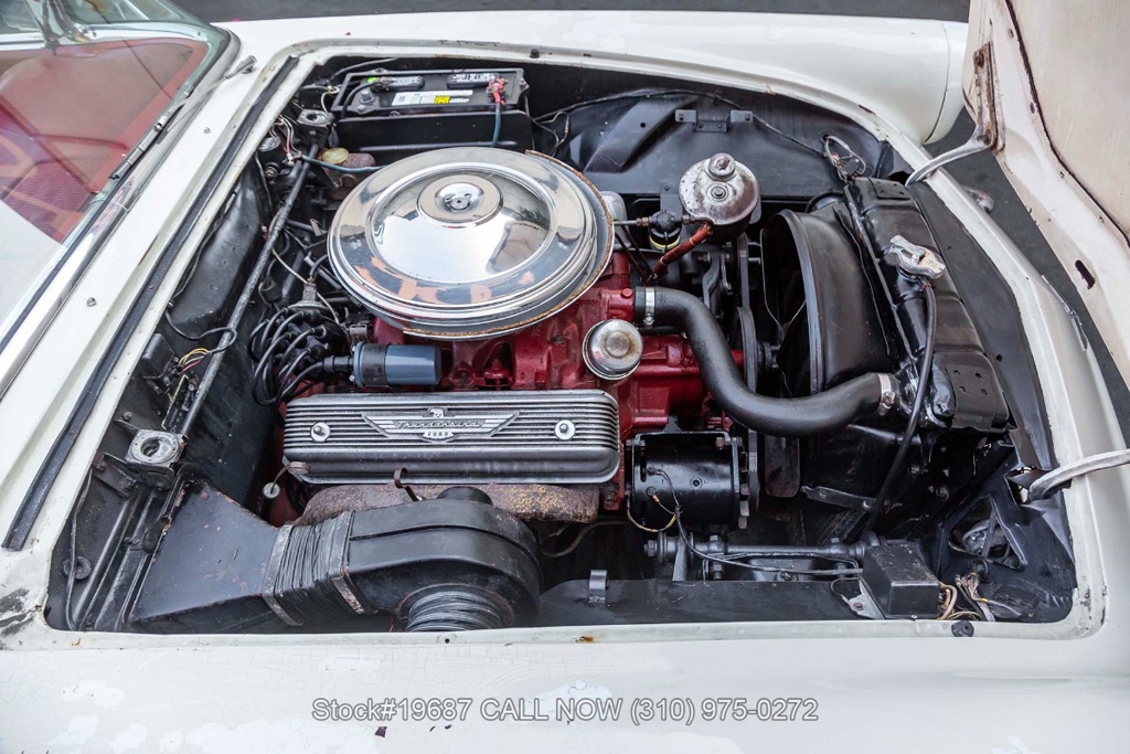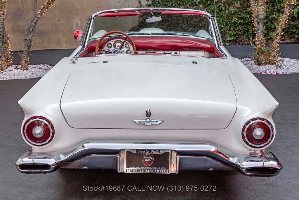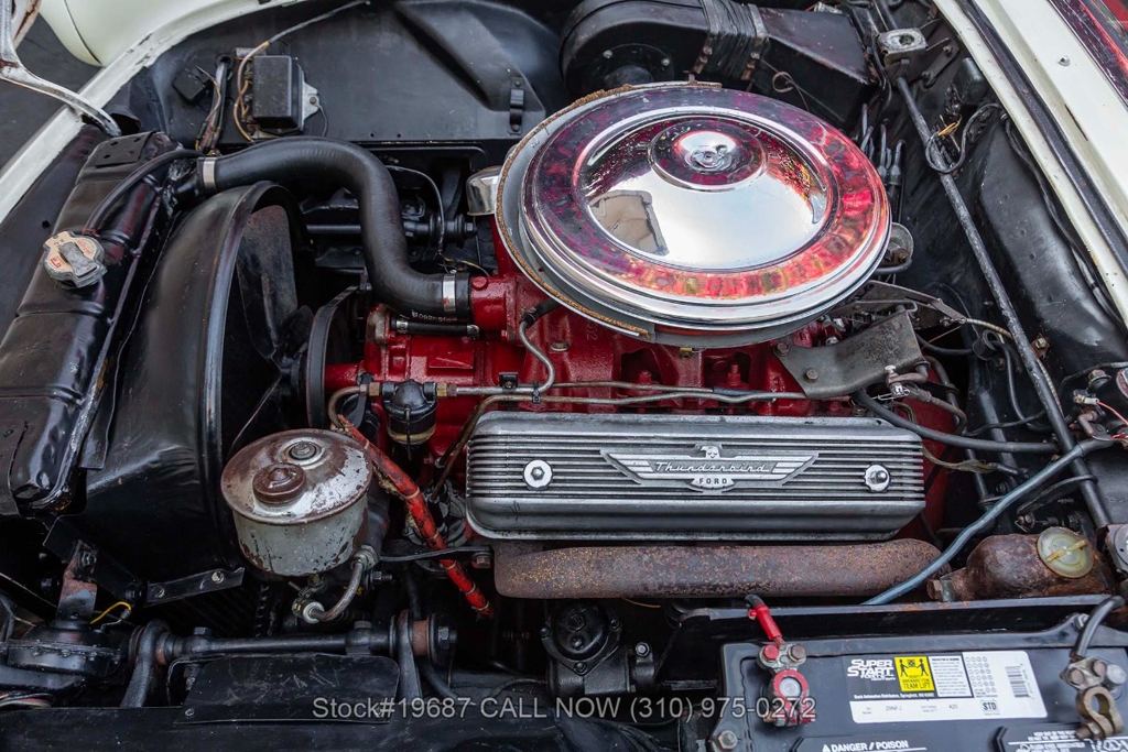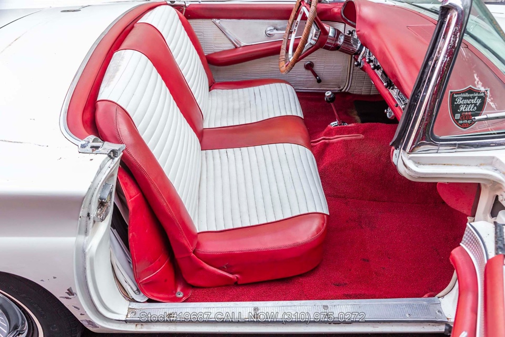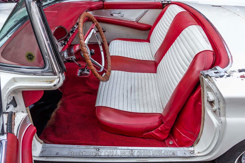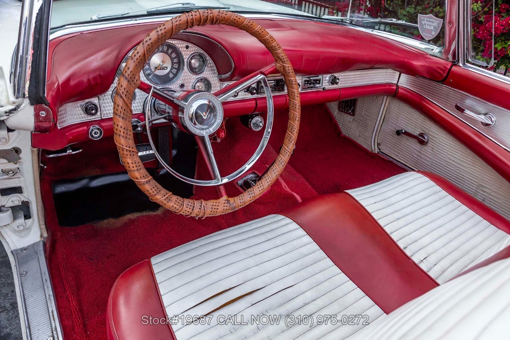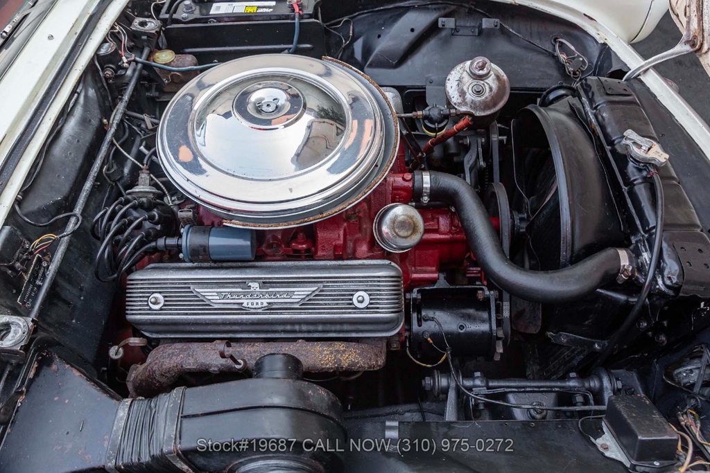 Power comes from a V8 engine paired with an automatic transmission and a 4-barrel carburetor. The design is characterized by its hood scoop, front fender louvers, modest tail fins, rear fender skirts, and chrome trim, all of which contribute to the Thunderbird's recognizable profile without feeling overdone.