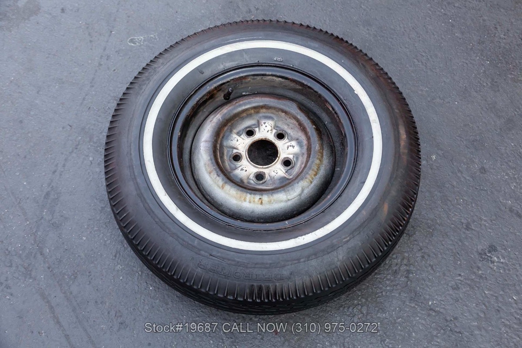Inside, the cabin presents a bench seat, manual crank windows, a three-spoke steering wheel, analog clock, and a push-button stereo. Additional details like the fender-mounted antenna and driver-side rearview mirror reflect the car's original styling approach. It rides on 14-inch steel wheels with Ford hubcaps and thin white-wall tires, complementing the overall look.
