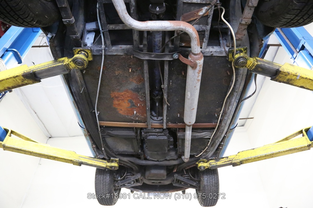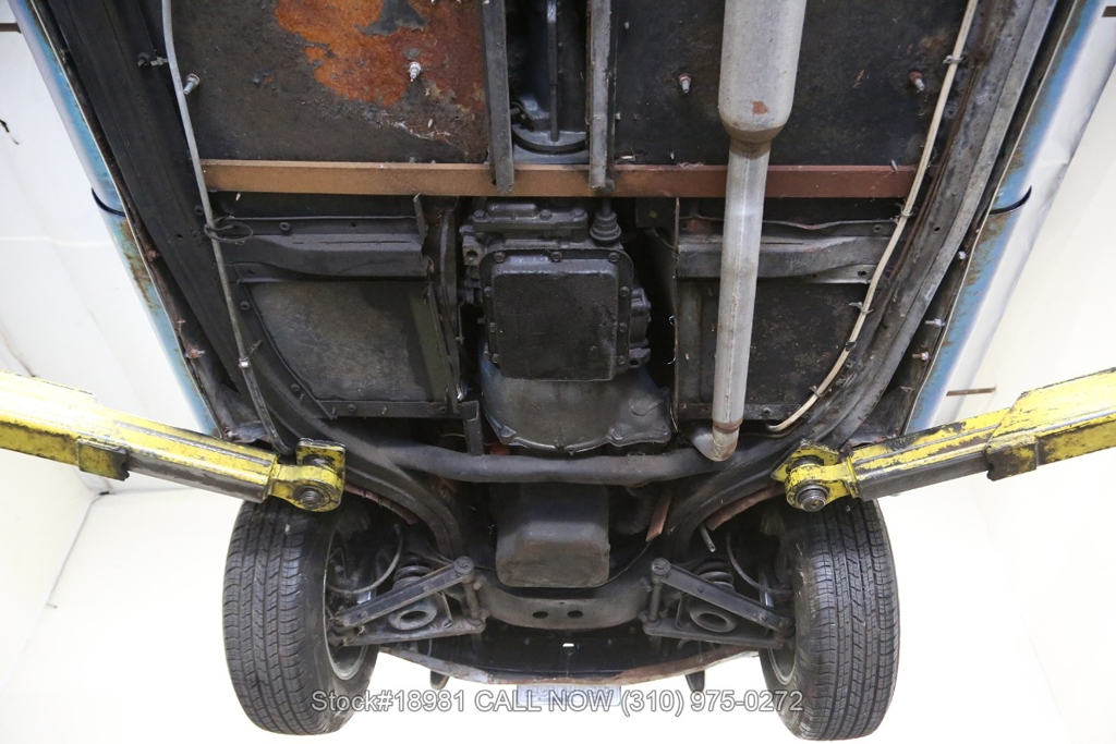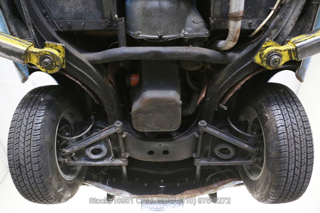 Equipped with an automatic transmission, retrofitted with a Ford inline-4 engine, drum brakes all the way around, single exhaust outlet, chrome bumpers with overriders, whitewall tires, a jack, and 15-inch chrome wheels. Convenience features include front bucket seating, 3-spoke steering wheel, a dash-mounted rearview mirror, and fender-mounted rearview mirrors.