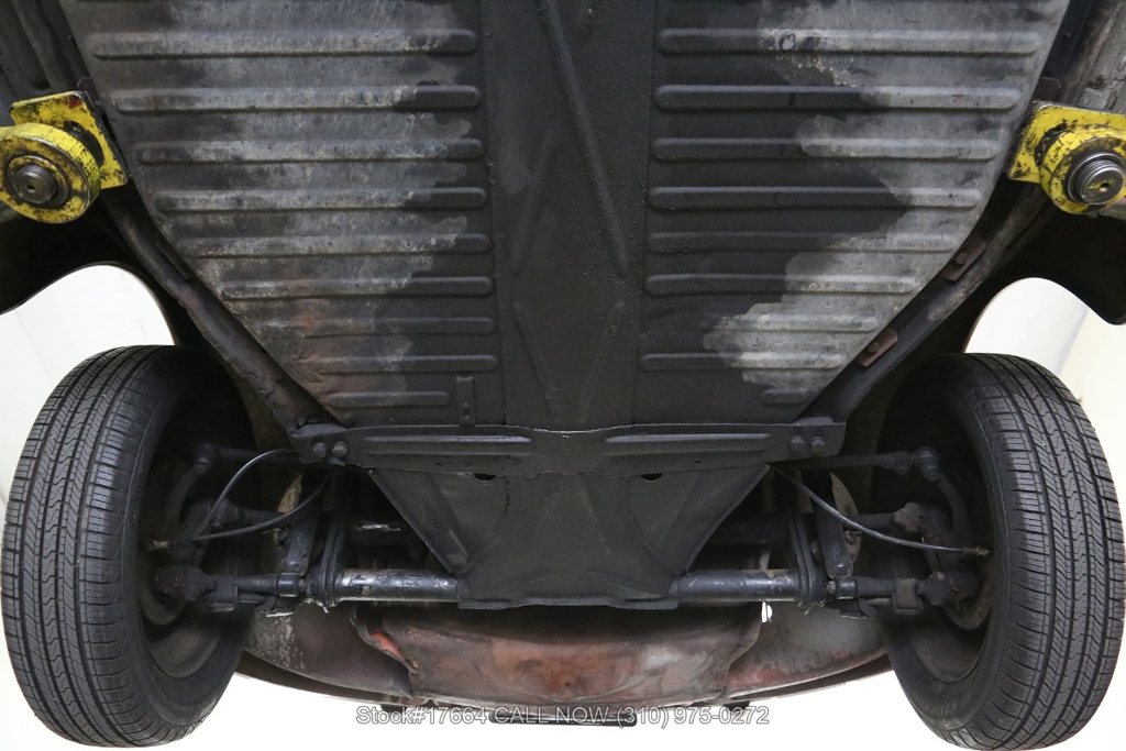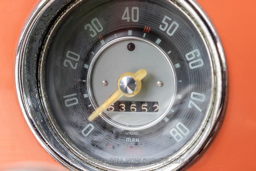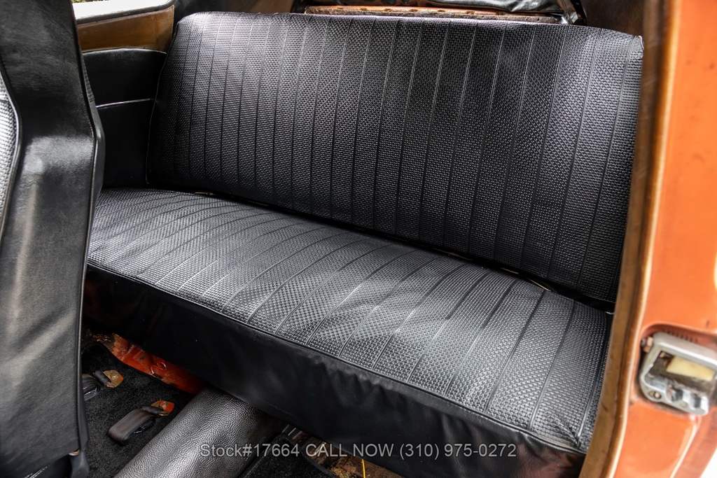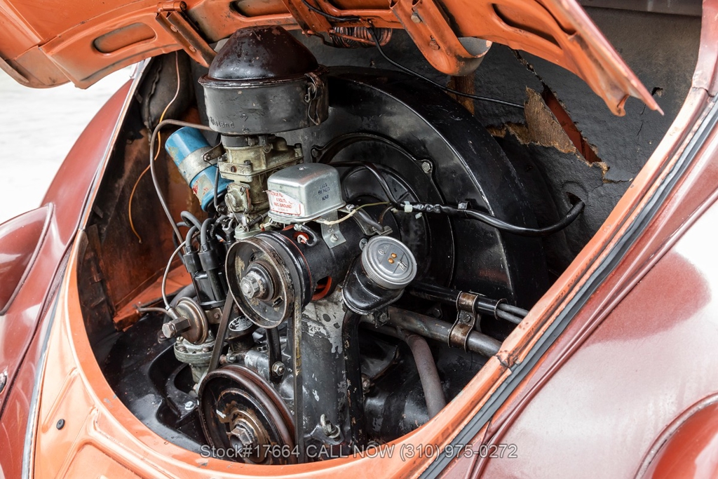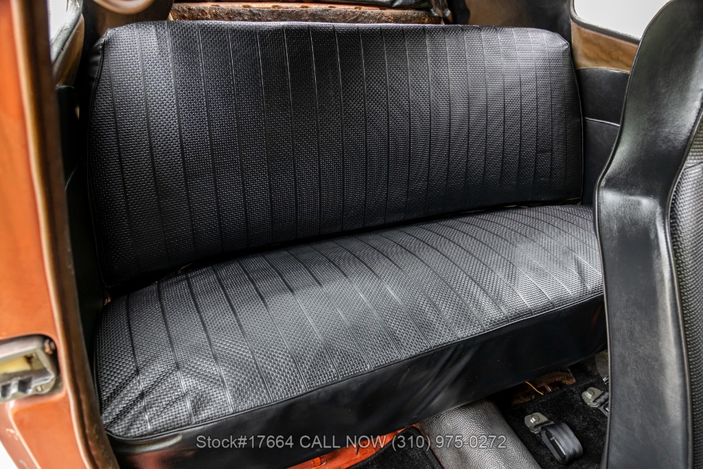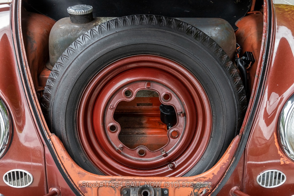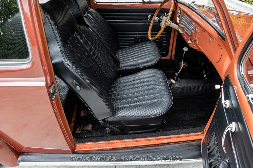 This black-plate California car is equipped with a 4-speed manual transmission, flat-four engine, oval rear window, VDO instrumentation, dual exhaust outlets, floor-mounted shifter, chrome trim, chrome bumpers with overriders, chrome ring headlights, fender-mounted turn signals indicators, 2-spoke steering wheel, 15-inch wheels with Volkswagen hubcaps, jack, and a spare tire fitted in the front trunk. The oval-window design adds a touch of nostalgia to this already iconic vehicle. Additional convenience features include front bucker seats, rear bench seat, manual-crank windows, vent windows, driver-side rearview mirror, driver sun visor, door pockets, and a glove compartment.