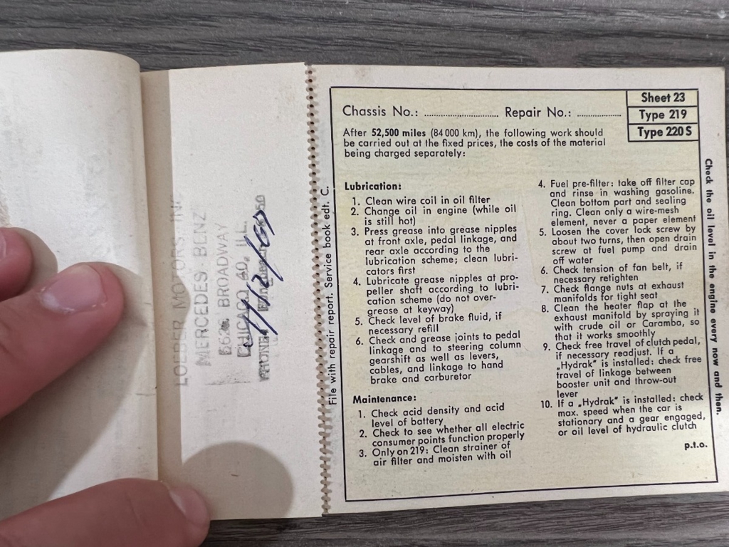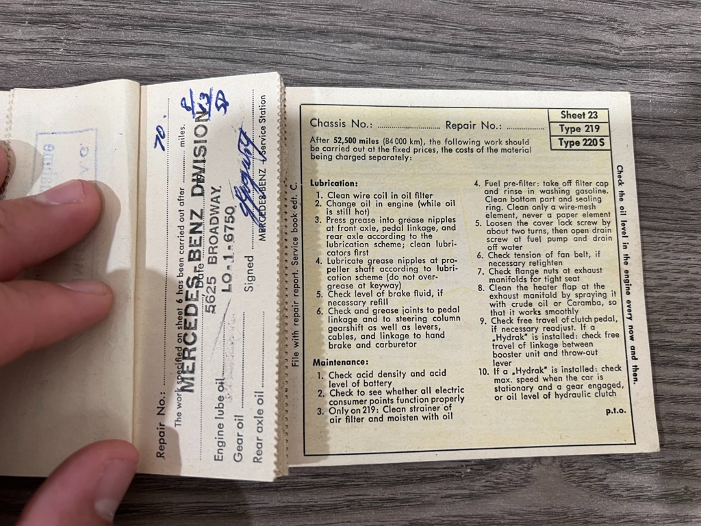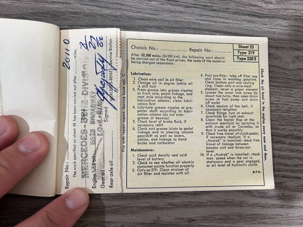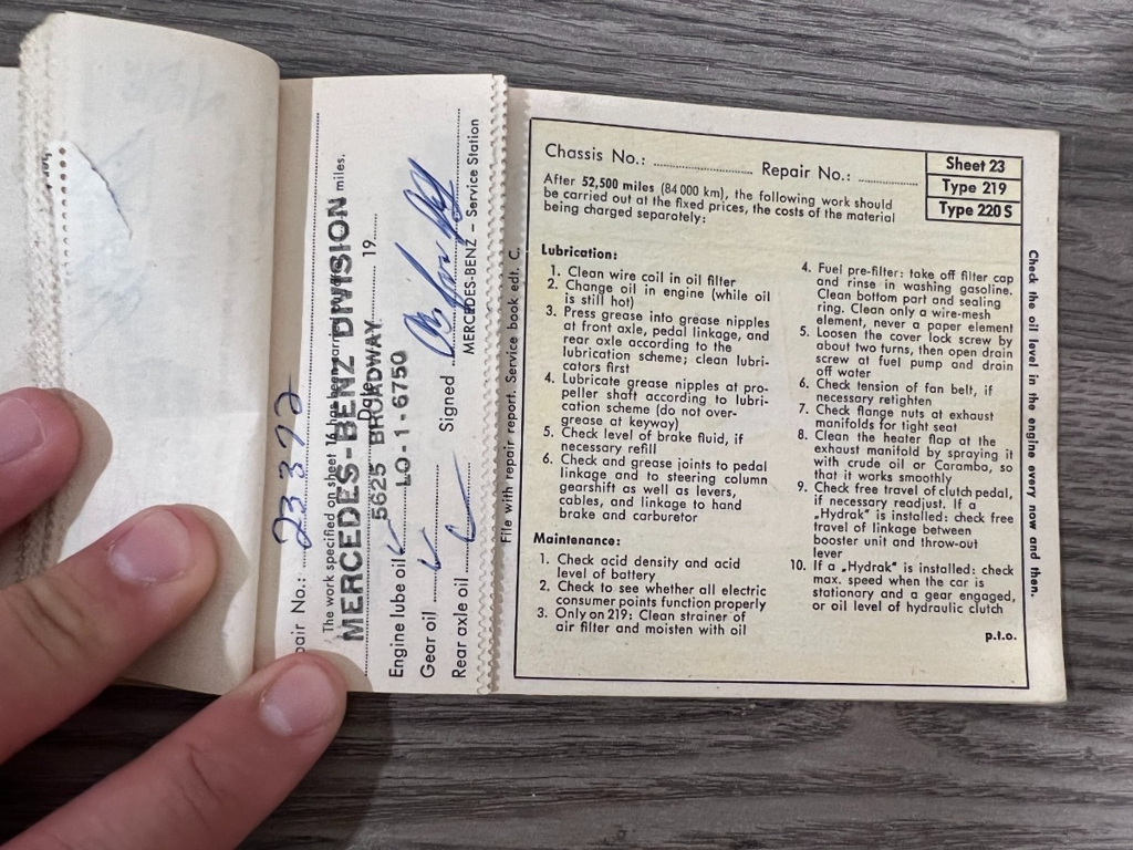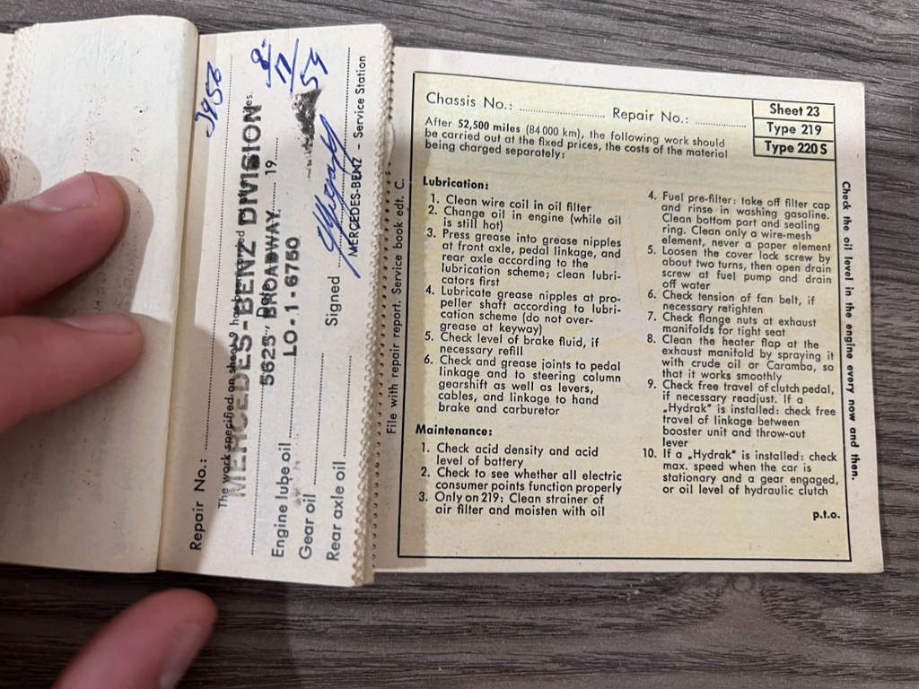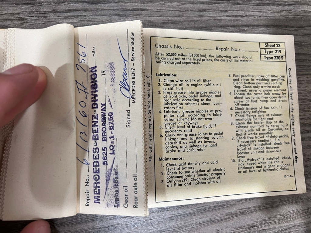 In addition to the equipment, this car also comes with the instruction manual booklet, service booklet with stamps and manufacturer's literature. A highly desirable 220S that has been sitting for many years like a time-capsule just waiting to be brought back to life. For $29,950