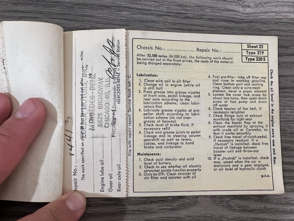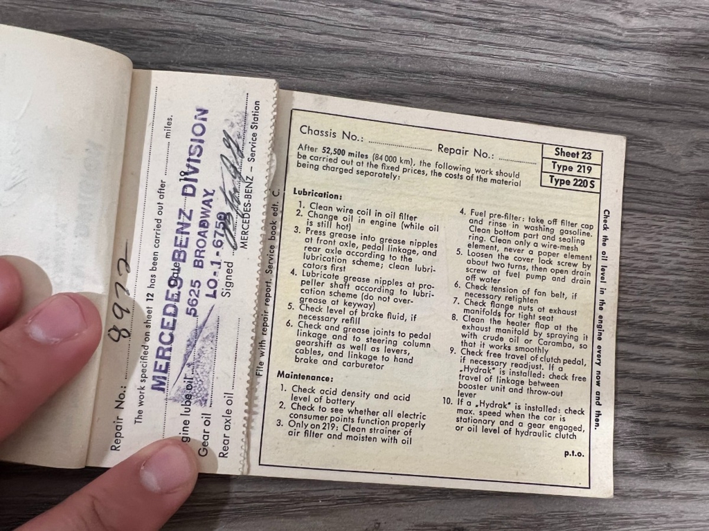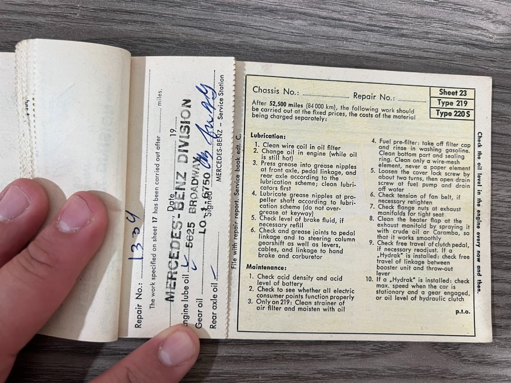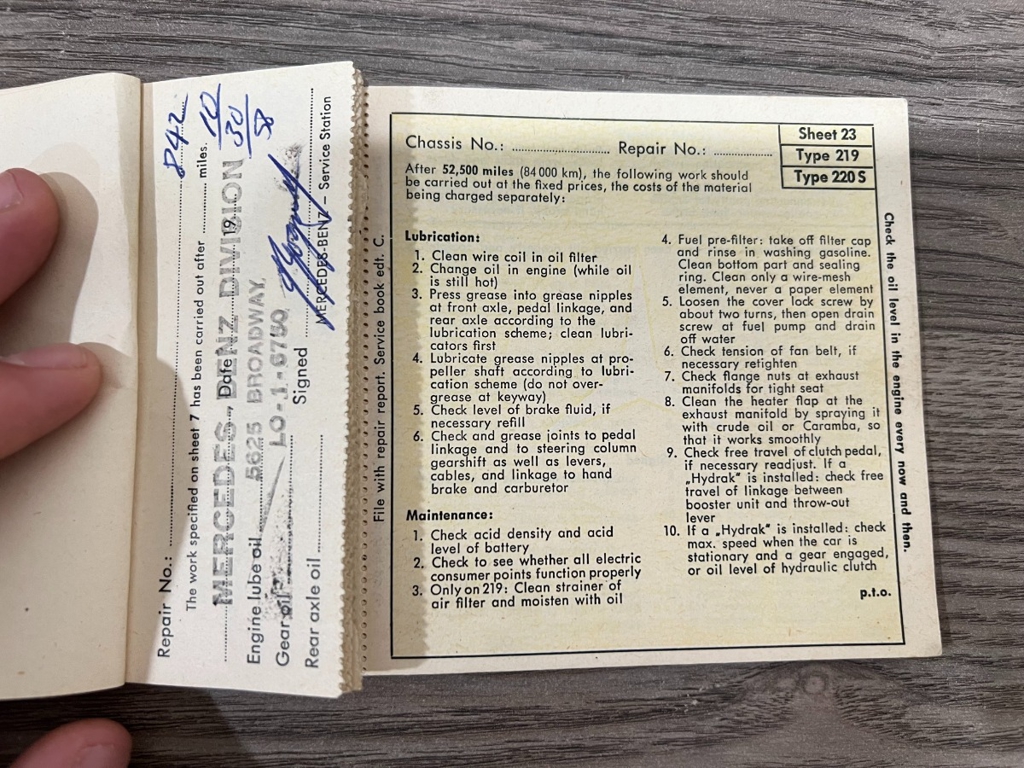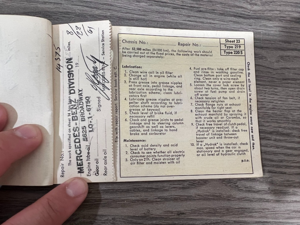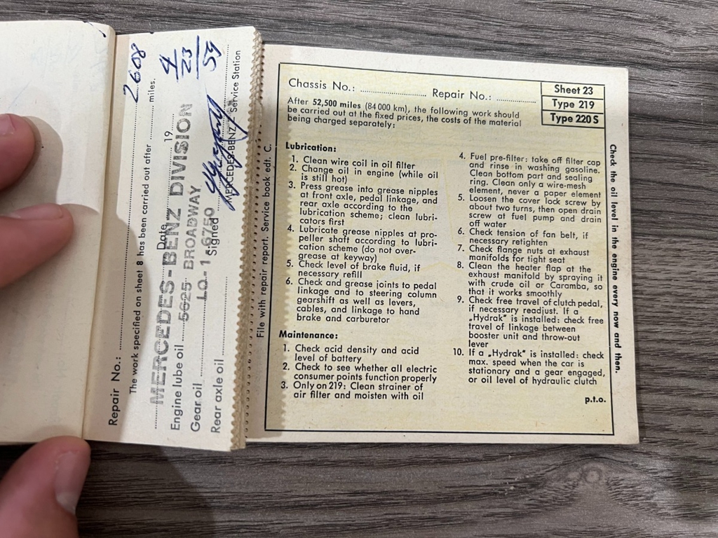 In addition to the equipment, this car also comes with the instruction manual booklet, service booklet with stamps and manufacturer's literature. A highly desirable 220S that has been sitting for many years like a time-capsule just waiting to be brought back to life. For $29,950
