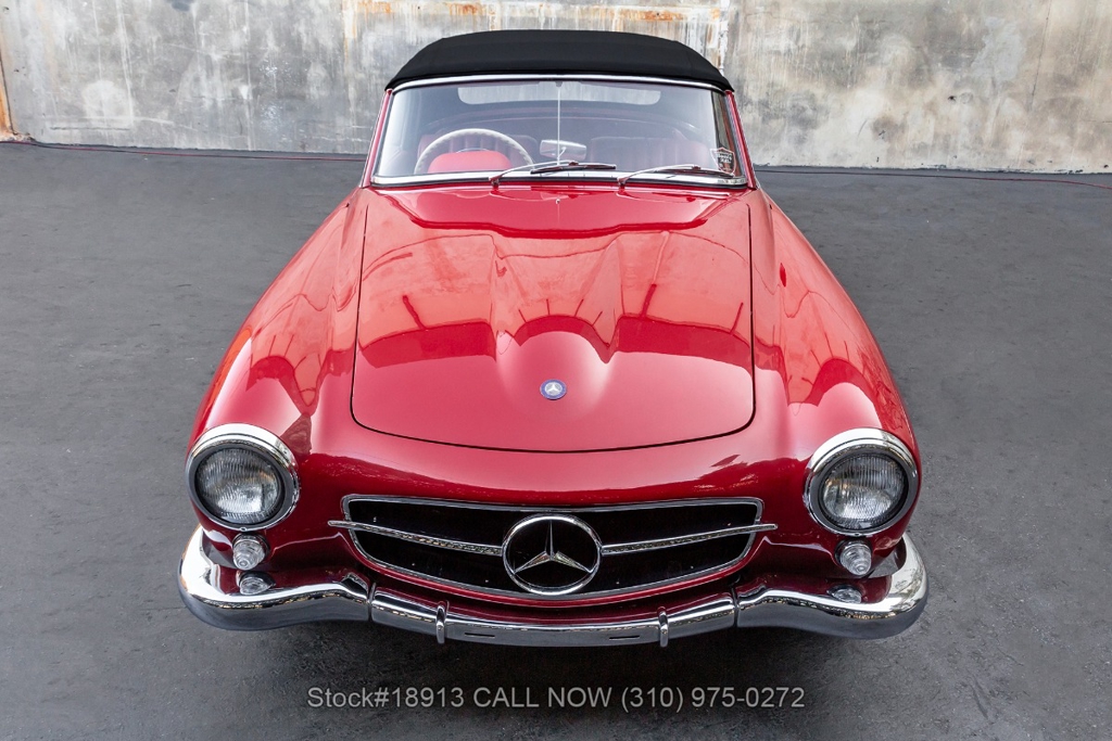 Introducing this 1959 Mercedes-Benz 190SL Right-Hand Drive, a striking example finished in Fire Engine Red, complemented by chrome trim and a matching red interior. A black convertible soft top with a boot cover provides the perfect balance between classic coupe styling and open-air driving enjoyment.