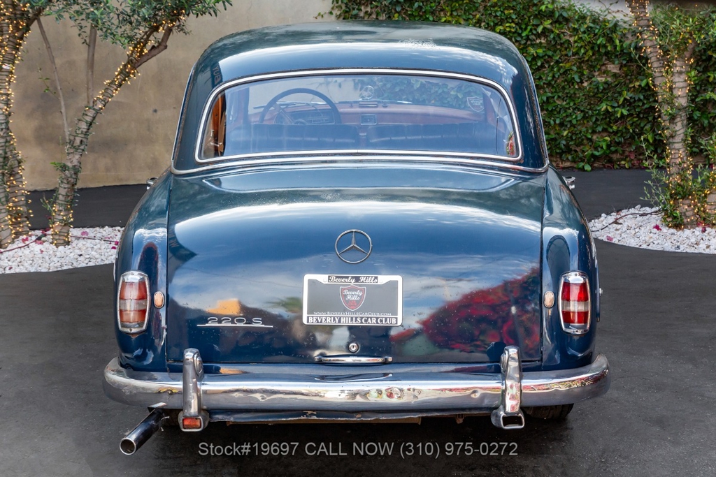 This 220S is equipped with the M180 inline-six paired with a column-shifted 4-speed manual transmission and Solex dual carburetors. Features drum brakes on all four corners, a single exhaust outlet, chrome exterior trim and grille accents, Hella-branded fog lights, and Mercedes-Benz branded hubcaps mounted on 13-inch steel wheels. Additional equipment includes a two-spoke steering wheel with chrome horn ring, VDO instrumentation, a factory-style jack, and a full-size spare stored in the trunk.