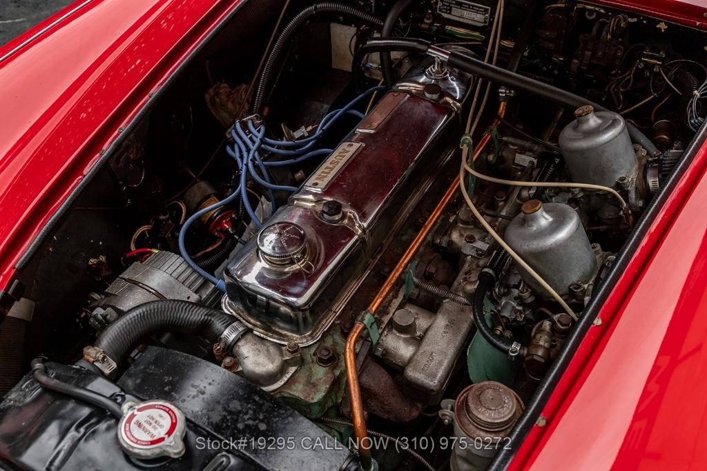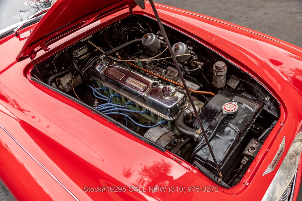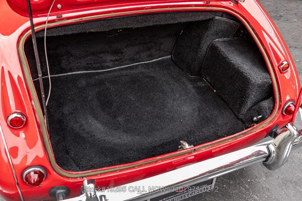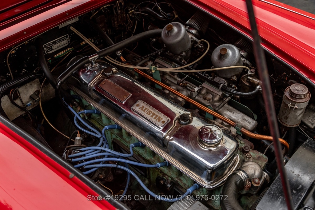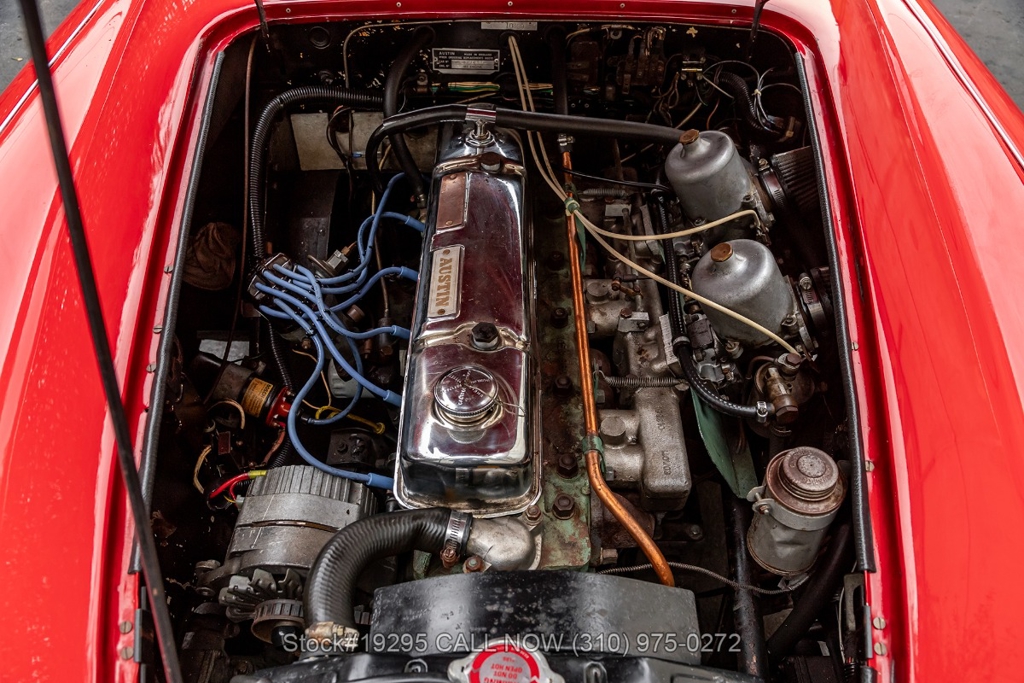 Under the bonnet, this Austin-Healey is powered by a 2,912cc inline 6-cylinder engine, SU dual carburetors, and a 4-speed manual transmission. Additional equipment includes drum brakes all the way around, floor-mounted shifter, dual exhaust outlets, Smiths instrumentation, chrome trim/bumpers, 15-inch wire wheels with knock-off spinners, and a full-size spare tire fitted in the trunk. Convenience features include a pair of bucket seats, a dash-mounted rearview mirror, 3-spoke steering wheel, and a passenger dash grab handle.