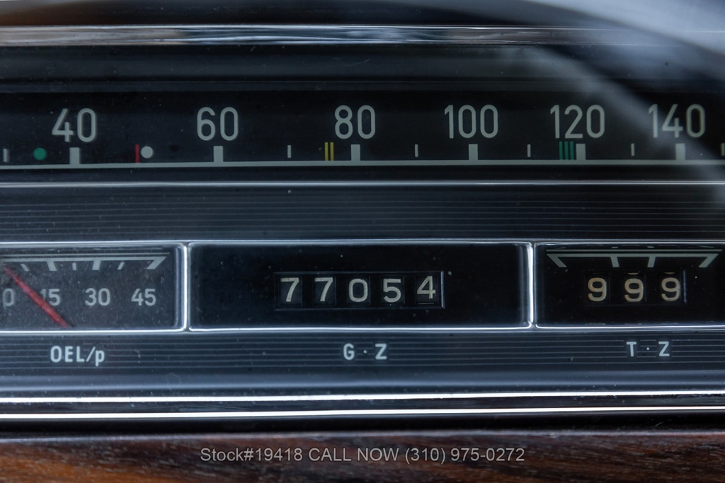 Power comes from the desirable fuel-injected M127 inline-six, paired with a 4-speed manual transmission that delivers an engaging, analog driving experience. Additional equipment includes a single exhaust outlet, VDO instrumentation, front fog lights, a two-spoke steering wheel with chrome horn ring, extensive chrome accents, wrap-around chrome bumpers with overriders, and a beautifully finished wood dashboard. The car rides on Hankook white-line tires mounted on steel wheels with Mercedes-Benz hubcaps, and a full-size spare is neatly stored in the trunk.