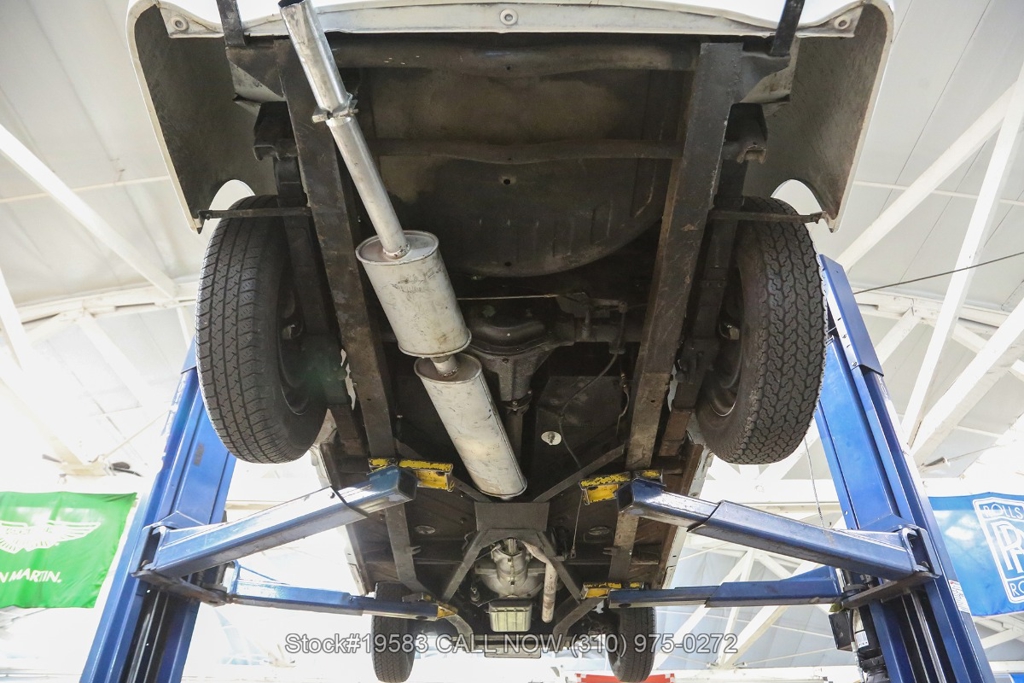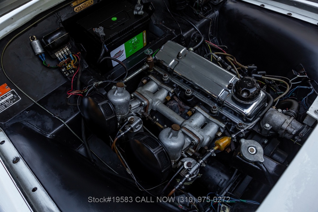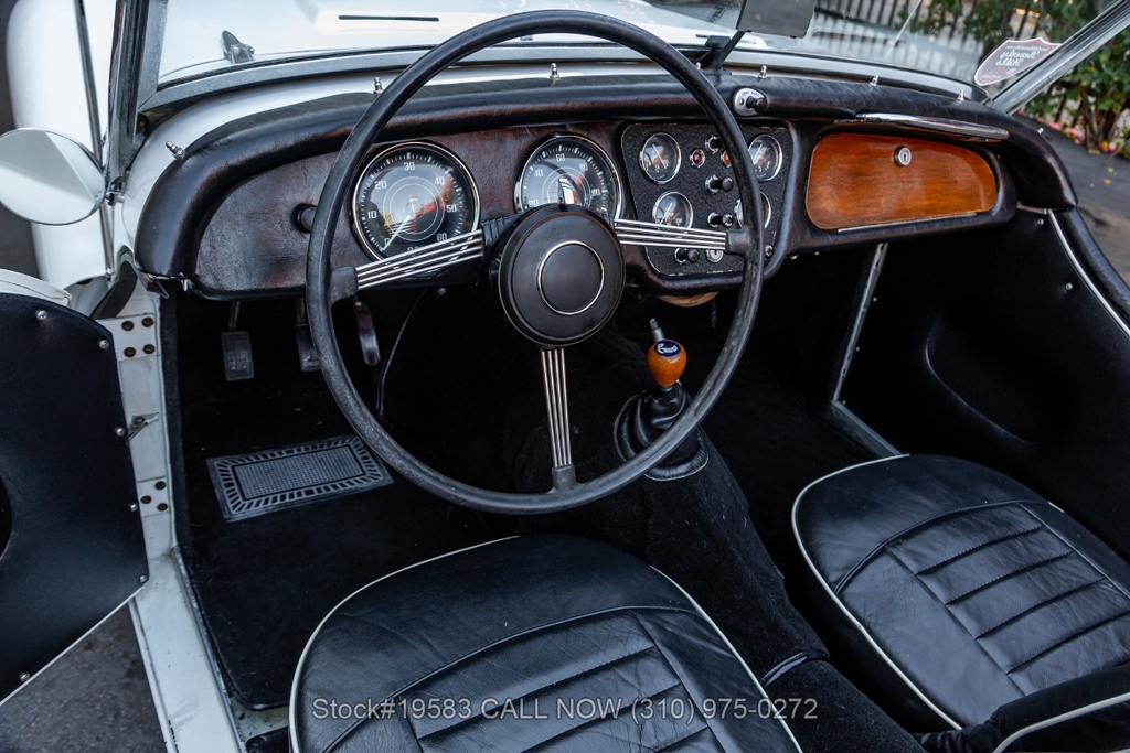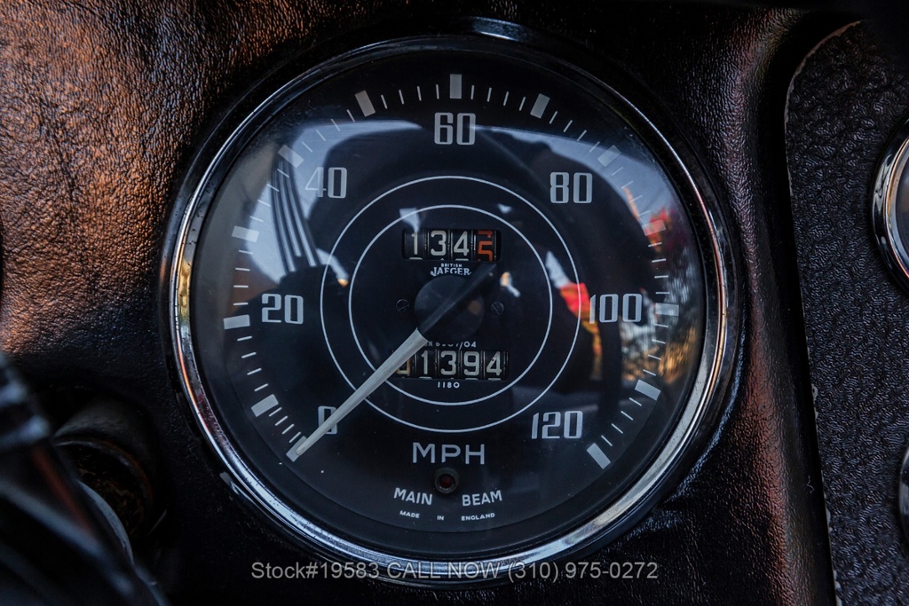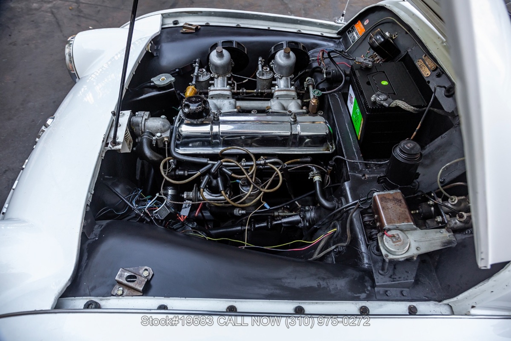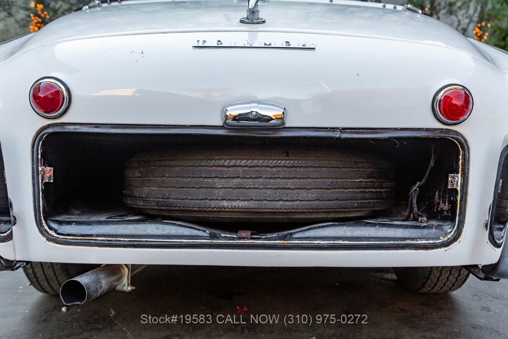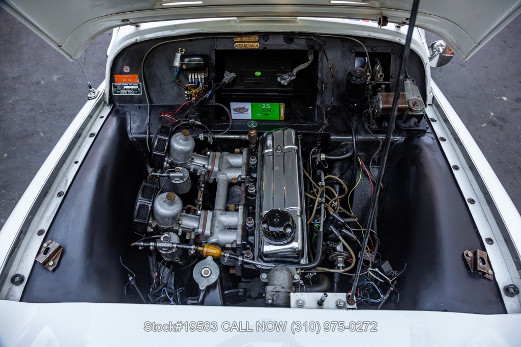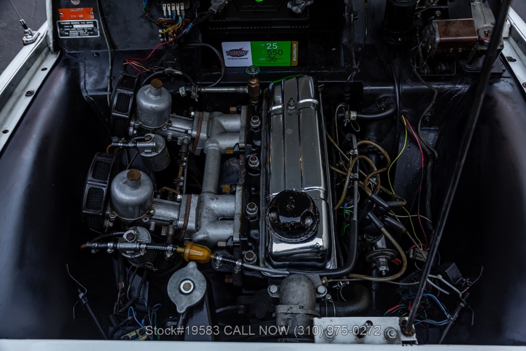 Power comes from a 1,991cc inline-four engine paired with a 4-speed manual transmission and fed by dual SU carburetors. This classic car is also equipped with front-wheel disc brakes, an impressive feature for its time, as the TR3 was one of the first production cars to offer front disc brakes, helping set a new standard for sports car braking performance in the late 1950s. Additional equipment includes a single exhaust outlet, Jaeger/Lucas instrumentation, a banjo-style steering wheel, floor-mounted shifter, chrome trim, front chrome bumper with overriders, 15-inch steel wheels wrapped in Centennial tires, and a full-size spare tire stored in the rear compartment.