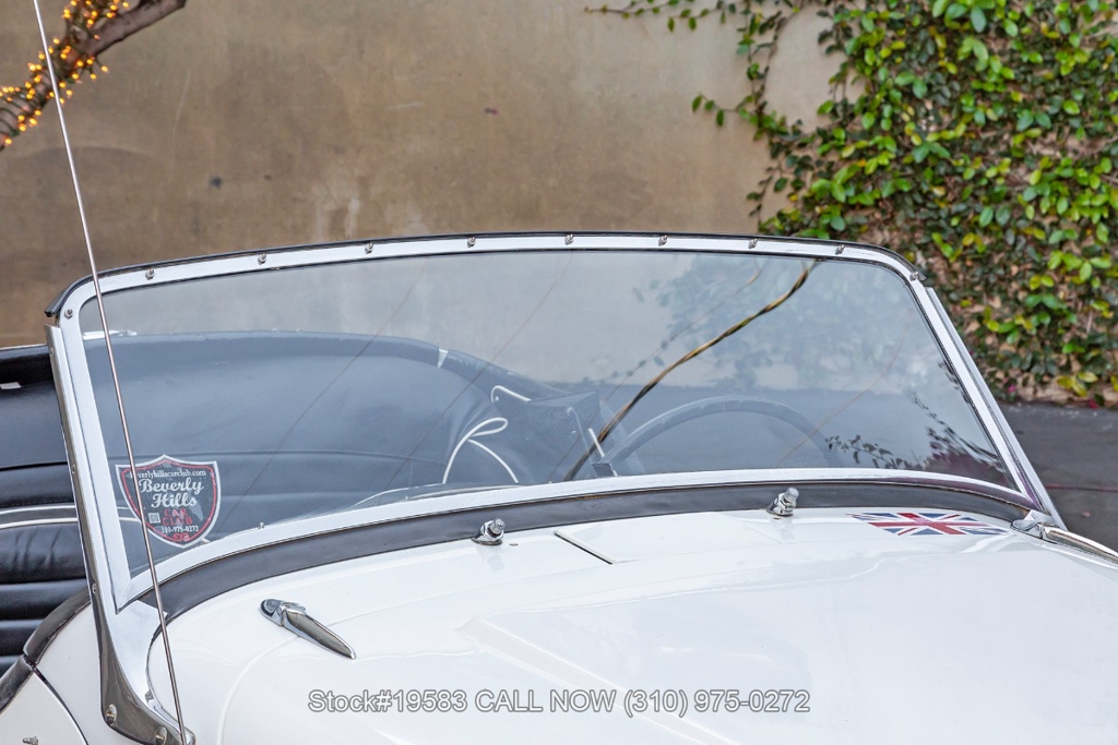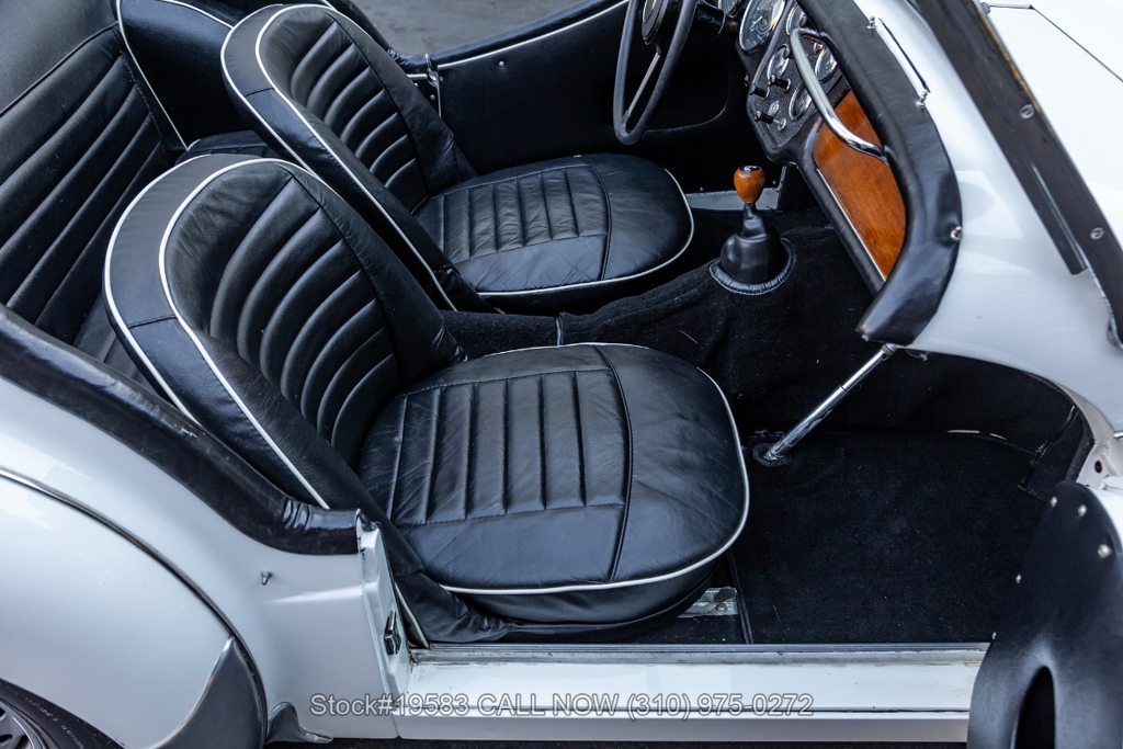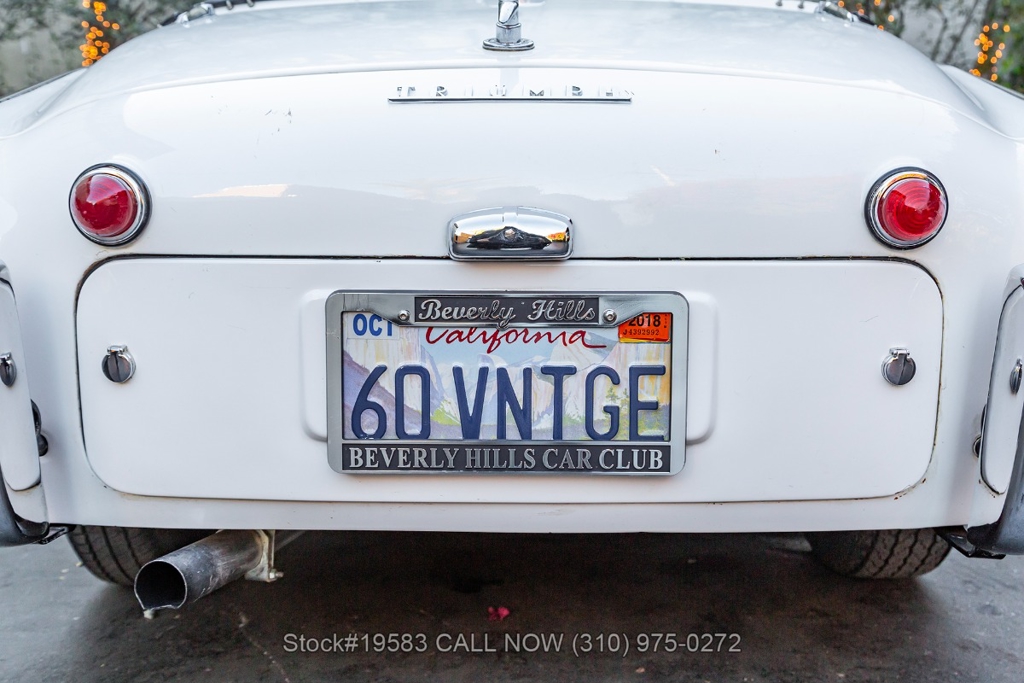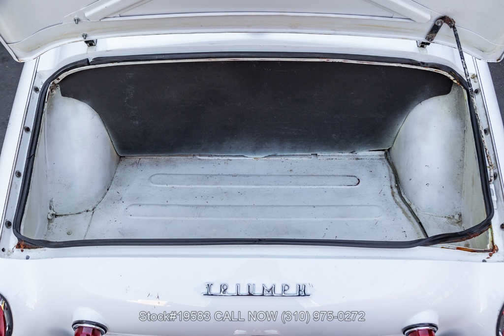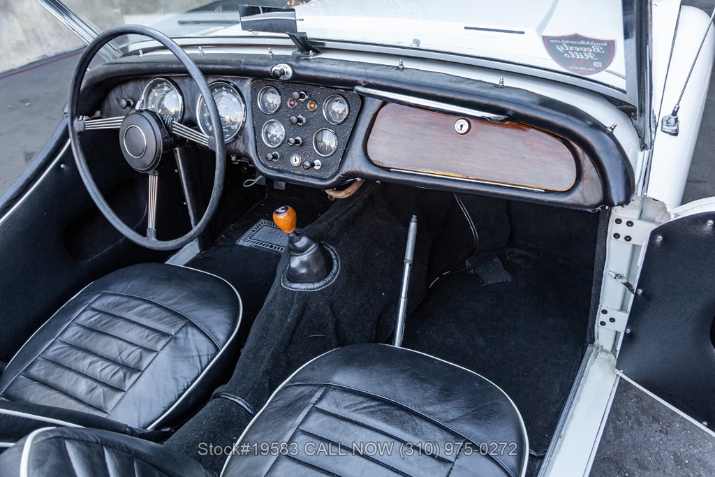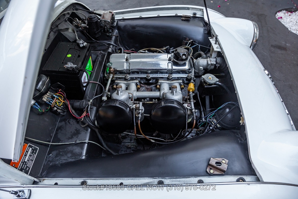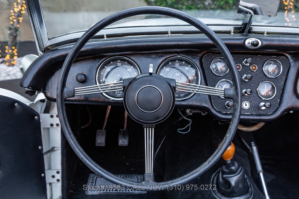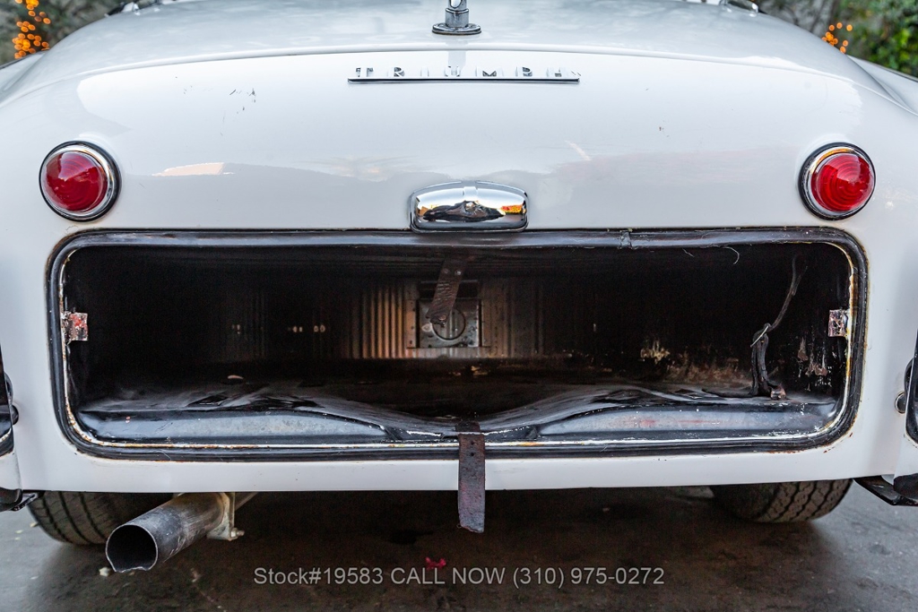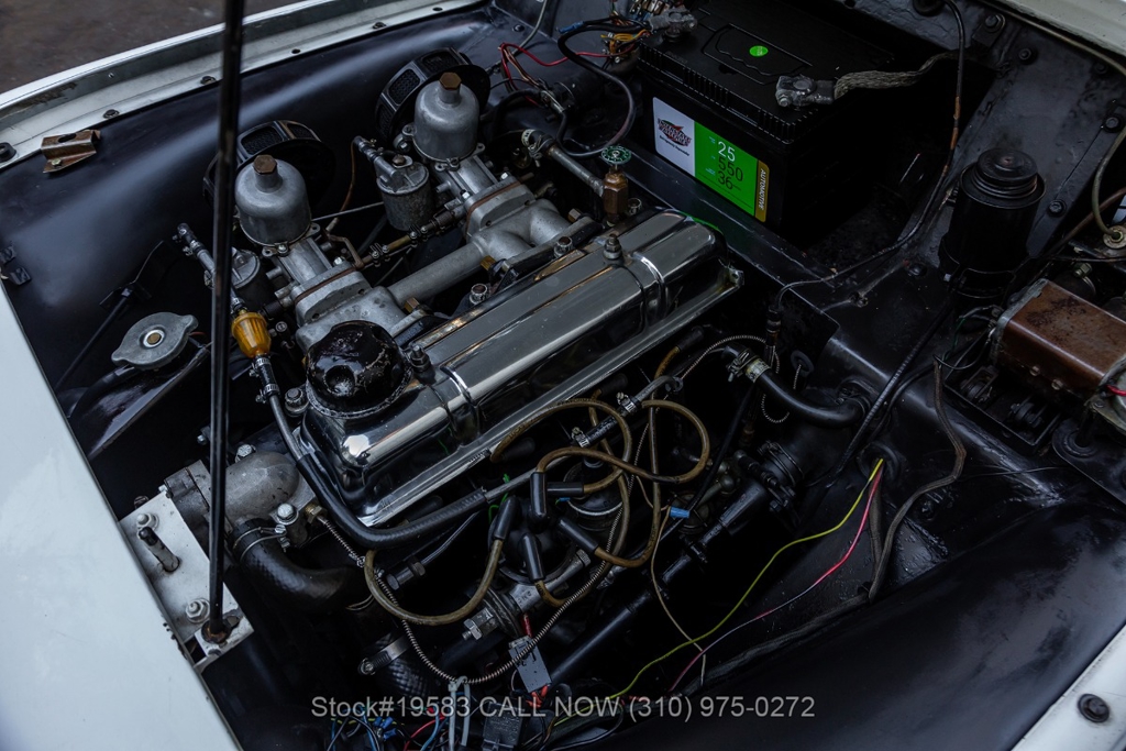 Power comes from a 1,991cc inline-four engine paired with a 4-speed manual transmission and fed by dual SU carburetors. This classic car is also equipped with front-wheel disc brakes, an impressive feature for its time, as the TR3 was one of the first production cars to offer front disc brakes, helping set a new standard for sports car braking performance in the late 1950s. Additional equipment includes a single exhaust outlet, Jaeger/Lucas instrumentation, a banjo-style steering wheel, floor-mounted shifter, chrome trim, front chrome bumper with overriders, 15-inch steel wheels wrapped in Centennial tires, and a full-size spare tire stored in the rear compartment.
