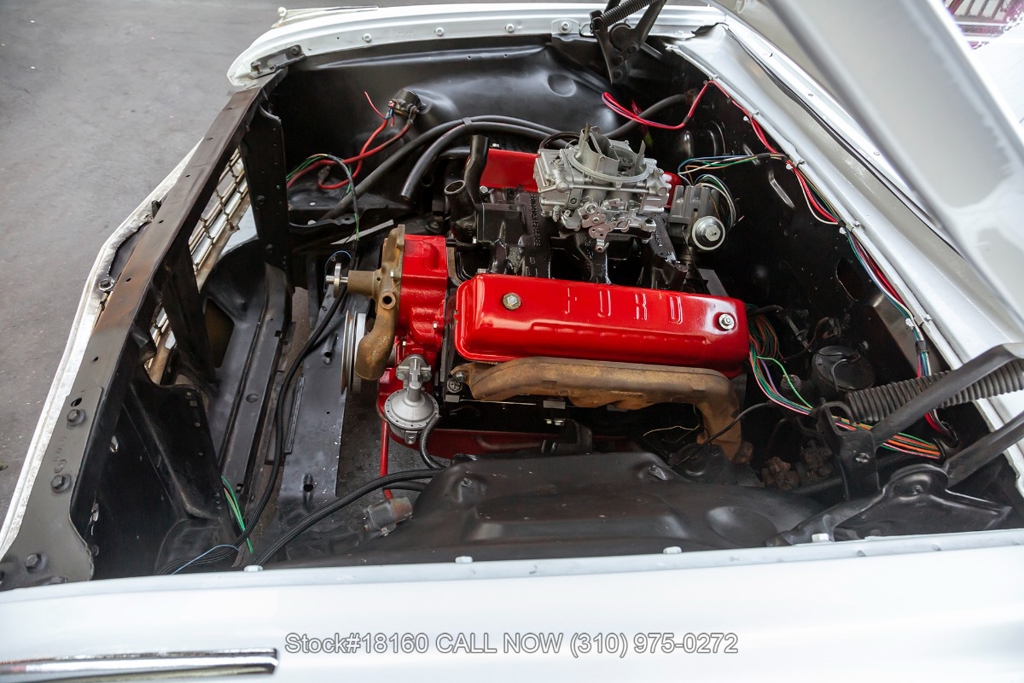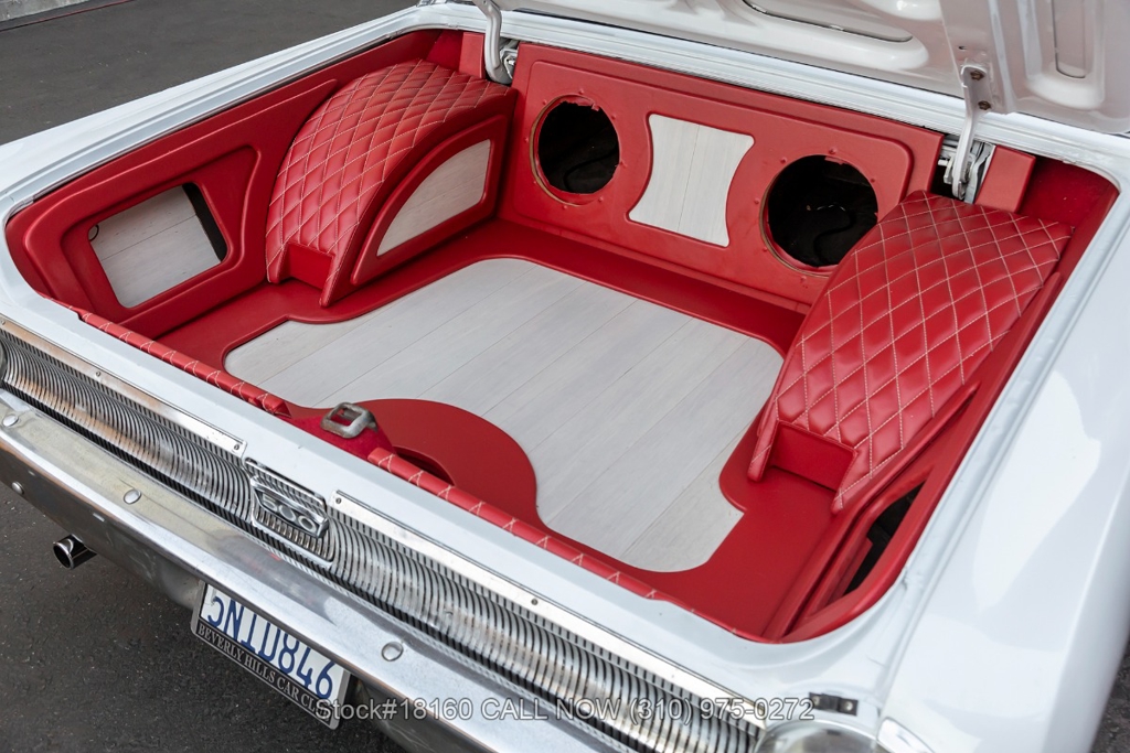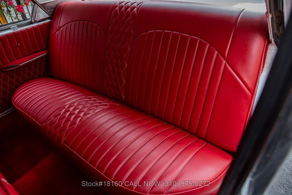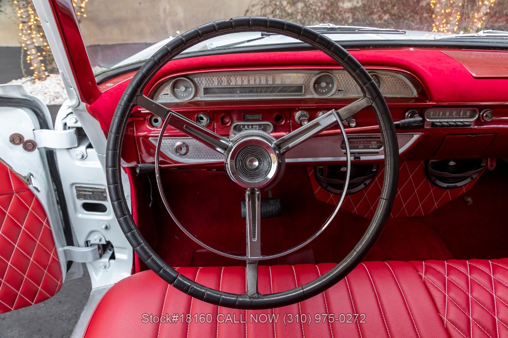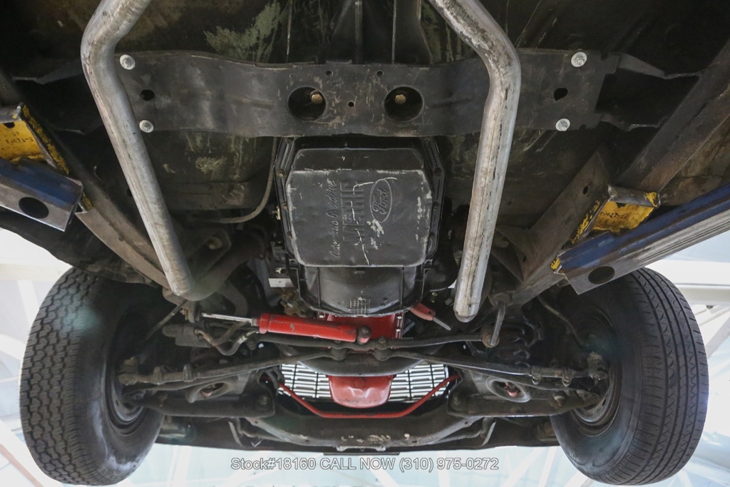 Equipped with a Cruise-O-Matic transmission, V8 engine, Holley 4-barrel carburetor, chrome trim/bumpers, quadruple headlights, 3-spoke steering wheel with a horn, and 14-inch steel wheels with Ford hub caps. Featured amenities include comfortable bench seating, driver-side rearview mirror, vent windows, quarter windows, retro radio, glove compartment, and stylish trunk storage.