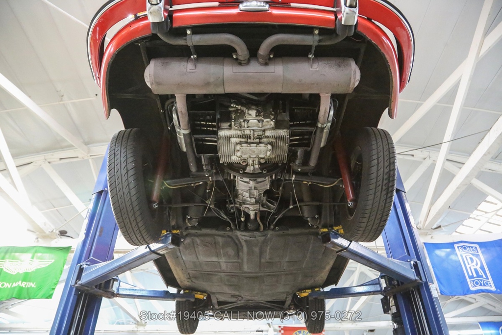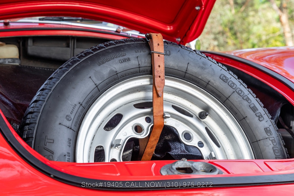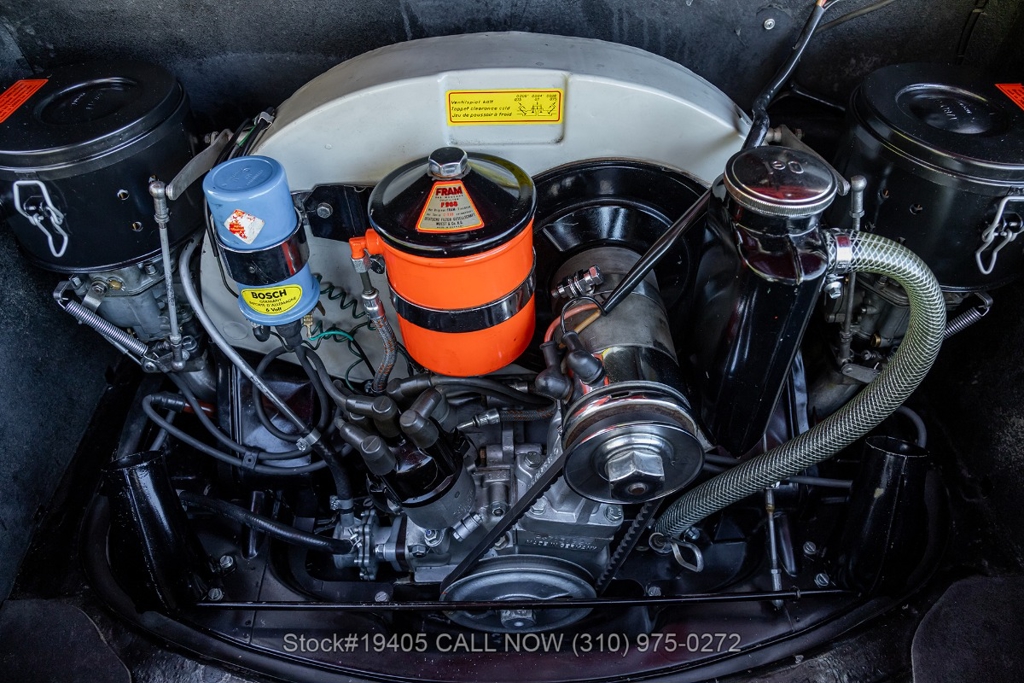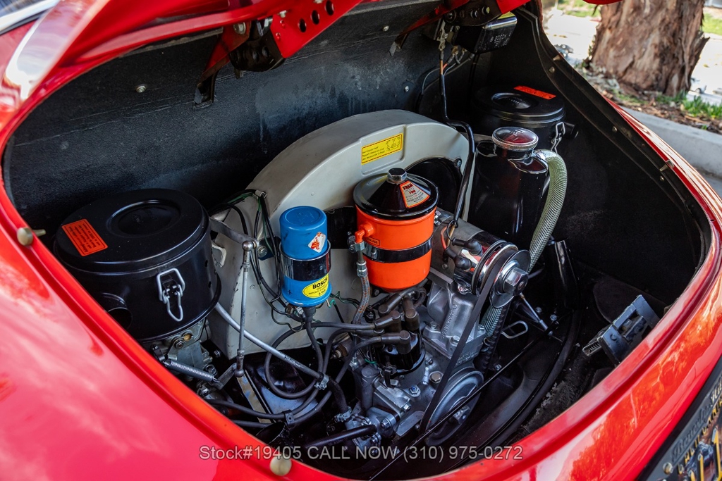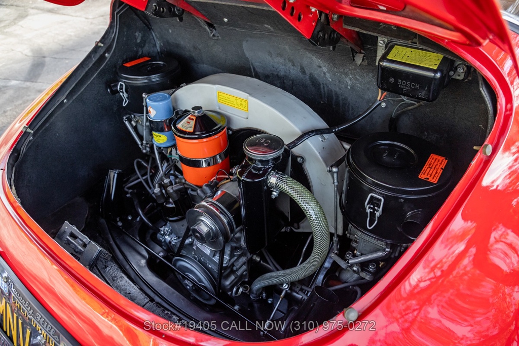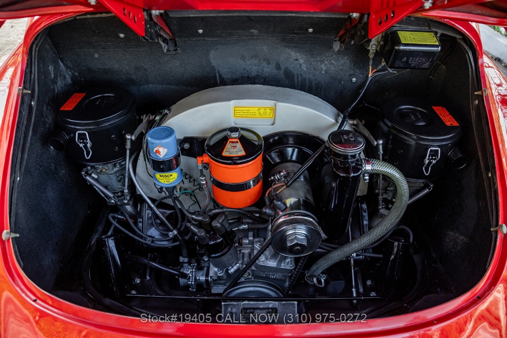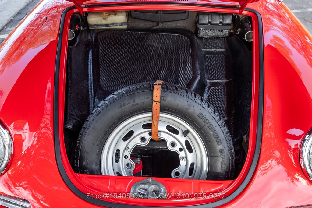 Power comes from a 1600c flat-four engine paired with a 4-speed manual transmission, delivering the engaging, analog driving experience that made the 356 legendary. Equipment includes period-correct Zenith dual carburetors, drum brakes at all four corners, VDO gauges, chrome headlight rings, body-color bumpers with chrome overriders, a wood-rim three-spoke steering wheel, and classic Moon-style chrome hubcaps with Porsche crest wrapped in Kumho tires on 15-inch steel wheels. The front trunk houses a full-size spare and jack, just as Porsche intended.