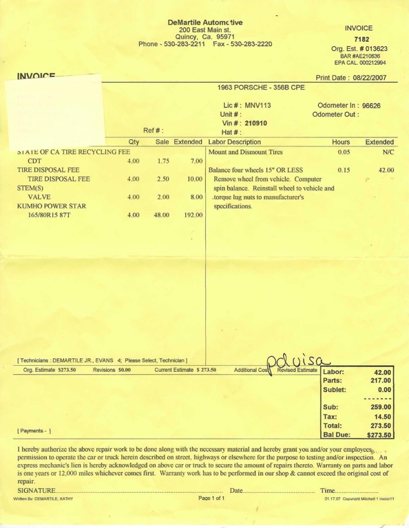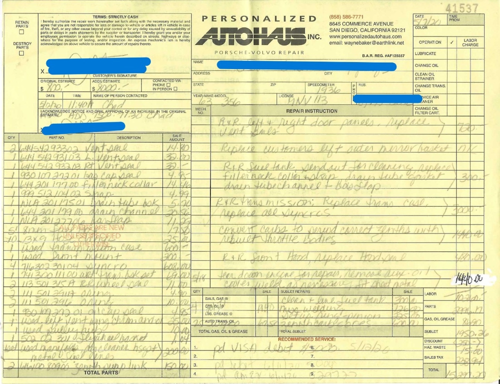 This 356B is accompanied by $21,637.67 in documented service receipts, with major work completed in May 2020. That service included a complete transmission rebuild with a new case and synchros, conversion to period-correct Zenith carburetors with rebuilt throttle bodies, and extensive engine work including a front cover installation. Additional maintenance includes a full brake service, resealed left axle tube, replacement fuel tank and sending unit, new Kumho Power Star tires, a 6-volt battery replacement, and refreshed door and window seals.