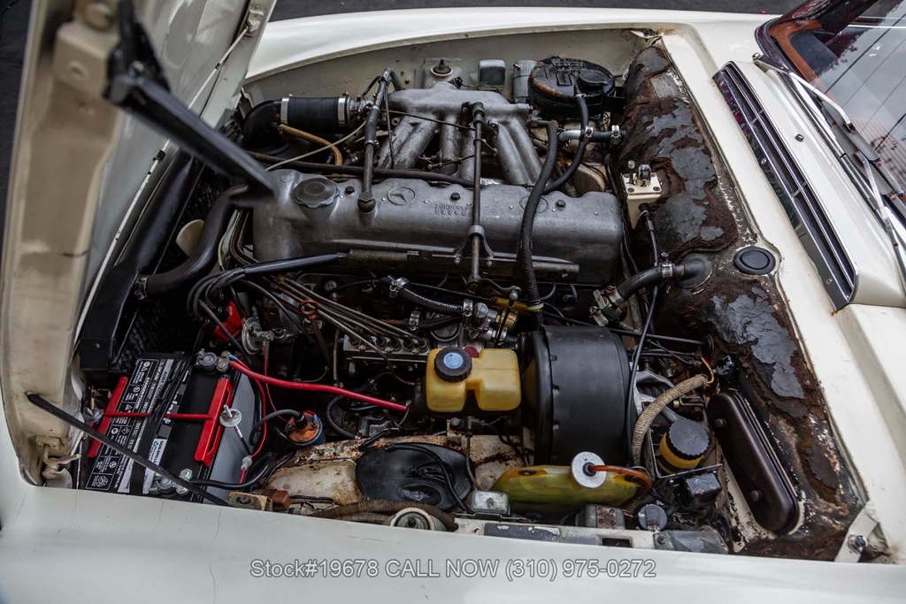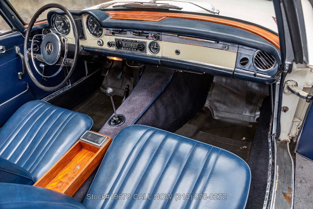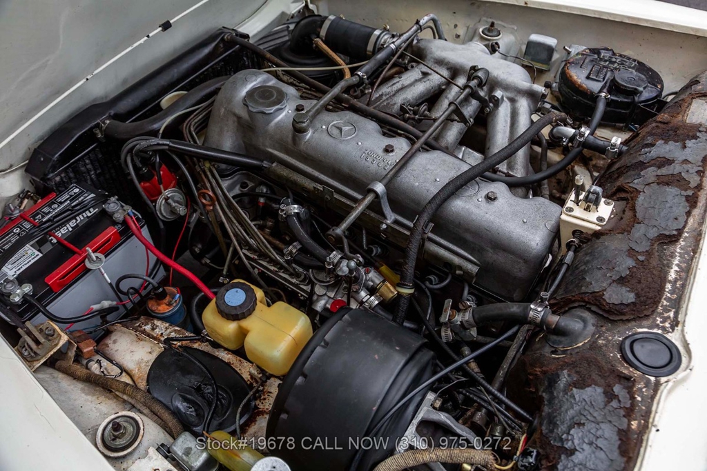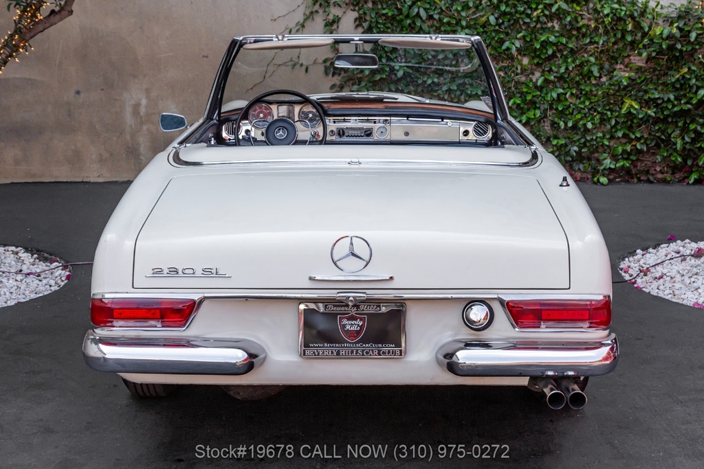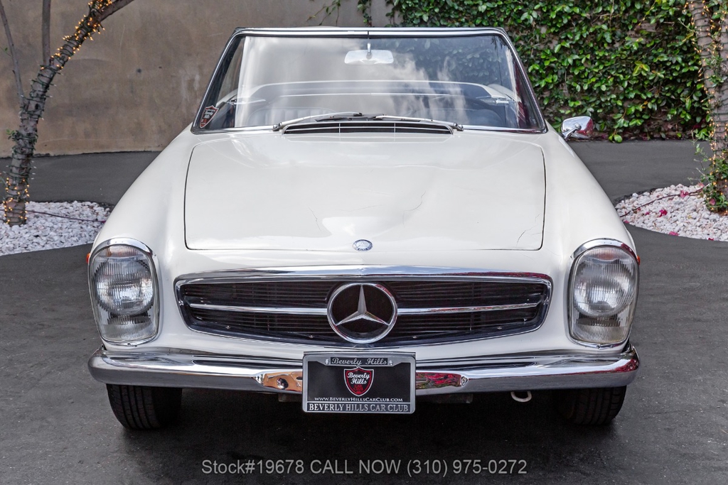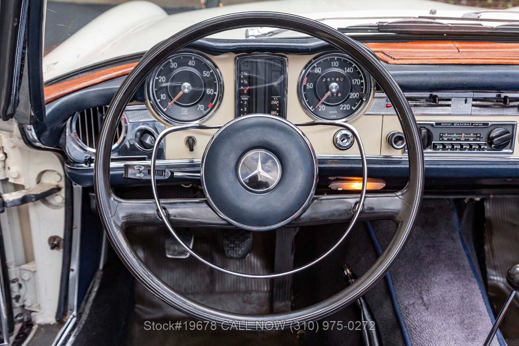 This 230SL is equipped with a 4-speed manual transmission and a 2.3L M127 inline six-cylinder engine, along with Bosch mechanical fuel injection, power-assisted front disc brakes and rear drum brakes, twin exhaust finishers, convertible soft top, removable hardtop, rear "Kinder-Seat", classic VDO gauges, chrome trim and bumpers, side moldings, Milestar Touring SLE thin whitewall tires, 14-inch steel wheels, Mercedes-Benz hubcaps, chrome trim rings, jack, and a full-size spare mounted in the trunk. Interior features include low-back bucket seats, a 2-spoke steering wheel with horn ring, manual crank windows, analog clock, center console, door pockets, glove box, and a Becker Europa radio.