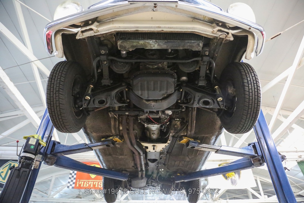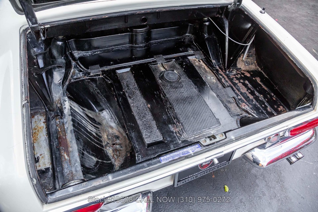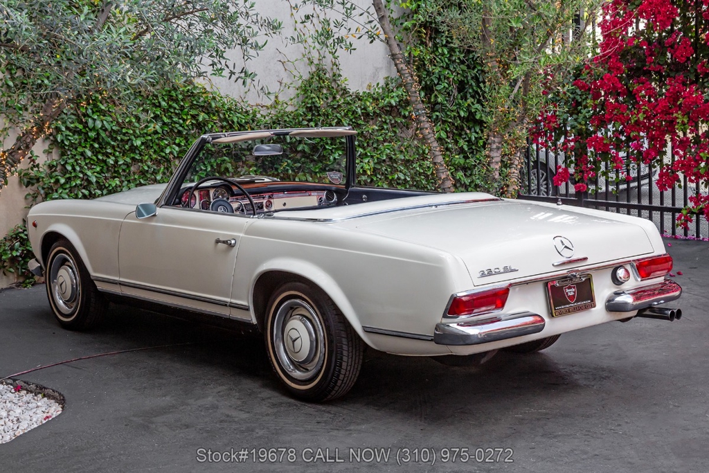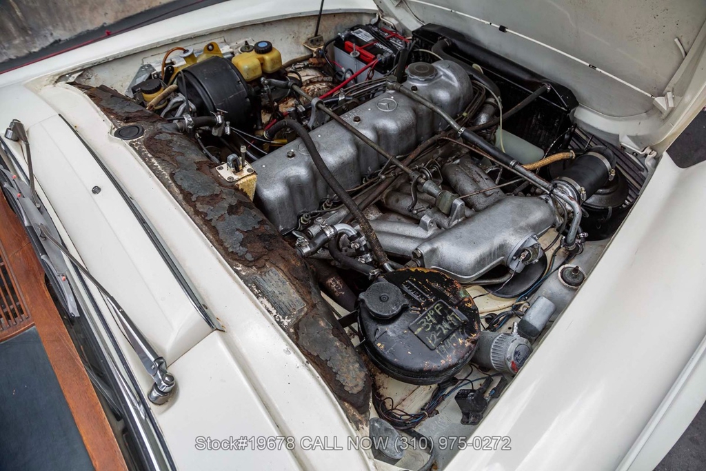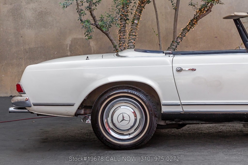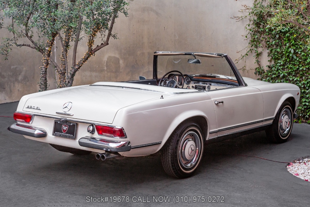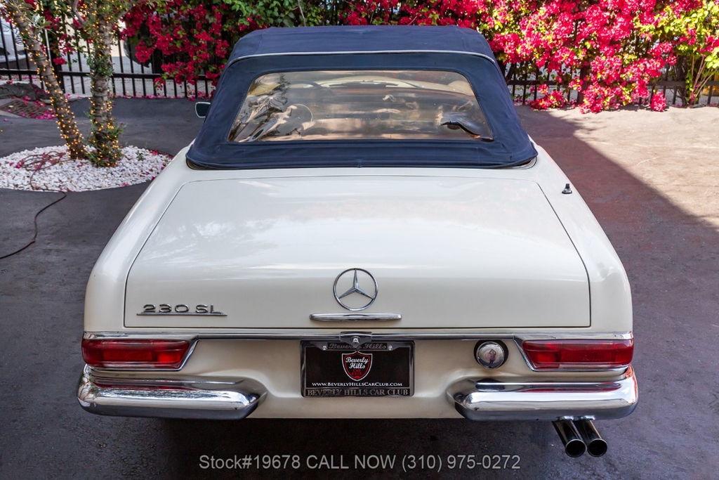 This 230SL is equipped with a 4-speed manual transmission and a 2.3L M127 inline six-cylinder engine, along with Bosch mechanical fuel injection, power-assisted front disc brakes and rear drum brakes, twin exhaust finishers, convertible soft top, removable hardtop, rear "Kinder-Seat", classic VDO gauges, chrome trim and bumpers, side moldings, Milestar Touring SLE thin whitewall tires, 14-inch steel wheels, Mercedes-Benz hubcaps, chrome trim rings, jack, and a full-size spare mounted in the trunk. Interior features include low-back bucket seats, a 2-spoke steering wheel with horn ring, manual crank windows, analog clock, center console, door pockets, glove box, and a Becker Europa radio.