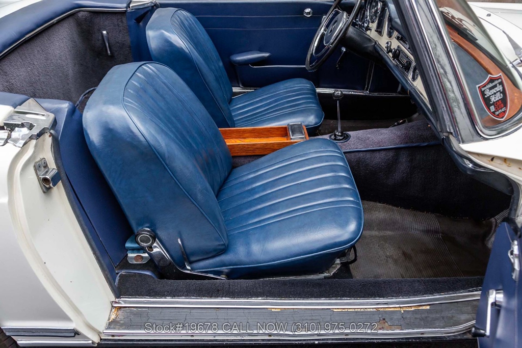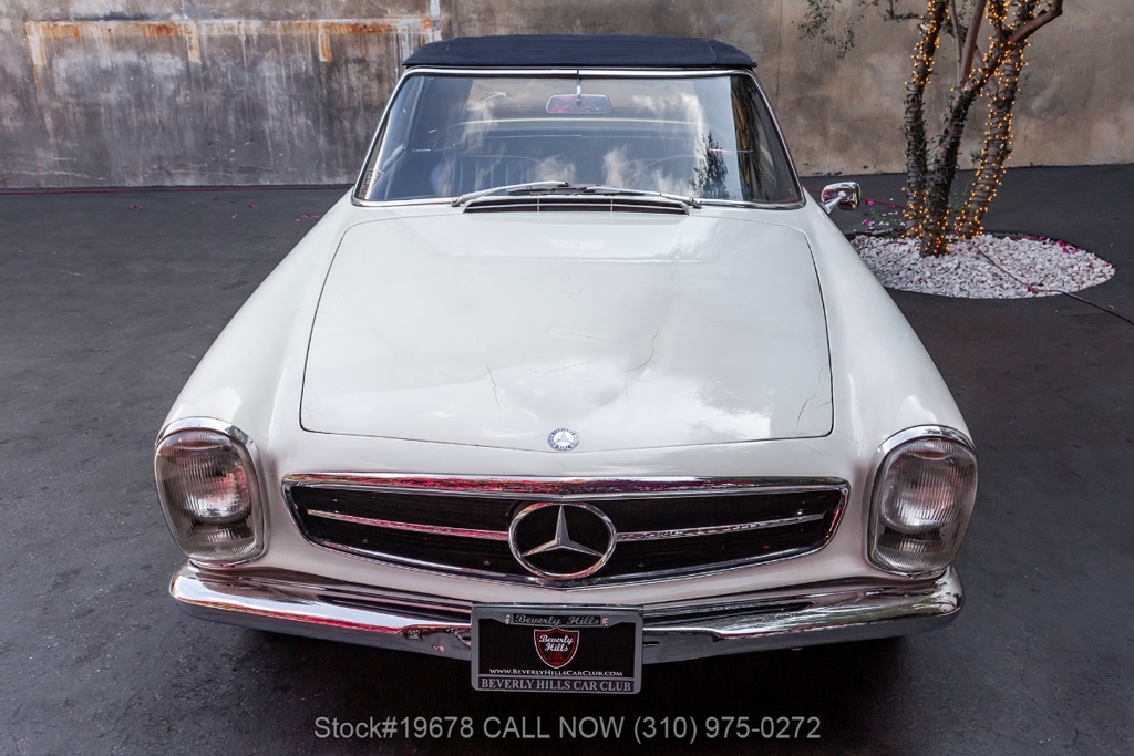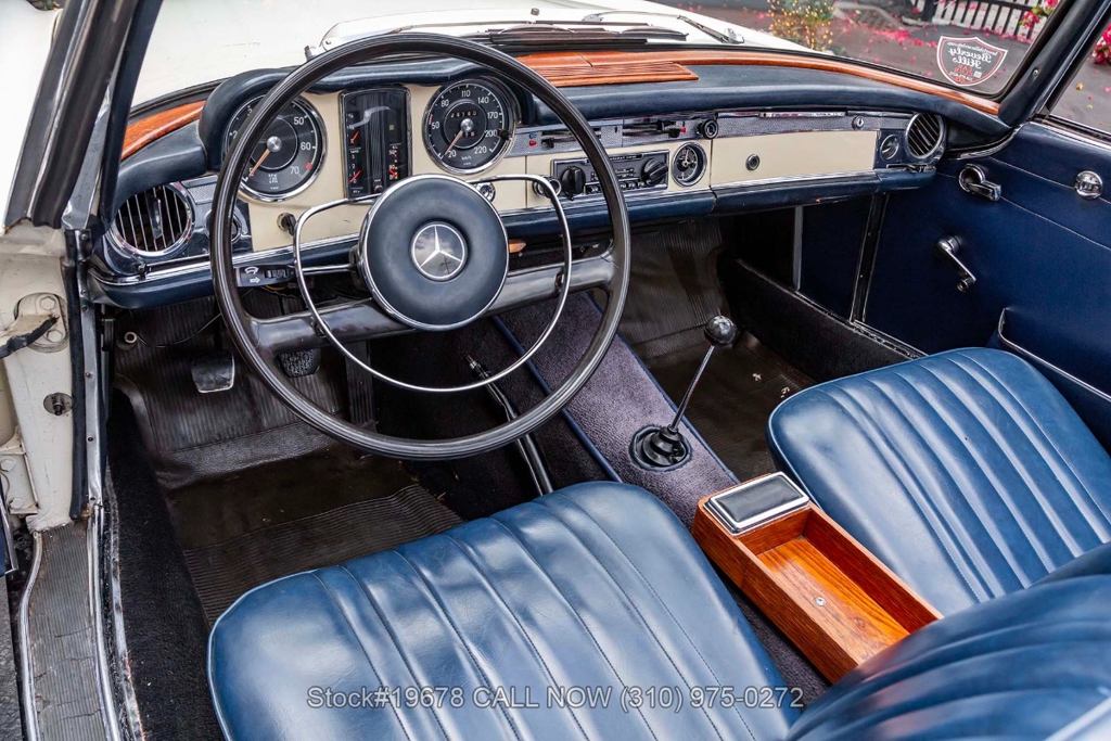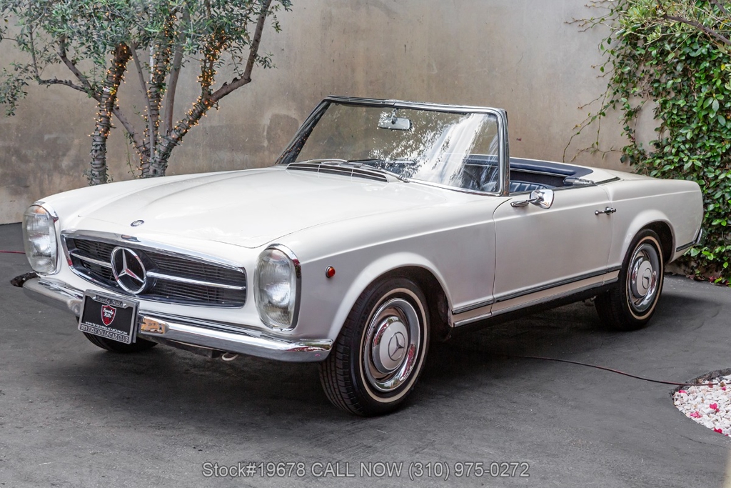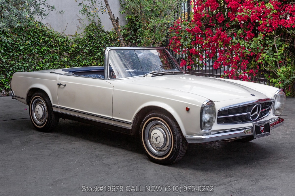 Introducing this 1964 Mercedes-Benz 230SL Pagoda with 2 tops finished in its factory color White "Weiss" (050) with a blue interior. The model is often called the Pagoda because of its distinctive concave hardtop roof design. It is one of the most recognized classic models from Mercedes-Benz, known for its clean styling and balanced driving experience.
