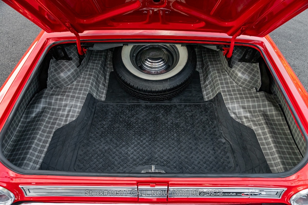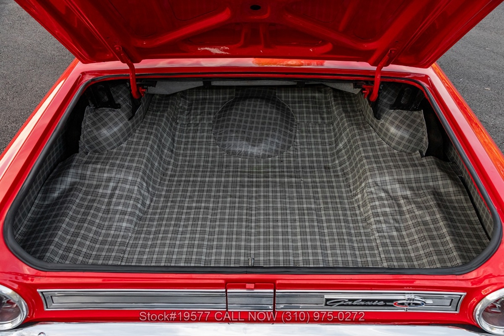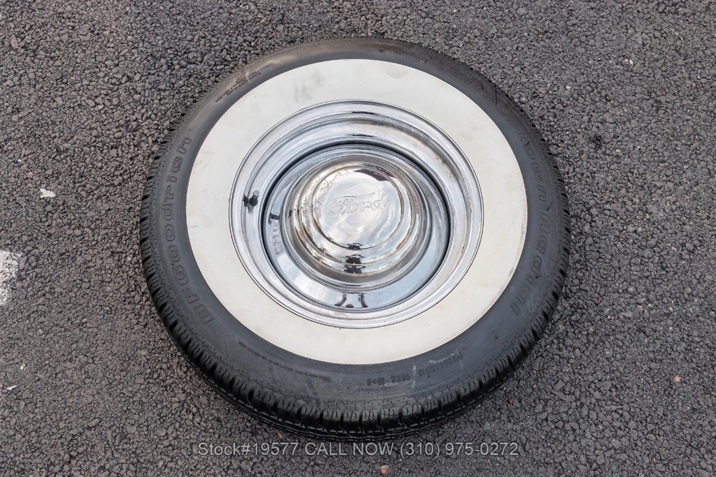 Inside, the 500XL trim level brings bucket seats and a full-length center console, an upscale touch for the era that set it apart from standard Galaxie models. The black interior includes a rear bench seat, manual crank windows, vent windows, courtesy lights, glove box, and factory-style details throughout. The layout feels sporty yet comfortable, staying true to the model's grand touring spirit. It rides on 15-inch steel wheels fitted with BFGoodrich wide whitewall tires and Ford-branded hubcaps, giving it an authentic period stance. A spare tire is also included.