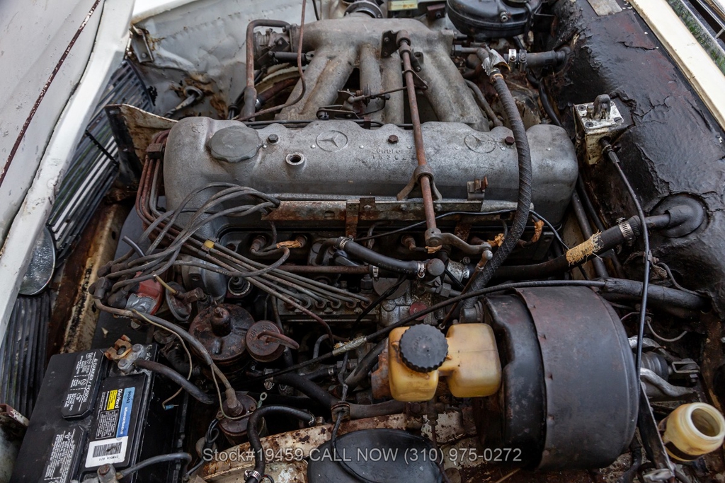 Equipped with a 4-speed manual transmission and a 2.3L M127 inline six-cylinder engine, along with a Bosch mechanical fuel injection, front-wheel disc brakes, twin exhaust finishers, convertible soft top, removable hardtop, rear "Kinder-Seat", classic VDO gauges, chrome trim and bumpers, side moldings, 14-inch steel wheels, Mercedes-Benz hubcaps, and a full-size spare tire in the trunk. Interior features include low-back bucket seats, a 2-spoke steering wheel with horn ring, manual crank windows, analog clock, center console, door pockets, and an FM/AM radio.