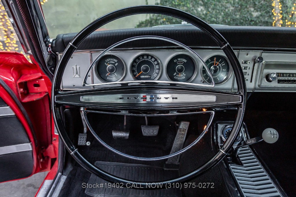 This Plymouth is equipped with a V8 engine backed by a manual transmission, dual exhaust outlets, a 2-spoke steering wheel, chrome bumpers, quad headlights, and period-correct details throughout. It rides on BFGoodrich tires mounted to 15-inch American Racing wheels, with a full-size spare stored in the trunk. Inside, you'll find front bucket seats, manual crank windows, vent windows, an analog clock, a push-button radio, and a fender-mounted antennasimple, functional features that reflect the era.