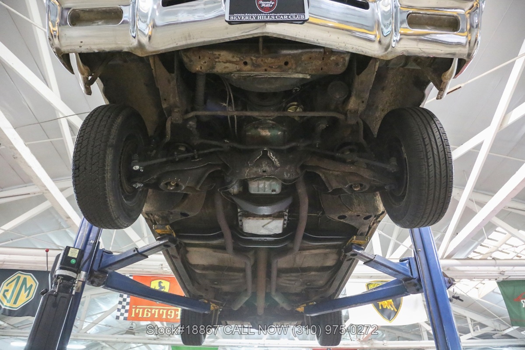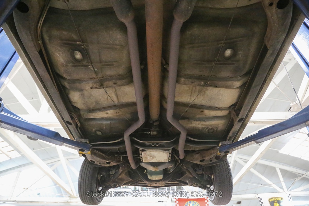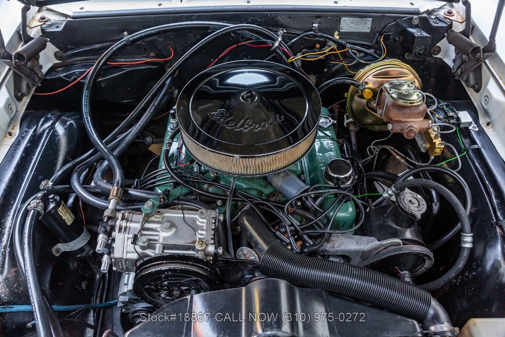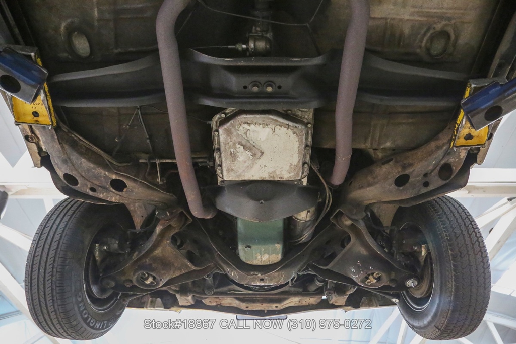 Equipped with an automatic transmission, V8 engine, Edelbrock AVS2 carburetor, power steering, front wheel disc brakes, rear drum brakes, dual exhaust outlets, chrome trim/bumpers, Grant Classic 3-spoke steering wheel, 14-inch chrome wheels, jack, and a full-size spare tire fitted in the trunk. Convenience features include air conditioning modification, vintage "Frigi King" under-dash air conditioner unit, comfortable bucket seating, lap belts, driver-side rearview mirror, quarter windows, a JVC stereo, and fender-mounted antenna.