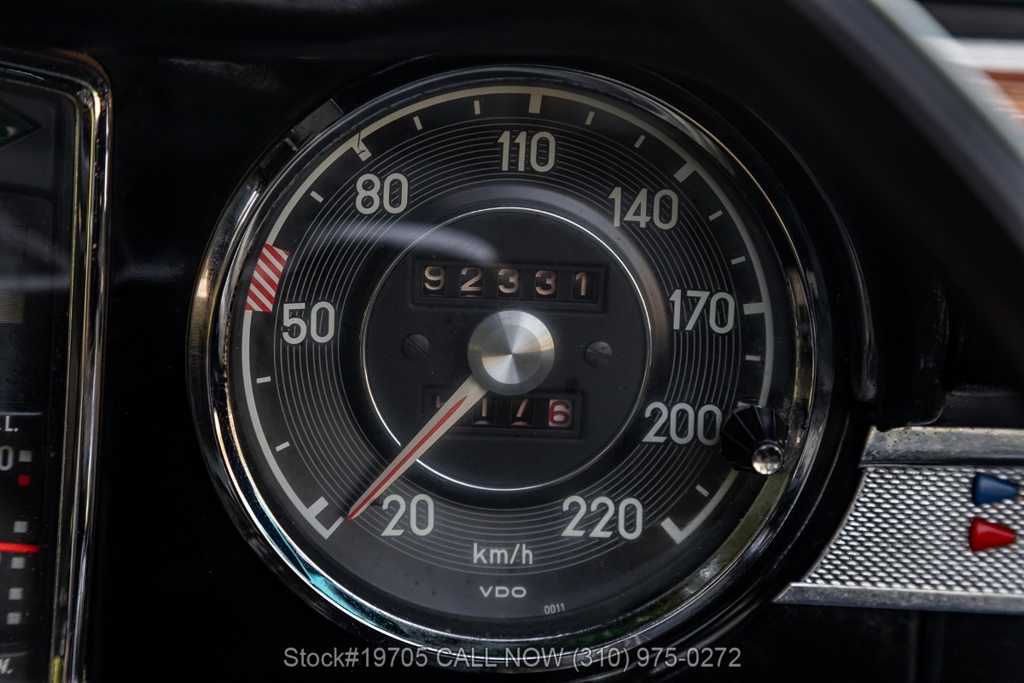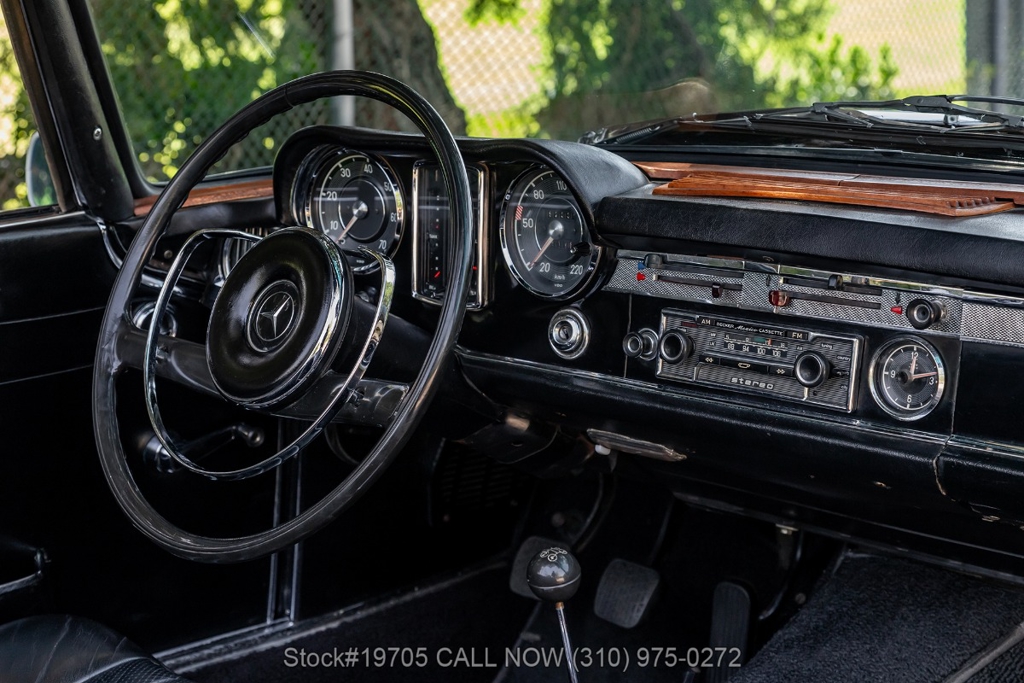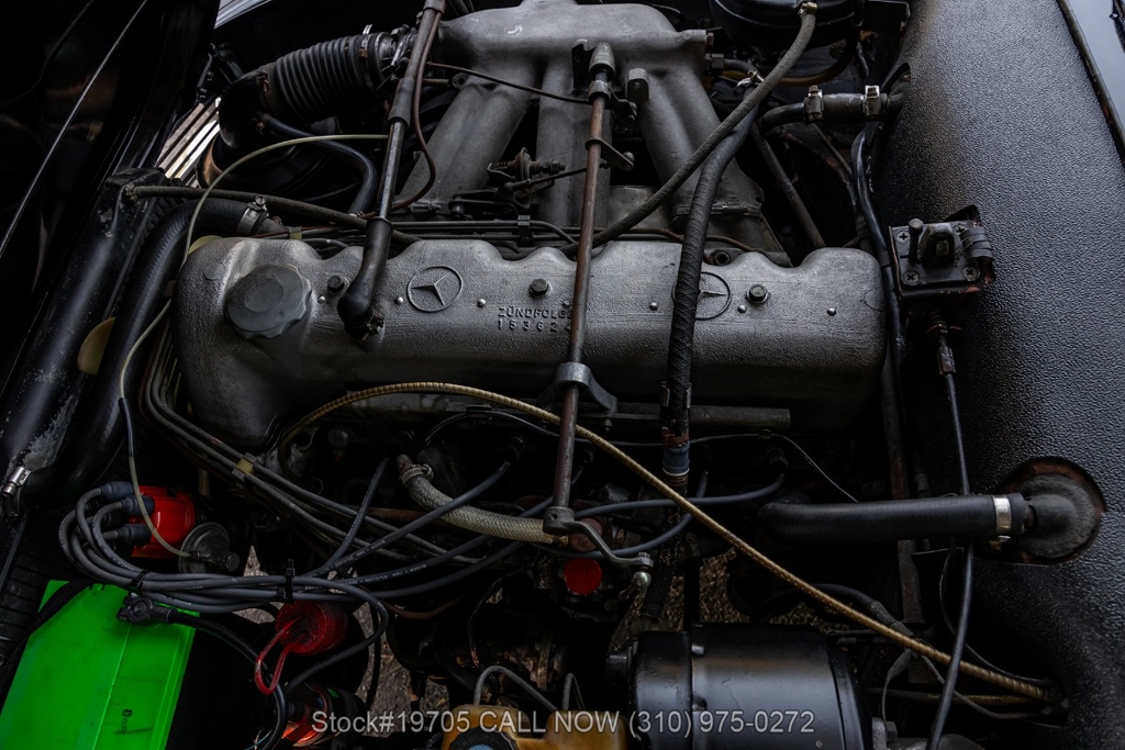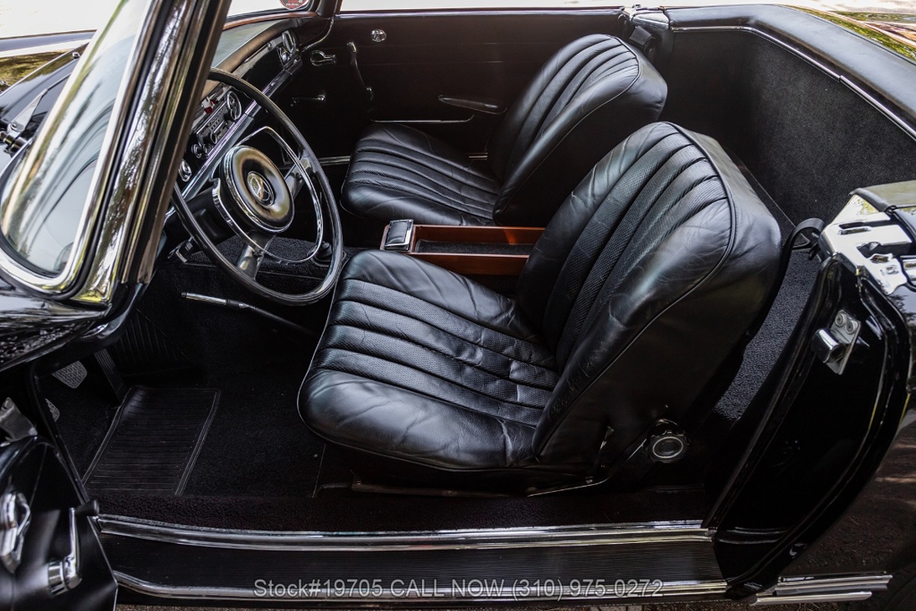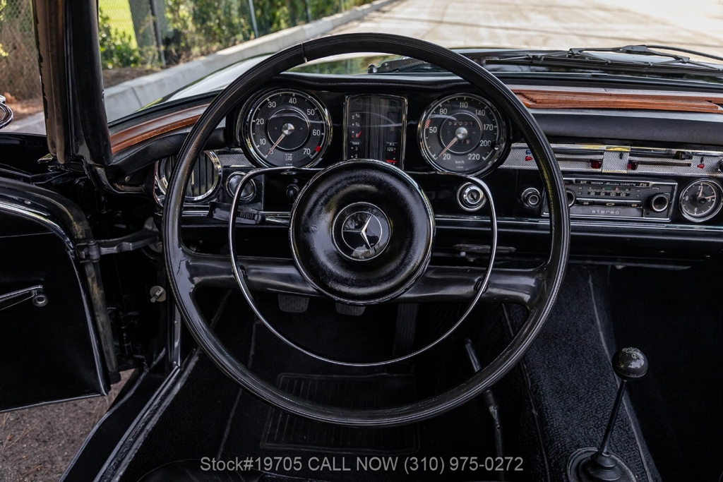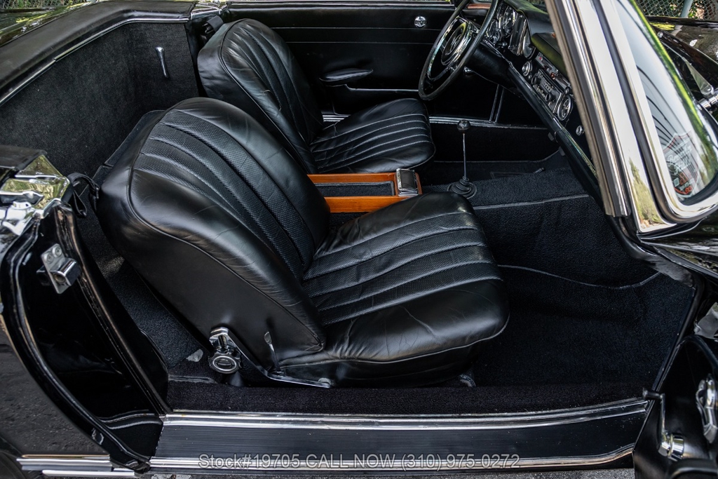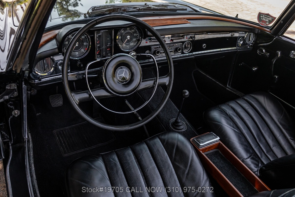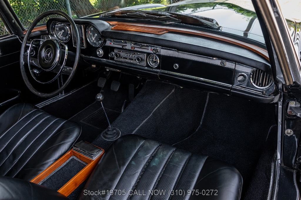 This 230SL is equipped with a 4-speed manual transmission and an inline-six engine, along with fuel injection, front disc brakes and rear drum brakes, power steering, twin exhaust finishers, convertible soft top, removable hardtop, Bosch headlamps, classic VDO gauges, chrome trim and bumpers, side moldings, Mercedes-Benz hubcaps, chrome trim rings, Firestone tires, tool roll, and a full-size spare mounted in the trunk. Interior features include low-back bucket seats, a 2-spoke steering wheel with horn ring, manual crank windows, analog clock, center console, door pockets, glove box, and FM/AM radio.