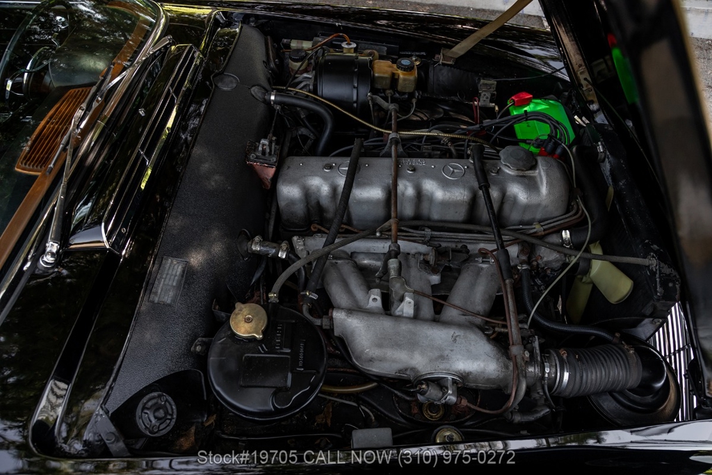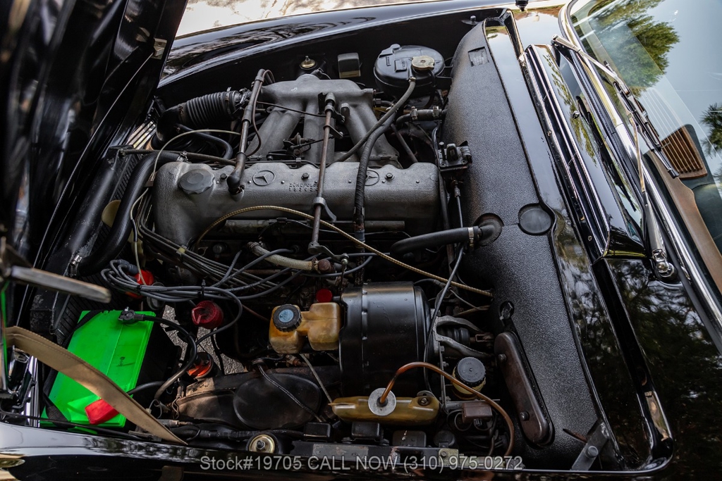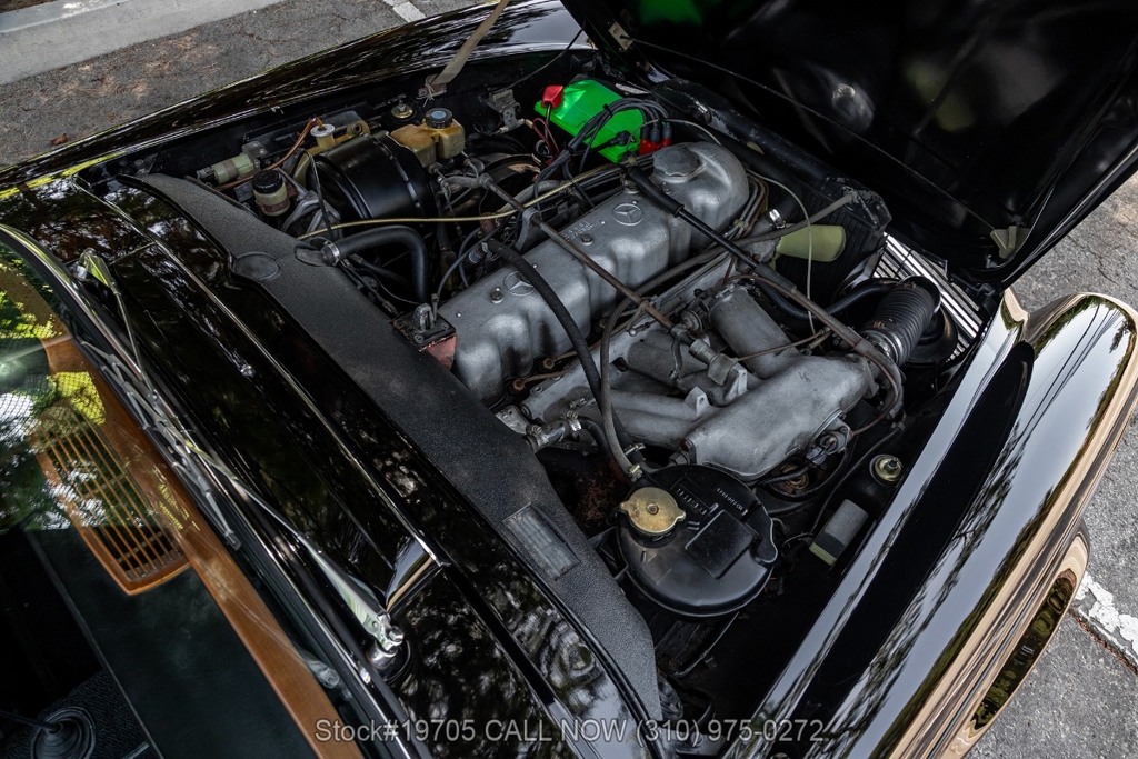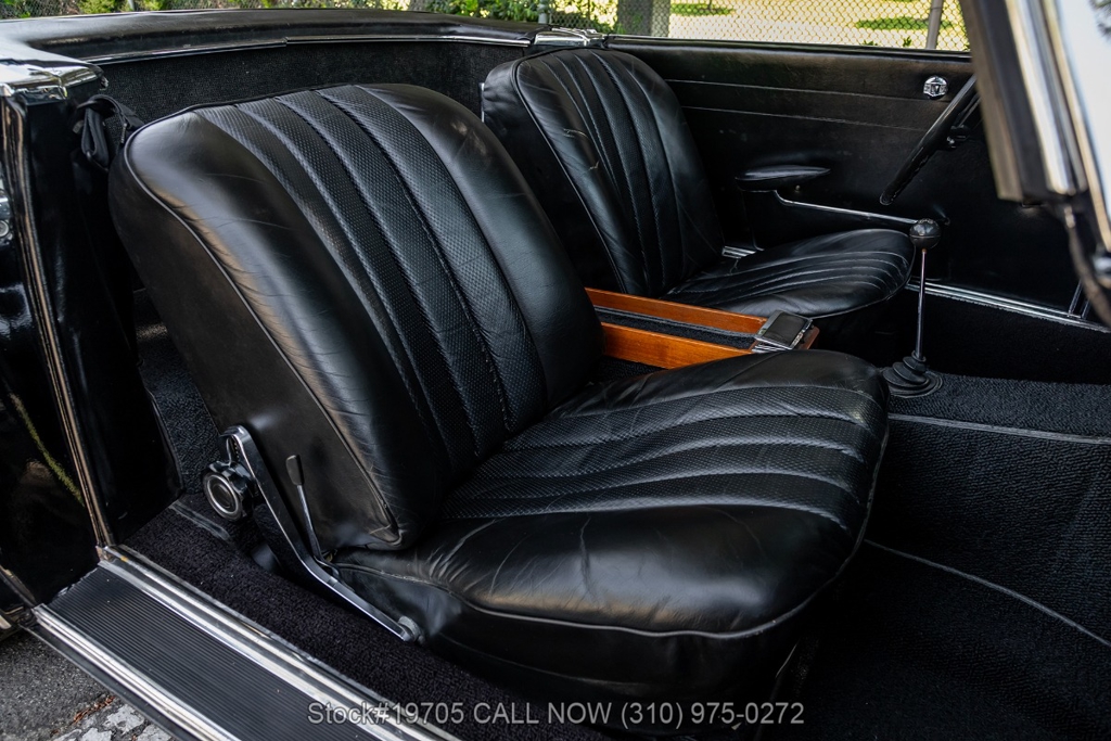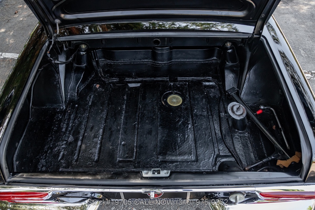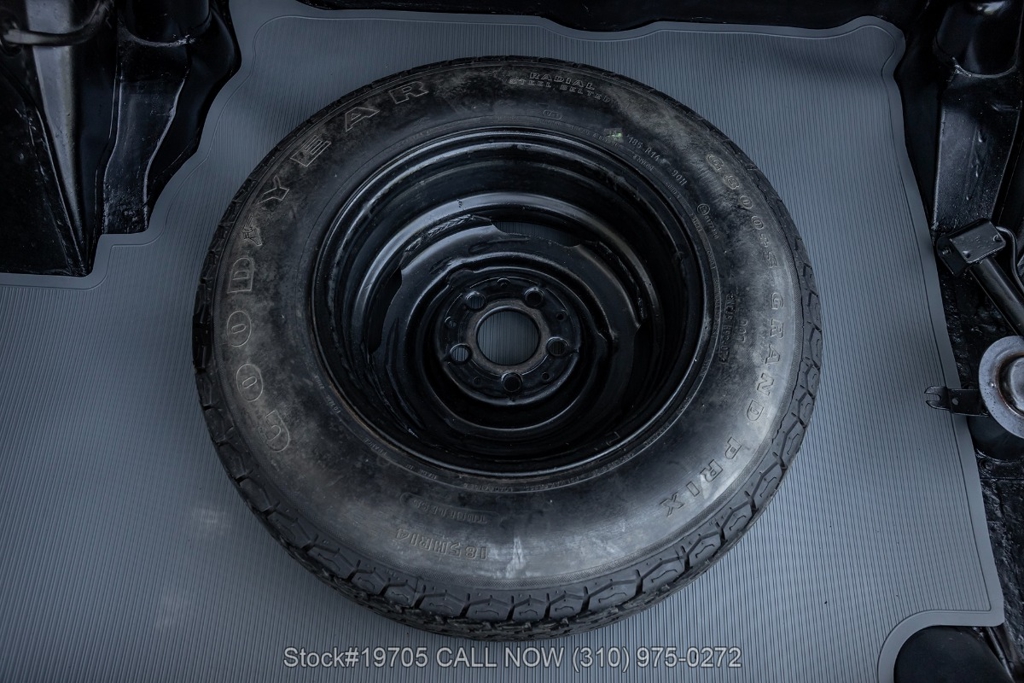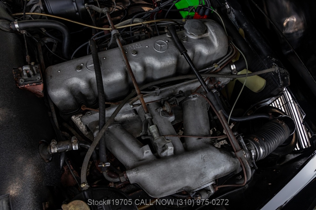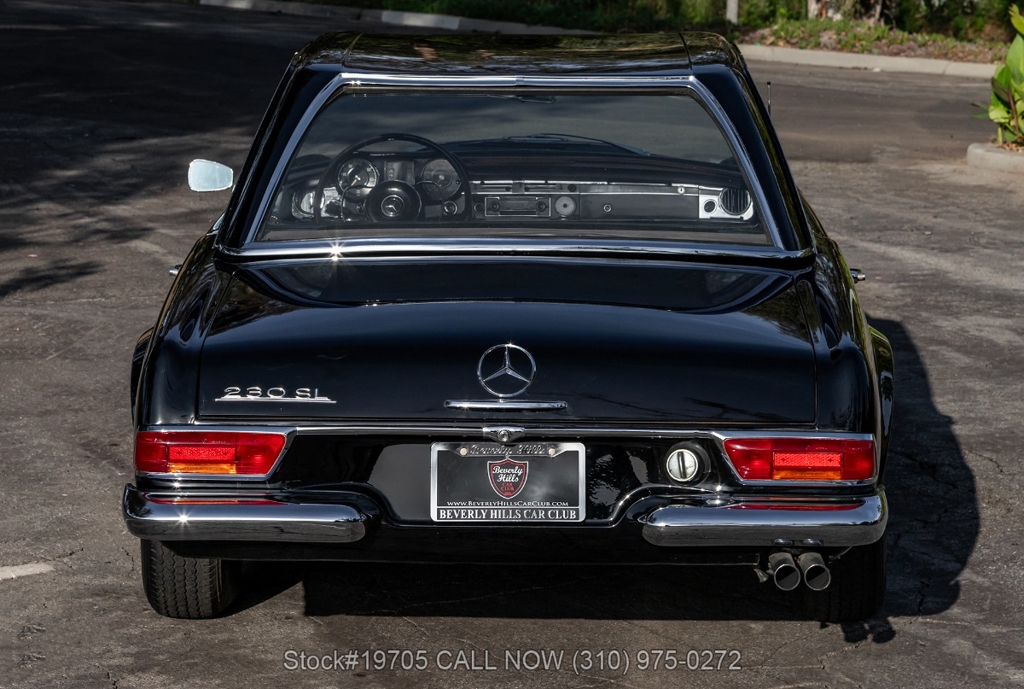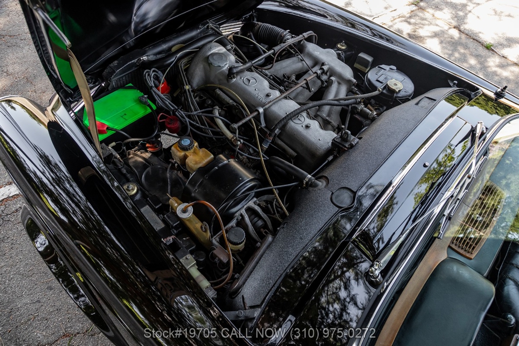 This 230SL is equipped with a 4-speed manual transmission and an inline-six engine, along with fuel injection, front disc brakes and rear drum brakes, power steering, twin exhaust finishers, convertible soft top, removable hardtop, Bosch headlamps, classic VDO gauges, chrome trim and bumpers, side moldings, Mercedes-Benz hubcaps, chrome trim rings, Firestone tires, tool roll, and a full-size spare mounted in the trunk. Interior features include low-back bucket seats, a 2-spoke steering wheel with horn ring, manual crank windows, analog clock, center console, door pockets, glove box, and FM/AM radio.
