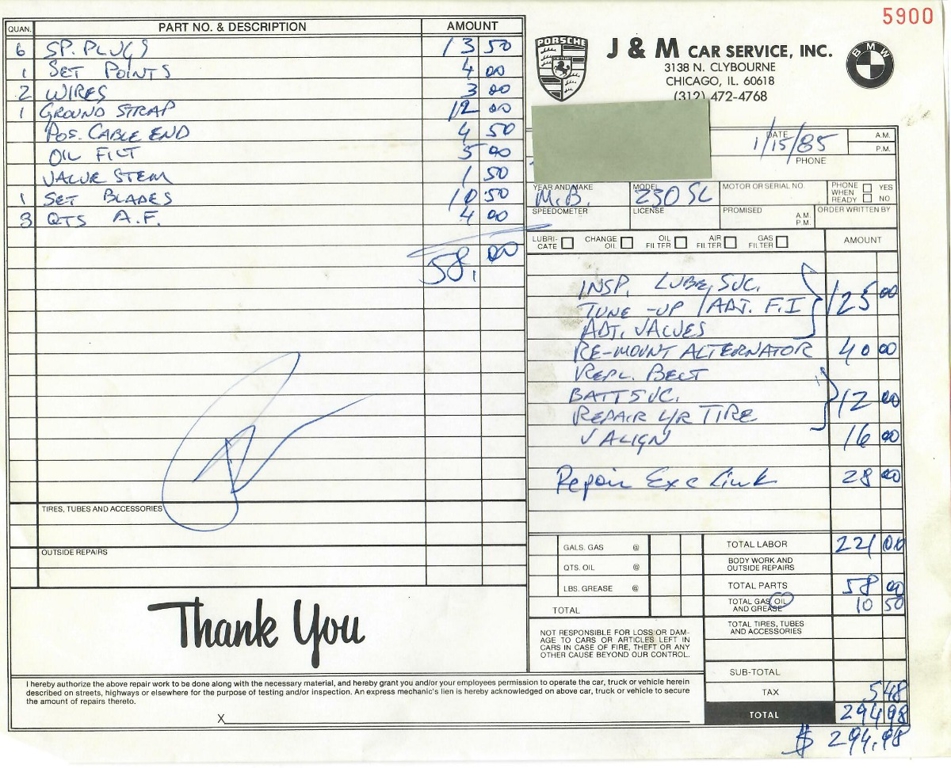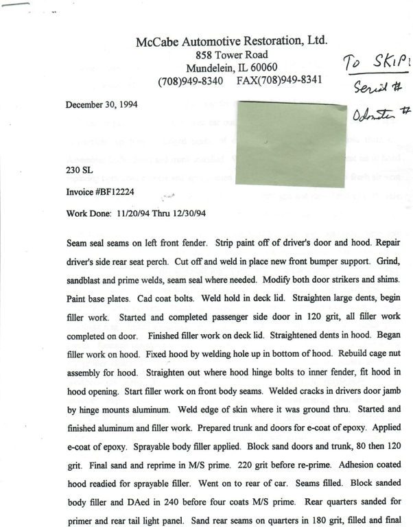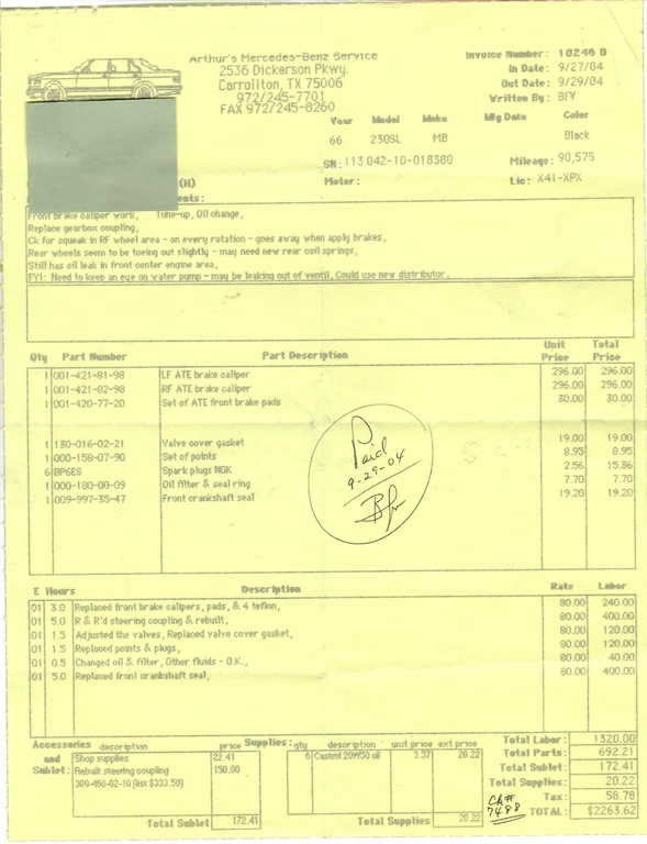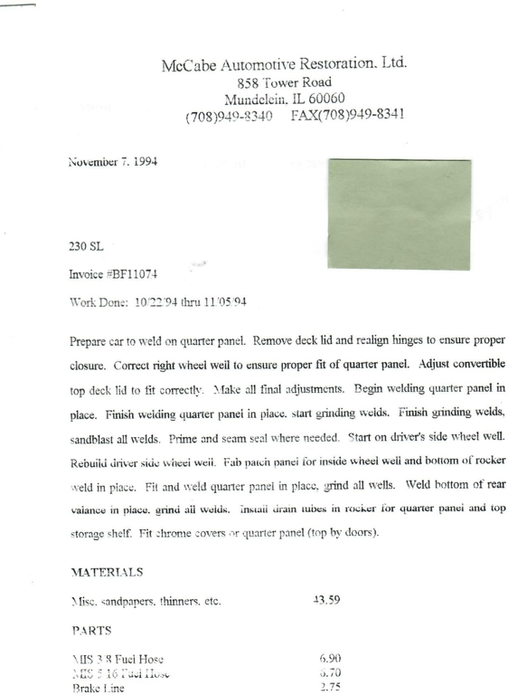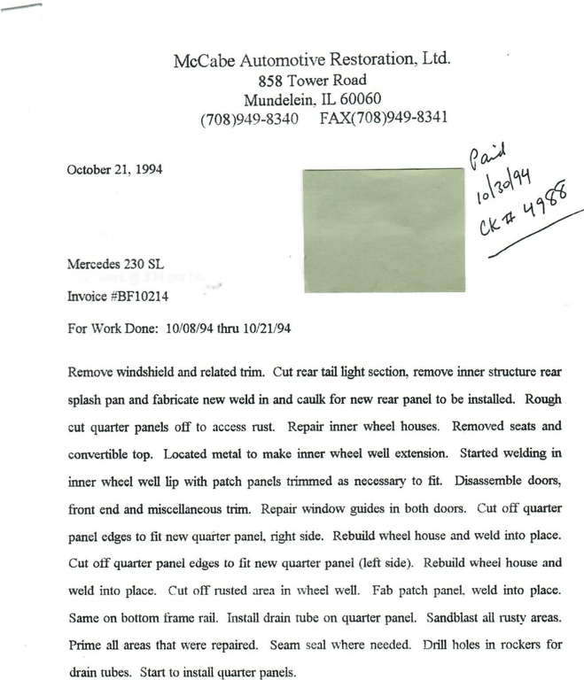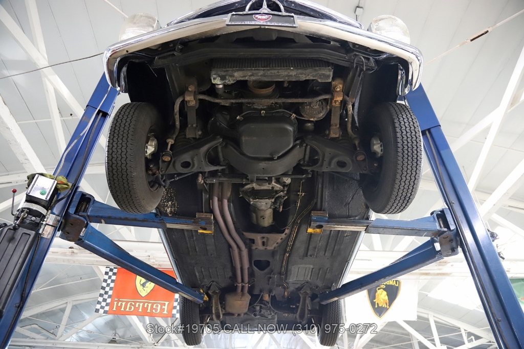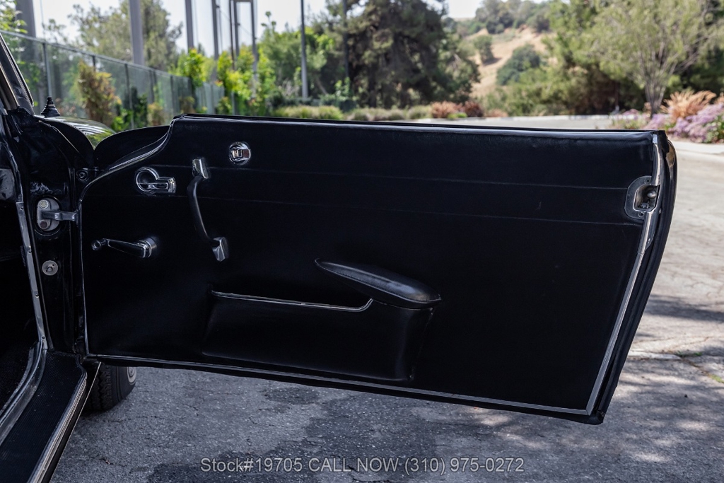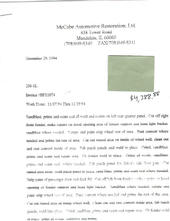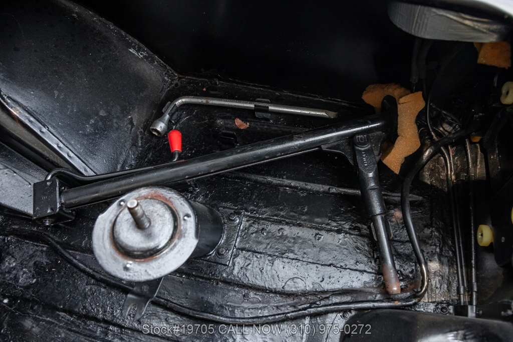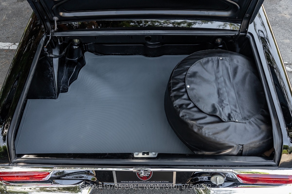 This 230SL is equipped with a 4-speed manual transmission and an inline-six engine, along with fuel injection, front disc brakes and rear drum brakes, power steering, twin exhaust finishers, convertible soft top, removable hardtop, Bosch headlamps, classic VDO gauges, chrome trim and bumpers, side moldings, Mercedes-Benz hubcaps, chrome trim rings, Firestone tires, tool roll, and a full-size spare mounted in the trunk. Interior features include low-back bucket seats, a 2-spoke steering wheel with horn ring, manual crank windows, analog clock, center console, door pockets, glove box, and FM/AM radio.