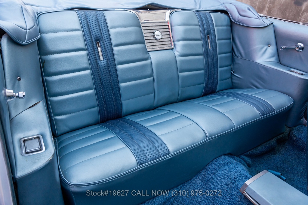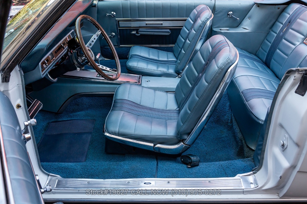 Inside, the XL-spec low-back bucket seats are finished in blue with chrome trim accents and are complemented by a matching rear bench seat featuring the signature Galaxie center ornament and speaker grille. The full-length center console, finished in brushed aluminum trim, houses a floor-mounted shifter and integrated storage, maintaining the car's period-correct feel.