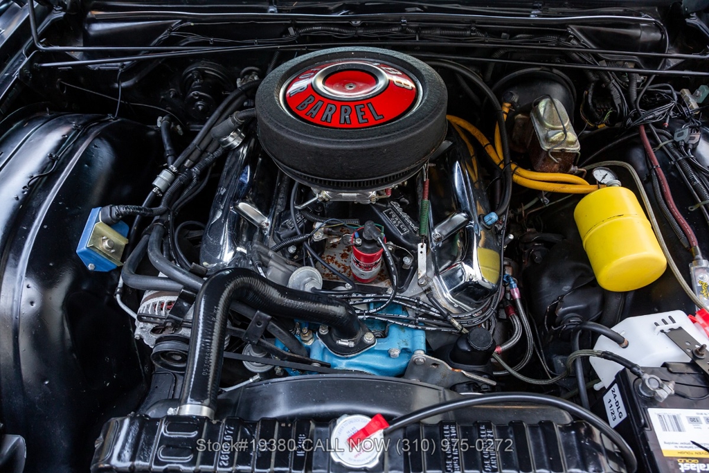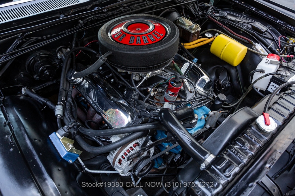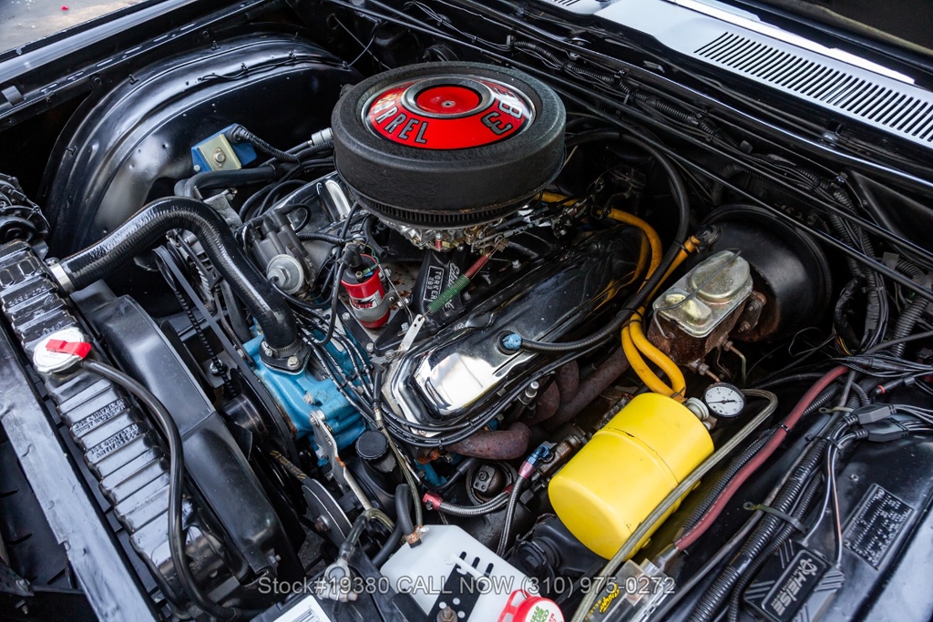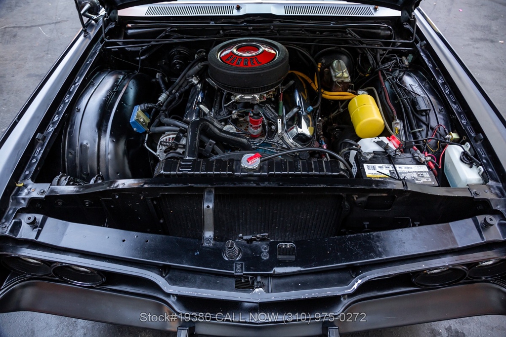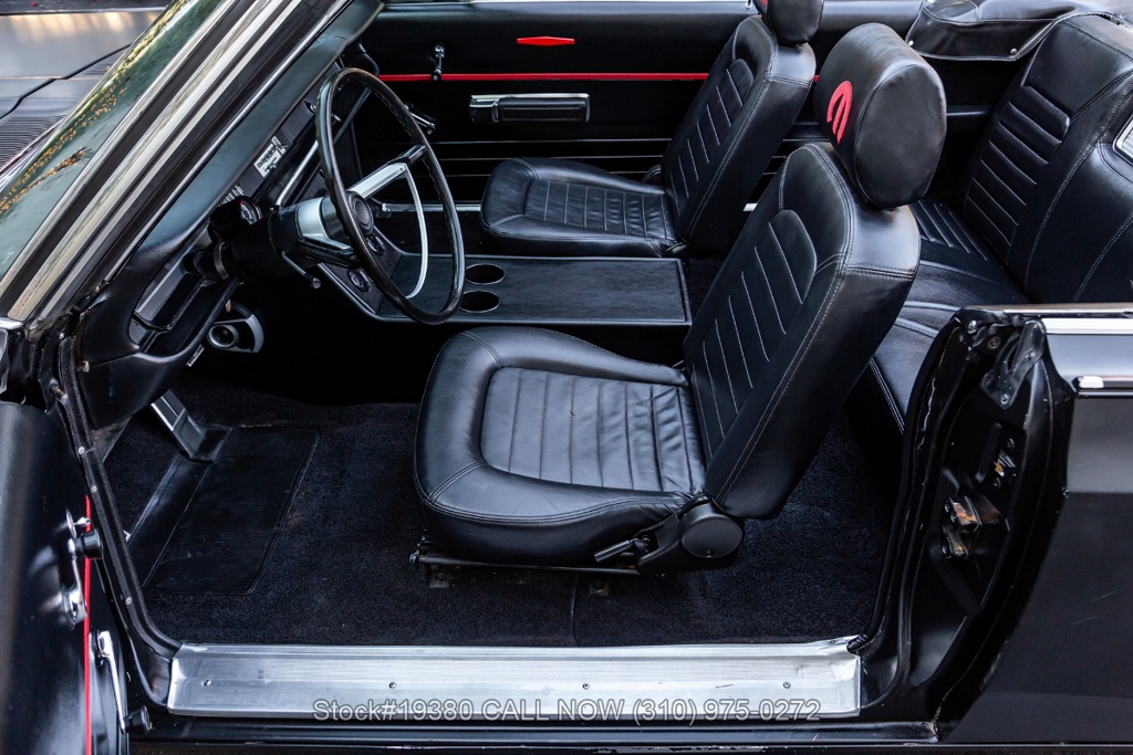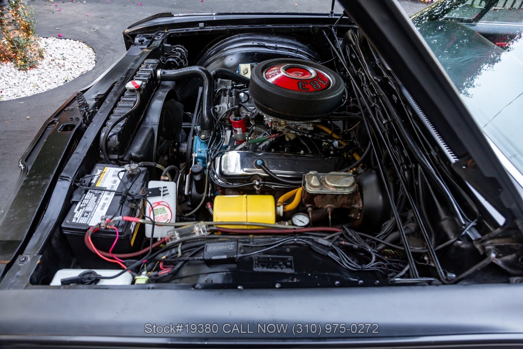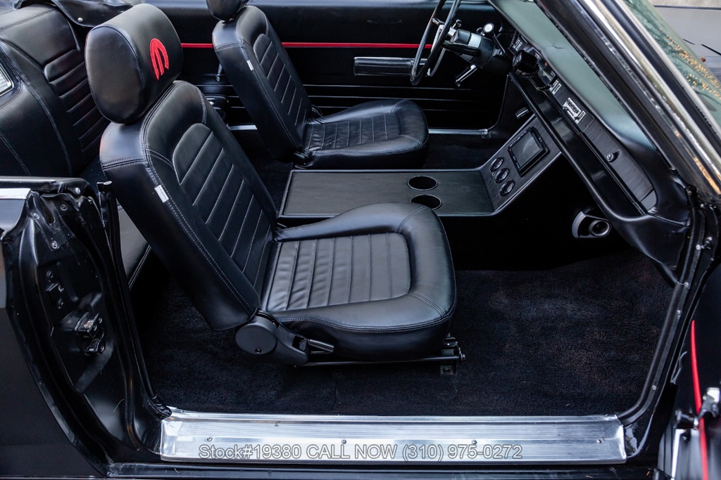 Power comes from a 383ci V-8 mated to an automatic transmission, breathing through a Holley four-barrel carburetor and exiting via a dual exhaust system. Additional features include power steering, a black convertible soft top, and modern 20-inch black multi-spoke alloy wheels accented with a subtle red pinstripe lip that adds contrast without overpowering the design.