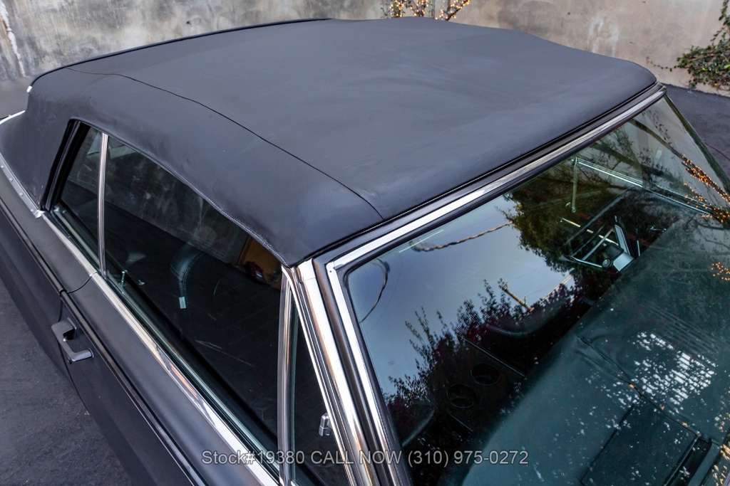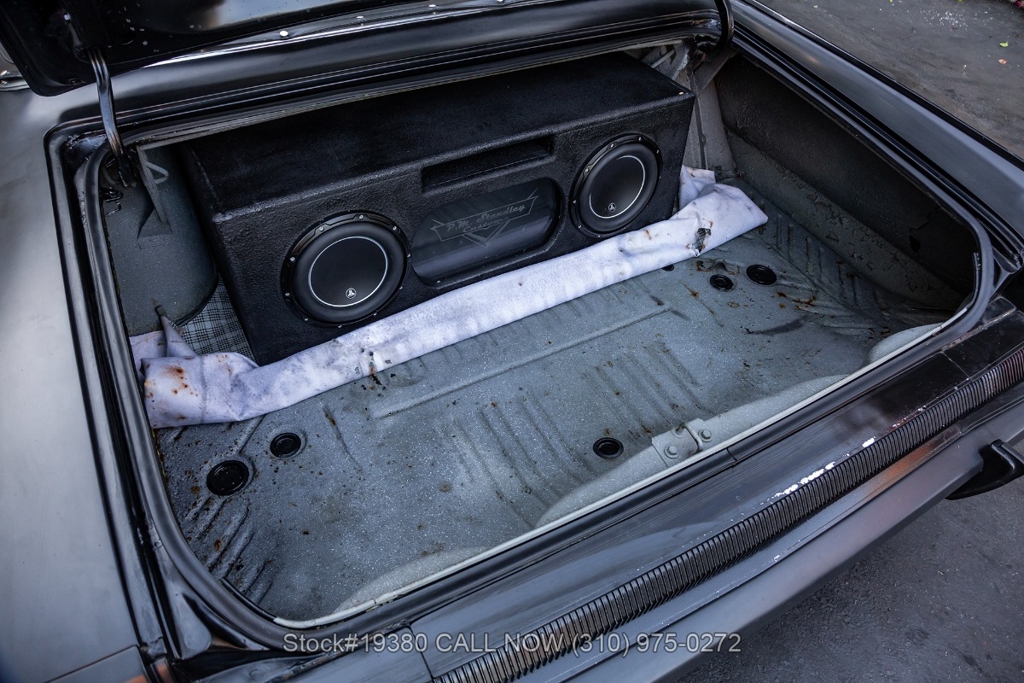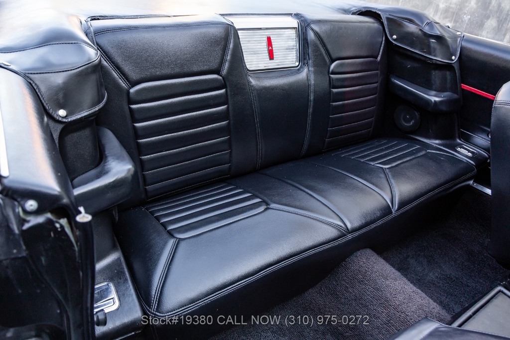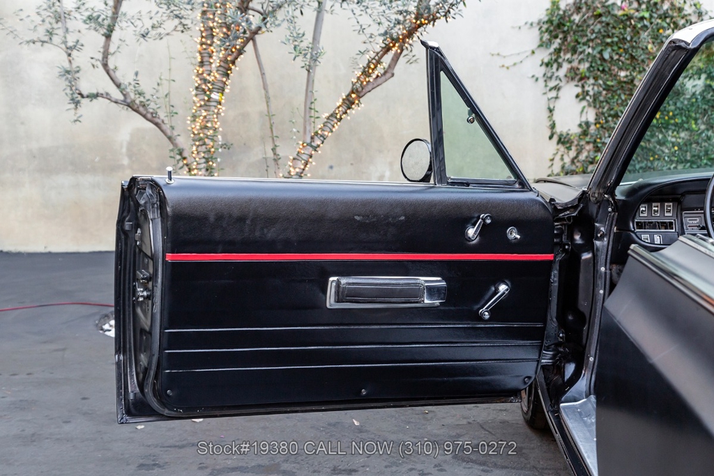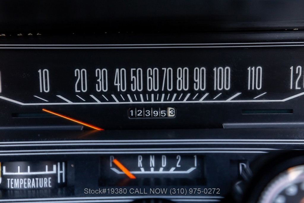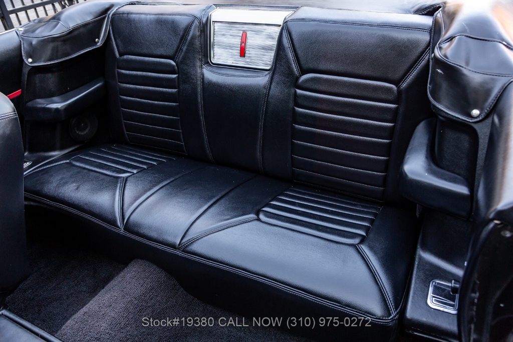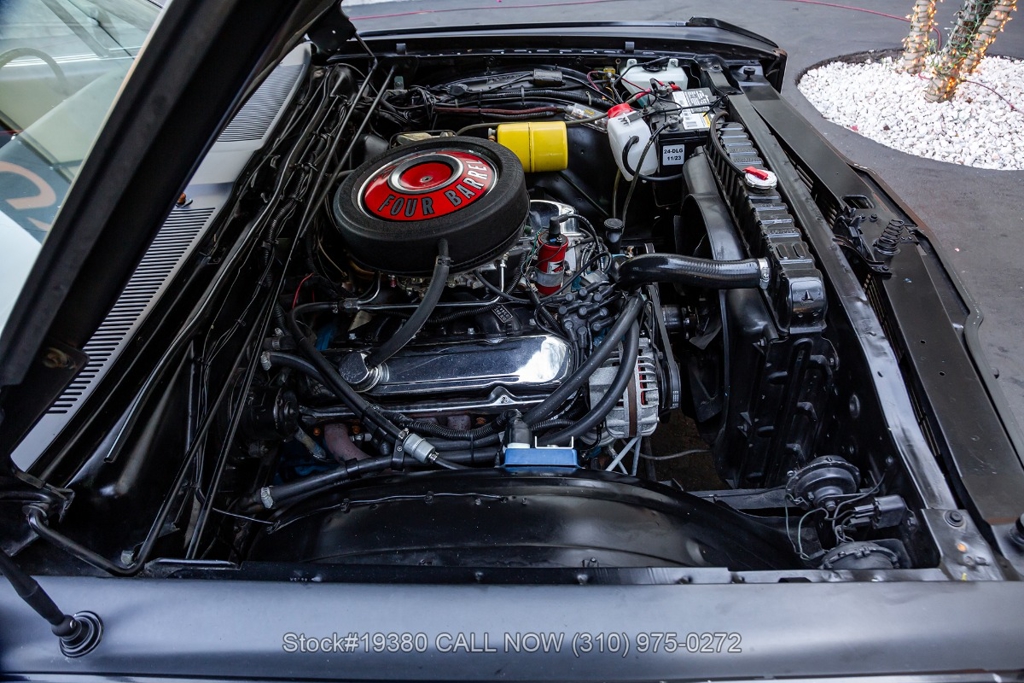Power comes from a 383ci V-8 mated to an automatic transmission, breathing through a Holley four-barrel carburetor and exiting via a dual exhaust system. Additional features include power steering, a black convertible soft top, and modern 20-inch black multi-spoke alloy wheels accented with a subtle red pinstripe lip that adds contrast without overpowering the design.