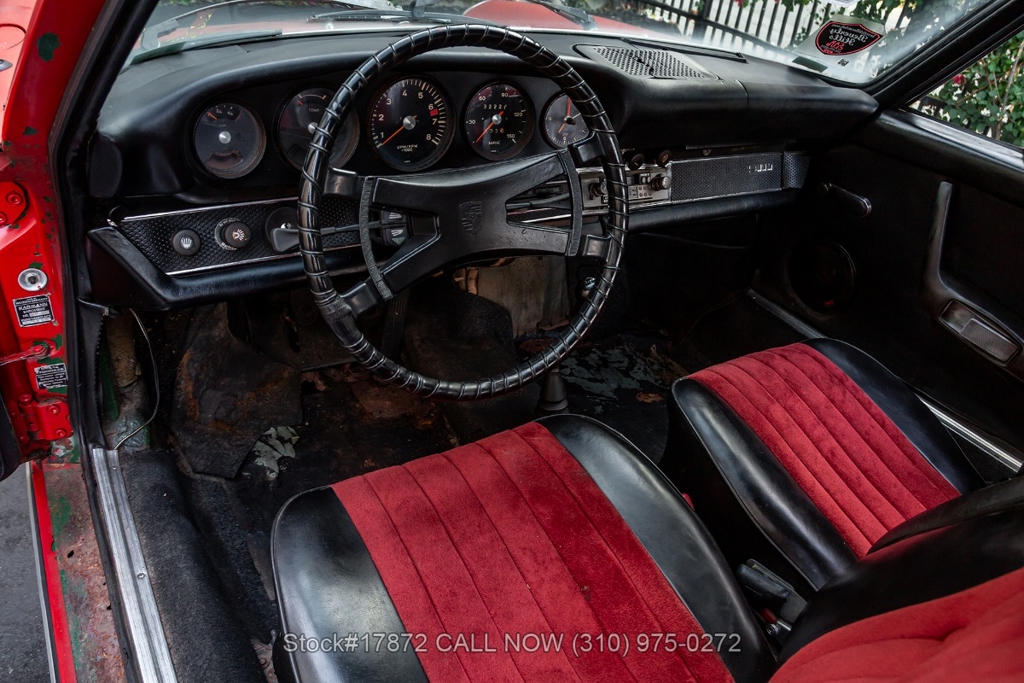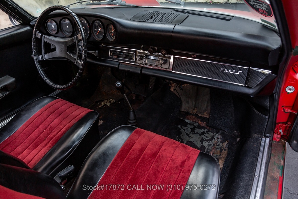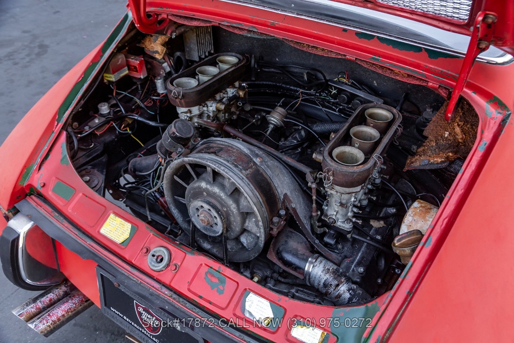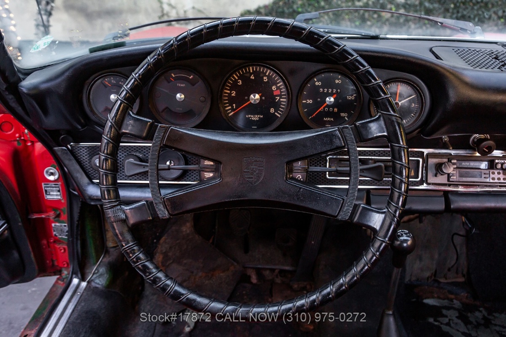 This early 911 is equipped with 5-speed manual transmission, Flat 6 Cylinder 2.0-liter engine, Weber dual carburetors, four-wheel disc brakes, quad exhaust outlets, VDO instruments, Cibie branded headlights, 4-spoke steering wheel, and 15-inch Fuchs-style wheels. Conveniences features include a driver-side rearview mirror, glove compartment, manual-crank windows, vent windows, Sony radio, fender mounted antenna and a dashboard analog clock.