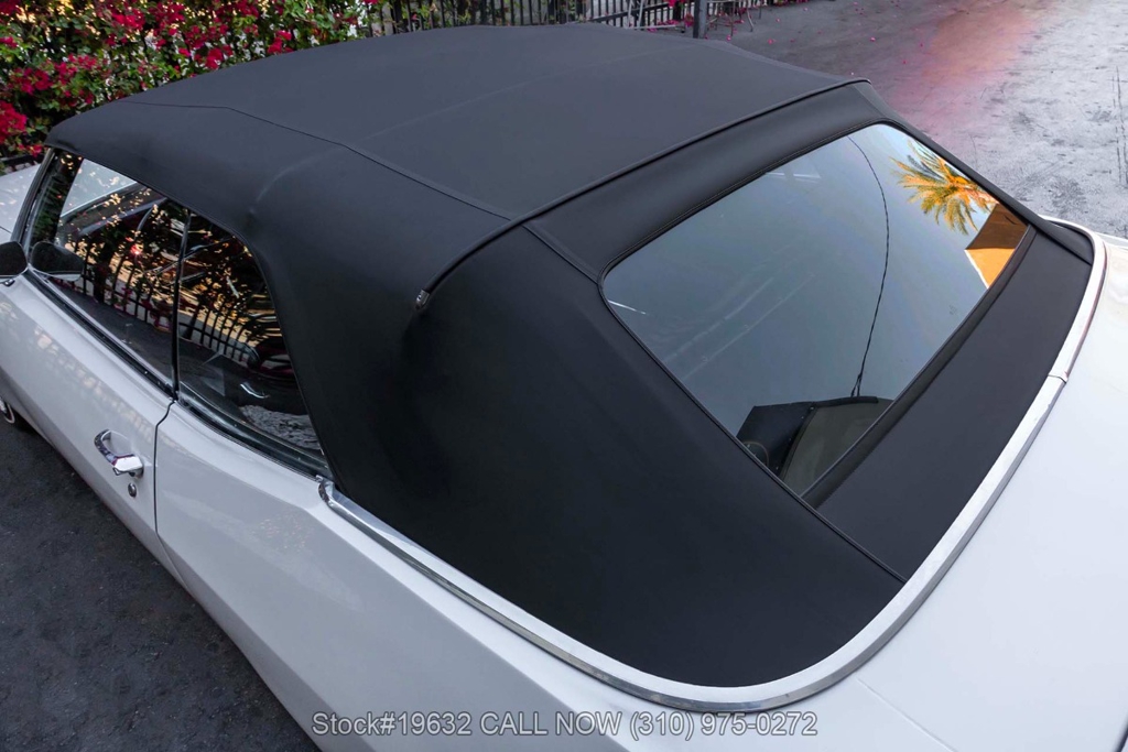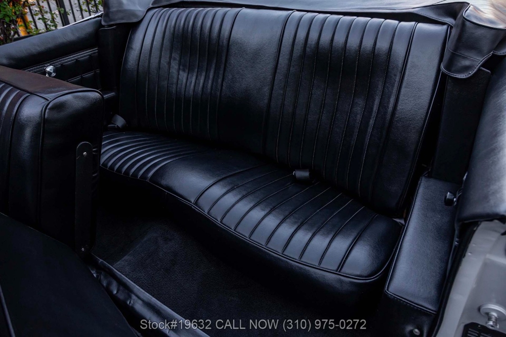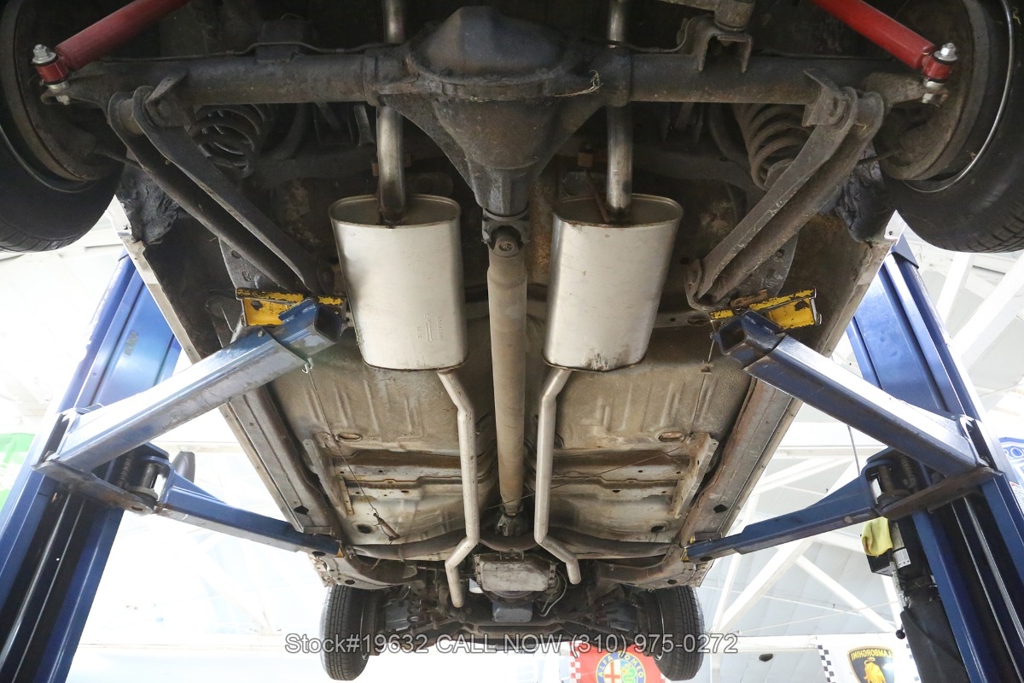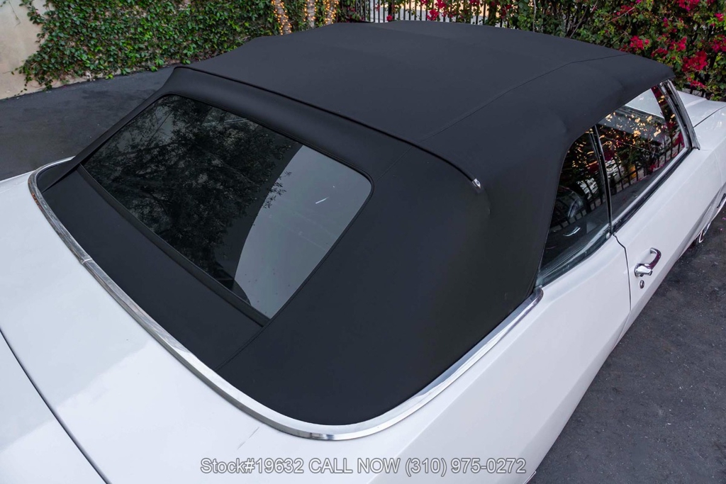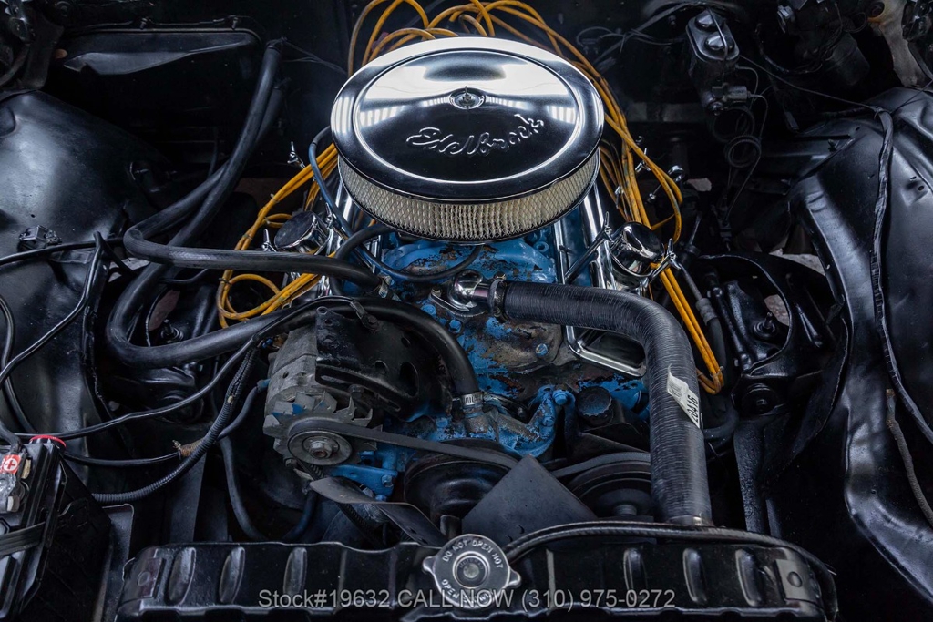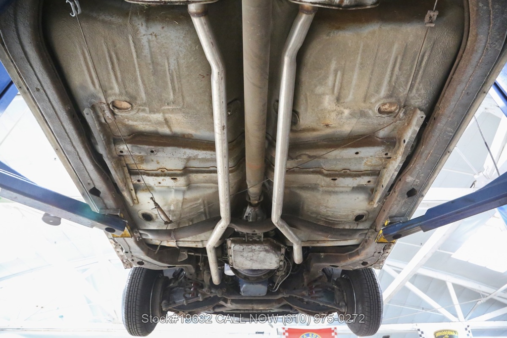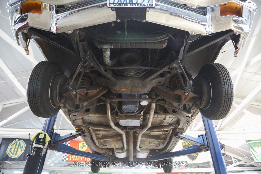 Power comes from a V8 engine paired with an automatic transmission. Equipped with a 4-barrel carburetor, power steering, dual exhaust, and drum brakes on all four corners. Exterior details include quad headlights, chrome bumpers, thin whitewall tires, and 13-inch wire wheels, along with a black soft top and matching boot cover. Inside, the cabin features bench seating with lap belts, manual windows, a glove box, a two-spoke steering wheel, and a retro-style radio, keeping things simple and period-correct.