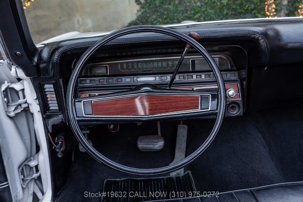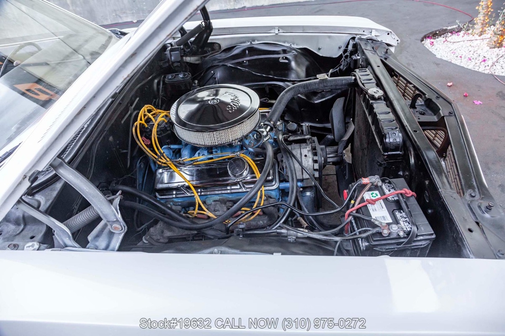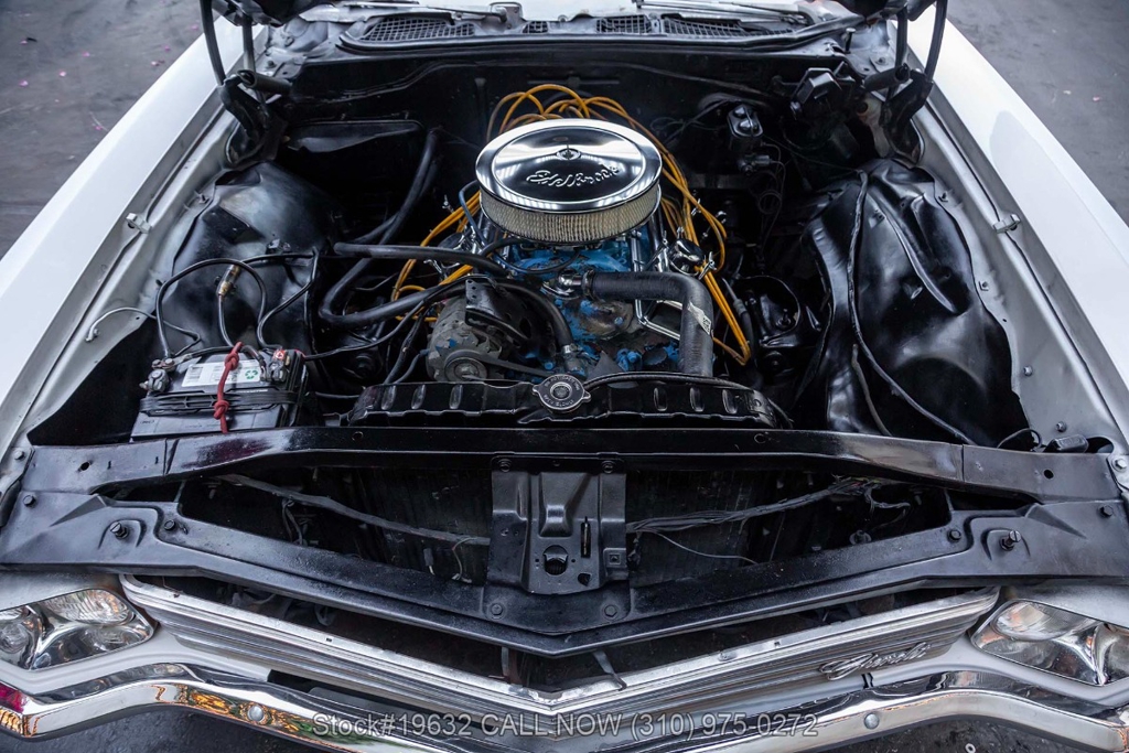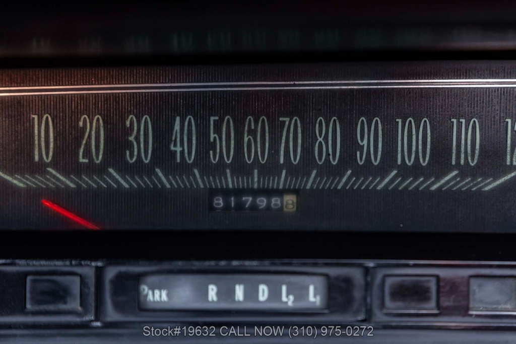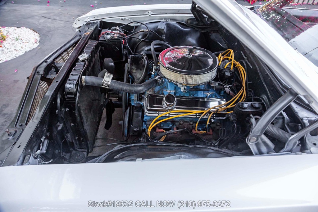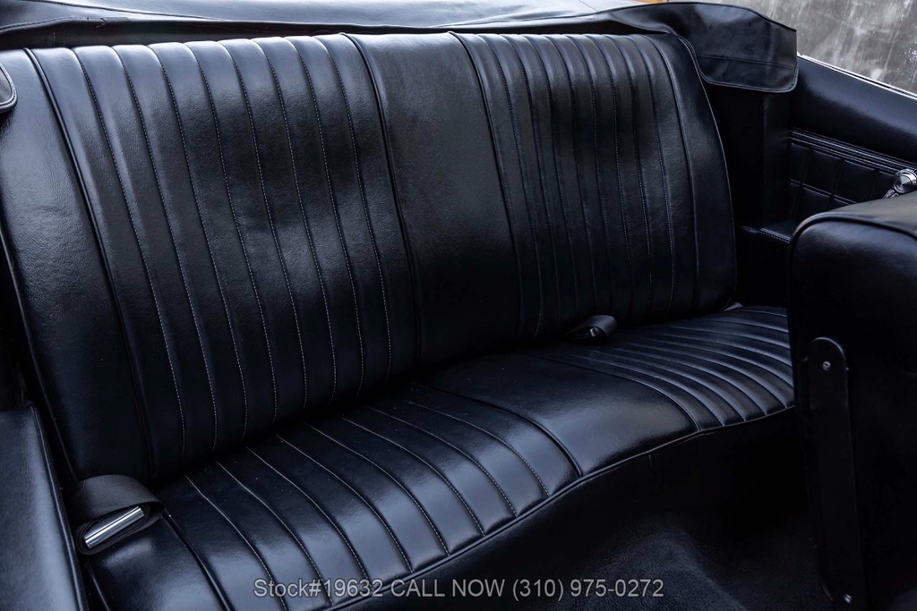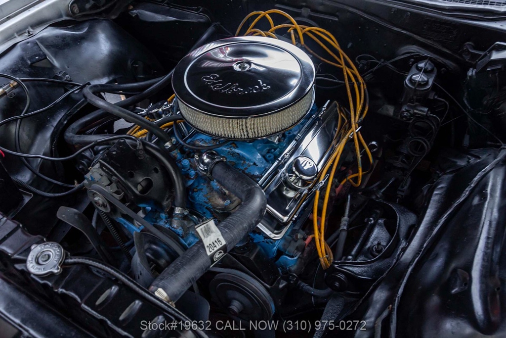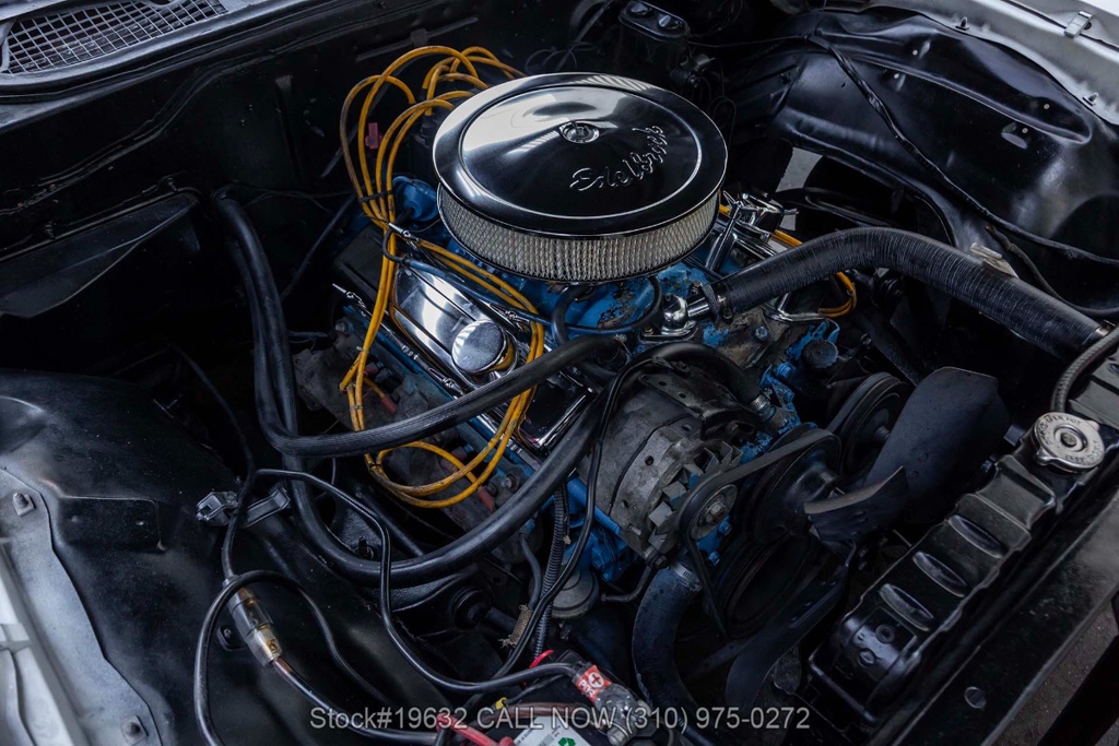 Power comes from a V8 engine paired with an automatic transmission. Equipped with a 4-barrel carburetor, power steering, dual exhaust, and drum brakes on all four corners. Exterior details include quad headlights, chrome bumpers, thin whitewall tires, and 13-inch wire wheels, along with a black soft top and matching boot cover. Inside, the cabin features bench seating with lap belts, manual windows, a glove box, a two-spoke steering wheel, and a retro-style radio, keeping things simple and period-correct.
