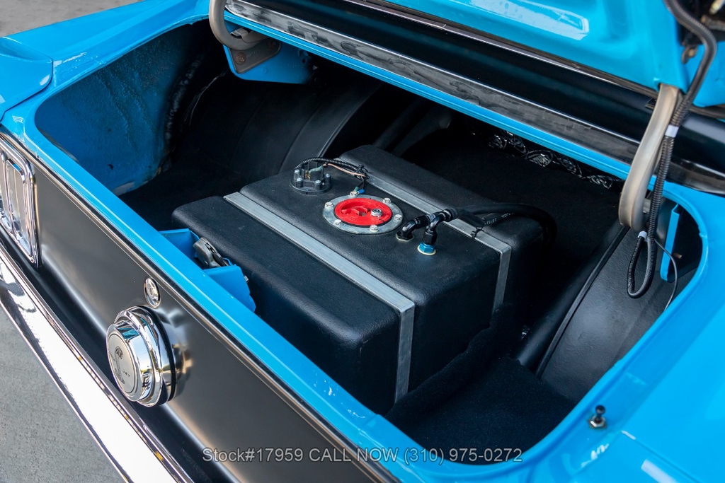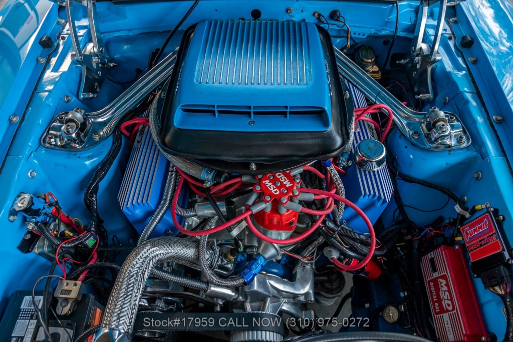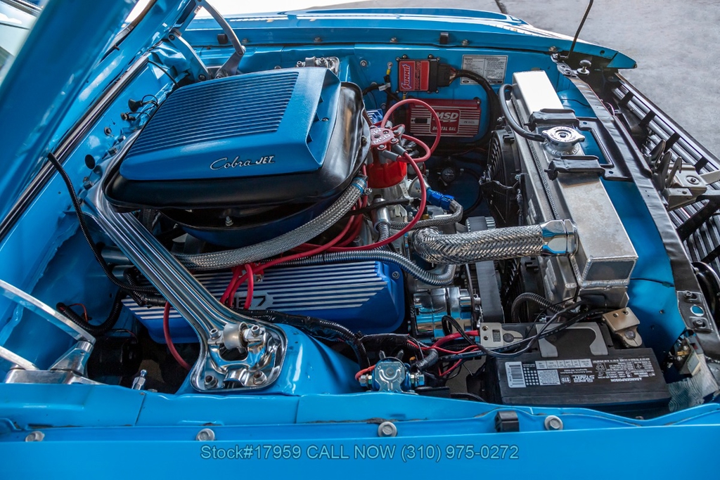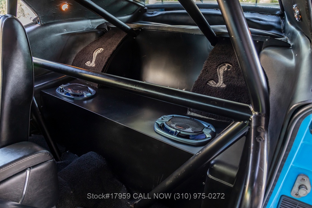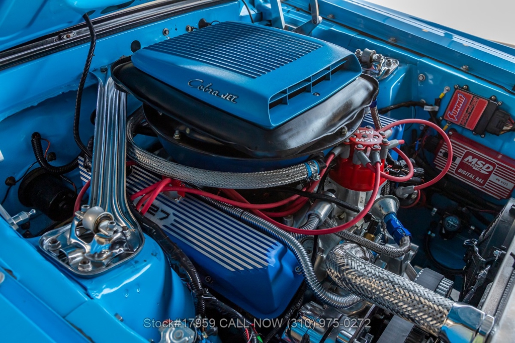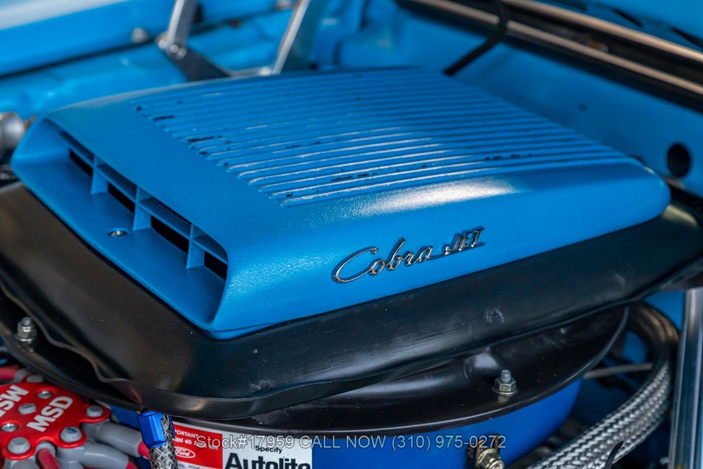 Matching its aggressive stance, under the hood you will find a potent 390 V8 Engine, Toploader 4-speed manual transmission, Summit Max EFI 500 V2 Throttle Body Injection System, four-wheel disc brakes, Cobra Jet hood scoop, rear spoiler, rear window louvers, 3-spoke steering wheel, Hurst shifter, Autometer instrumentation, chrome bumpers, rear Mickey Thompson tires, and 15-inch Centerline chrome wheels. Step inside the cabin, and you'll find a sleek Black Rhino interior with bucket seating, dual rearview mirrors, and a RetroSound radio with Gravity amplifiers perfect for long drives or cruising around town. Featured amenities include power-crank windows, sun visors, custom neon dash lighting, center console and glove compartment.