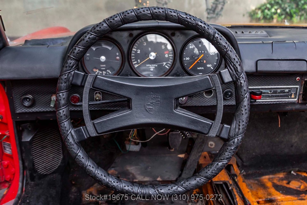This classic 914 features front-wheel disc brakes and retractable headlights that define its iconic 1970s styling. Inside, the cockpit is simple and driver-focused, with VDO instrumentation, twin bucket seats, a 4-spoke steering wheel, Panasonic radio, and a removable Targa top. Every detail reflects Porsche's commitment to practical, engaging driving experiences of the era.